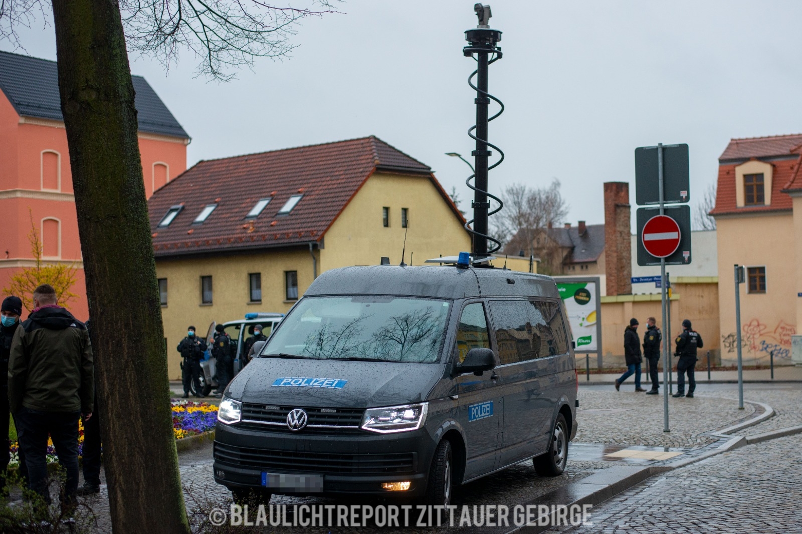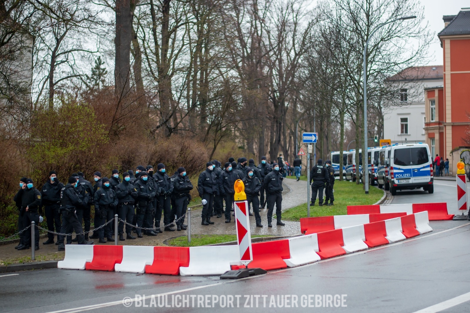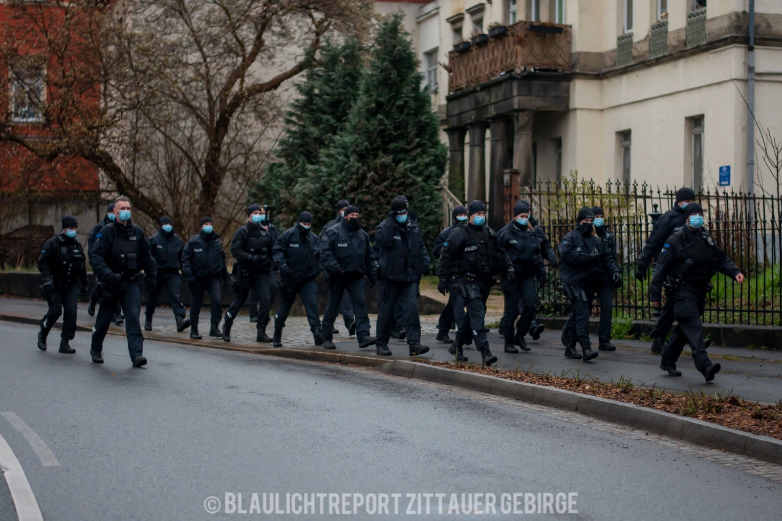 Zur Gewährleistung der Versammlungsfreiheit sowie zur Durchsetzung der Corona-Schutz-Verordnung befanden sich wieder zahlreiche Polizisten der Bereitschaftspolizei Sachsen, des mobilen Einsatzzuges der Polizeidirektion Görlitz und des Polizeireviers Zittau im Einsatz.