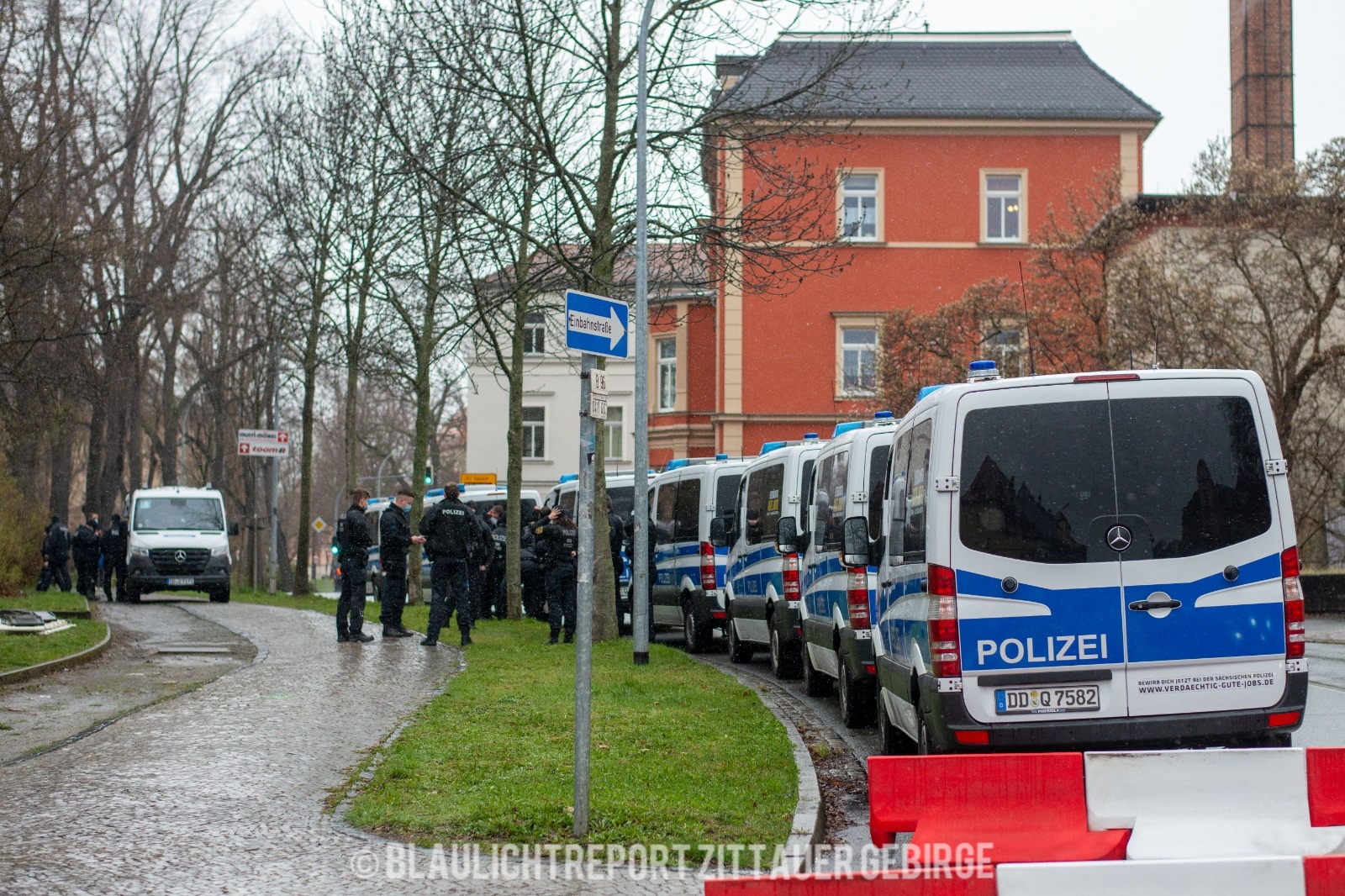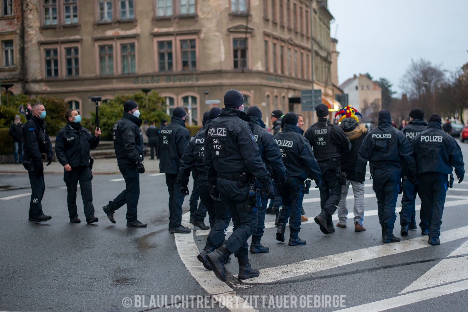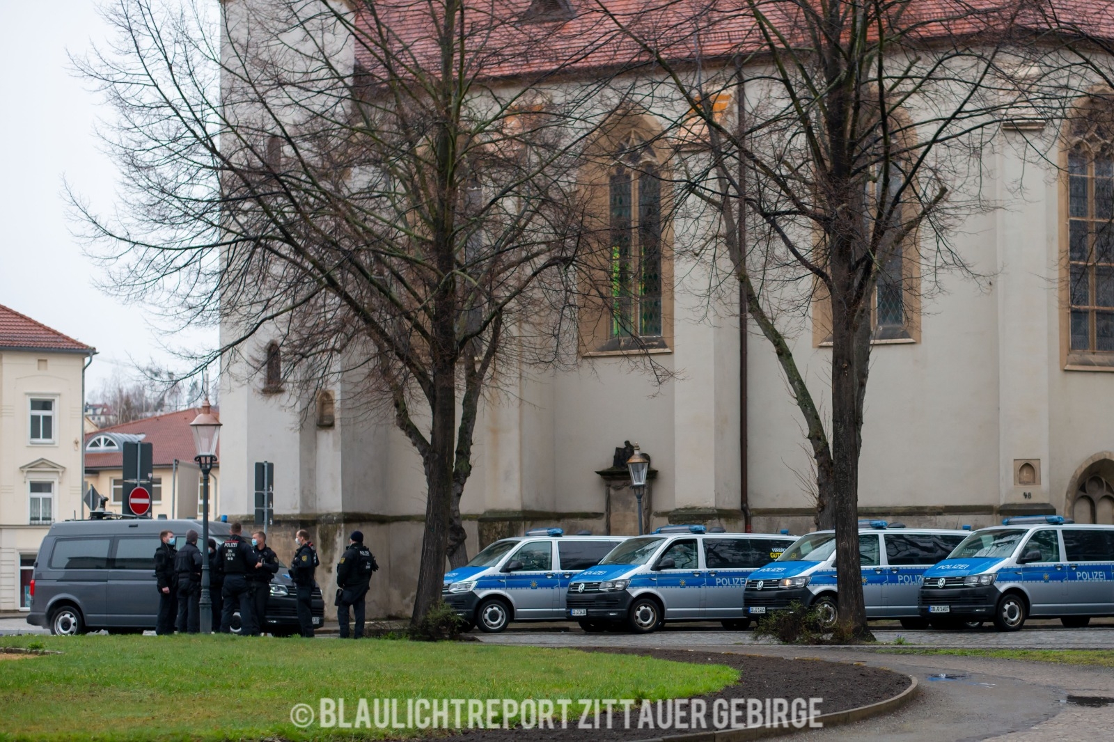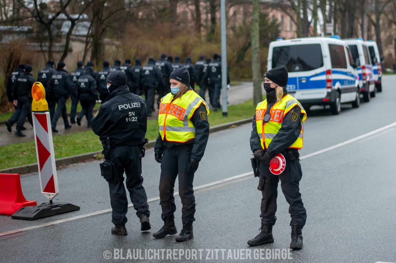 Zur Gewährleistung der Versammlungsfreiheit sowie zur Durchsetzung der Corona-Schutz-Verordnung befanden sich wieder zahlreiche Polizisten der Bereitschaftspolizei Sachsen, des mobilen Einsatzzuges der Polizeidirektion Görlitz und des Polizeireviers Zittau im Einsatz.