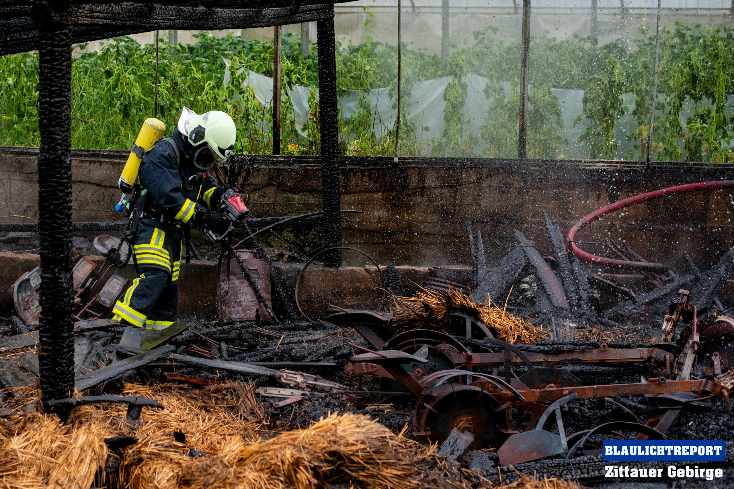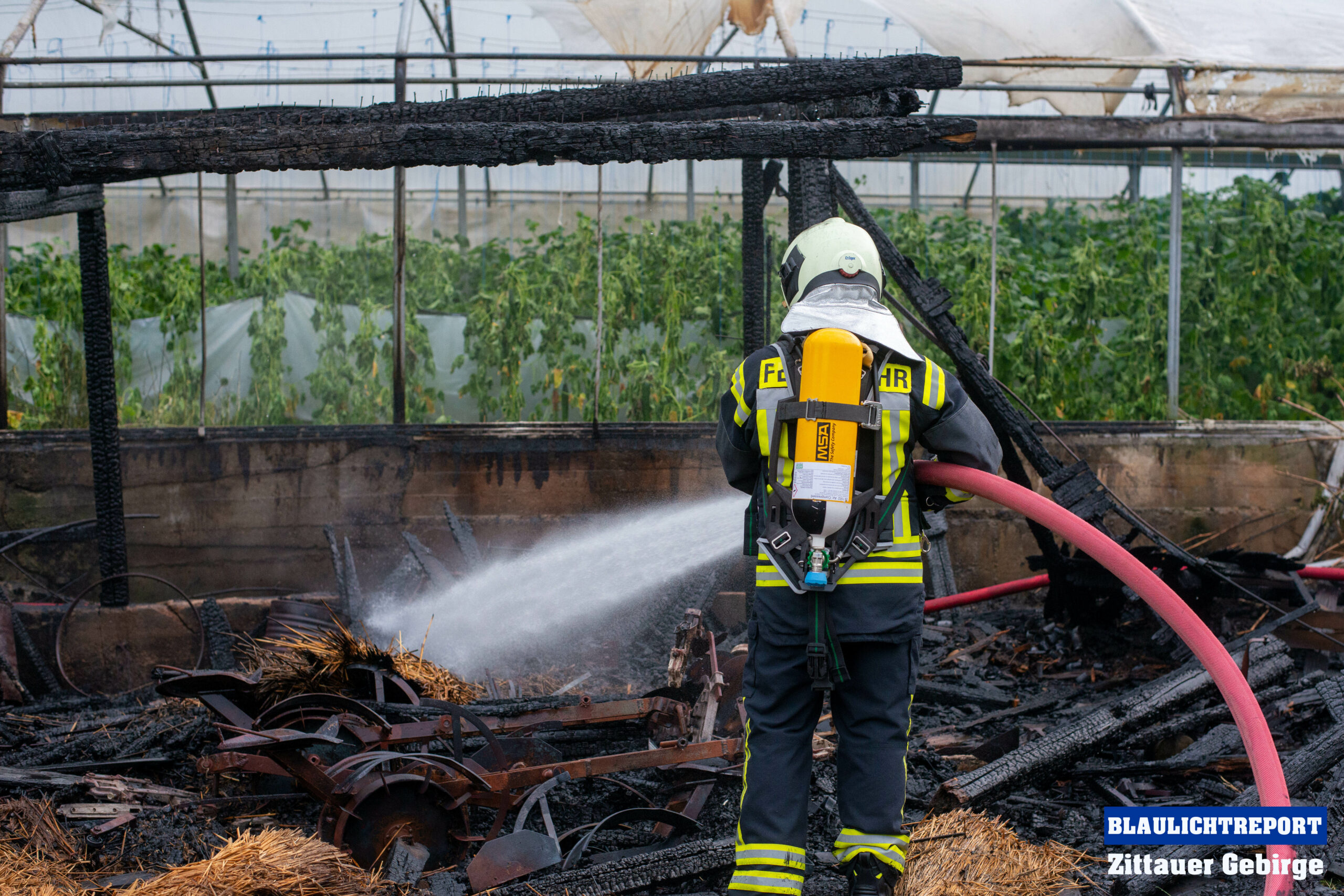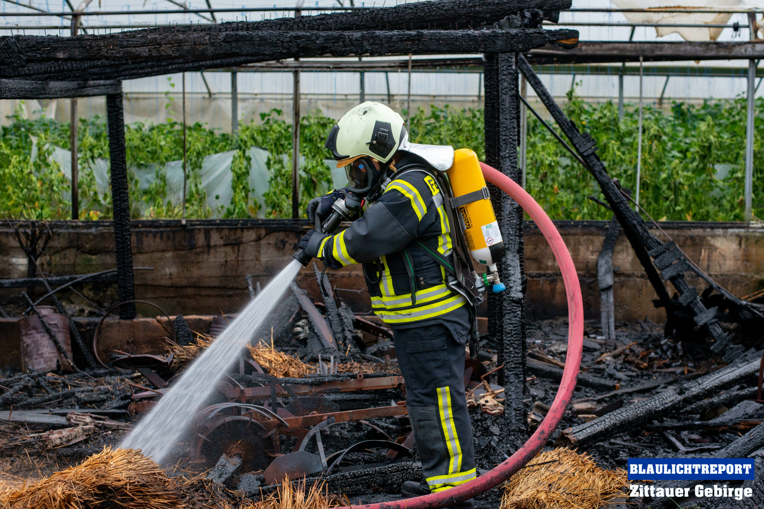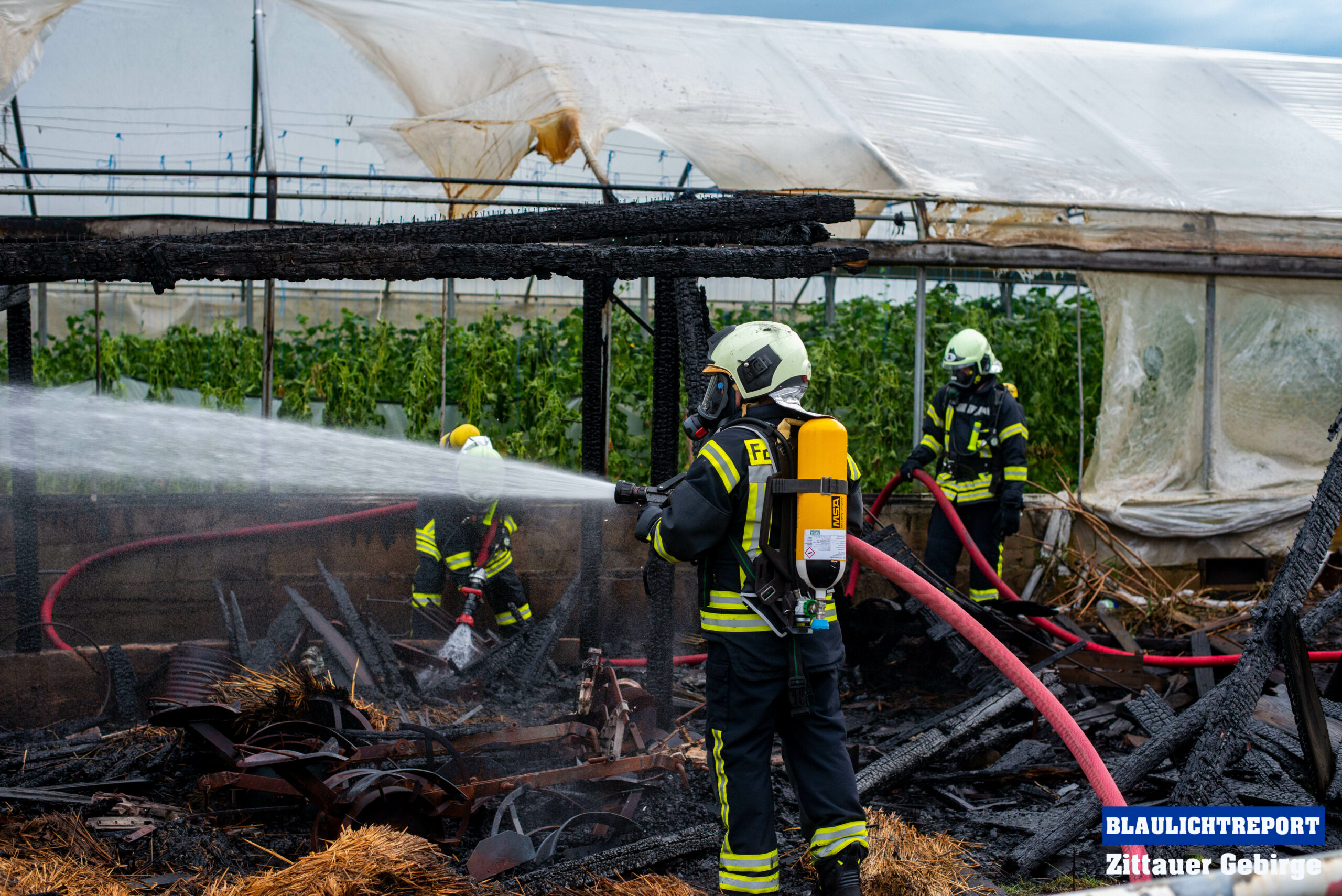 Am Dienstagabend wurde die Feuerwehr Zittau zu einem Schuppenbrand an der Zittauer Schrammstraße alarmiert. Beim Eintreffen der ersten Einsatzkräfte hat sich die Lage bestätigt. Ein Schuppen, der an ein Gewächshaus der Gärtnerei angrenzte, stand in Vollbrand. Unter schweren Atemschutz begannen die hauptamtlichen Kräfte die Löscharbeiten. Wenig später trafen weitere Kräfte der Abteilung 1 (Innenstadt) ein und unterstützten beim Einsatz. Unter anderem galt es die Einsatzstelle abzusichern und eine stabile Wasserversorgung aufzubauen. Als Löschwasserentnahmestelle diente ein nahegelegener Unterflurhydrant. Nach dem die Flammen gelöscht waren, galt es das Gestell mittels Einreißhaken und Kettensäge einzureißen und im Anschluss mit Schaum zu bedecken. So konnte man sichergehen, dass das Feuer auf Grund der enormen Brandlast (Stroh und Holz) nicht erneut aufflammen kann.