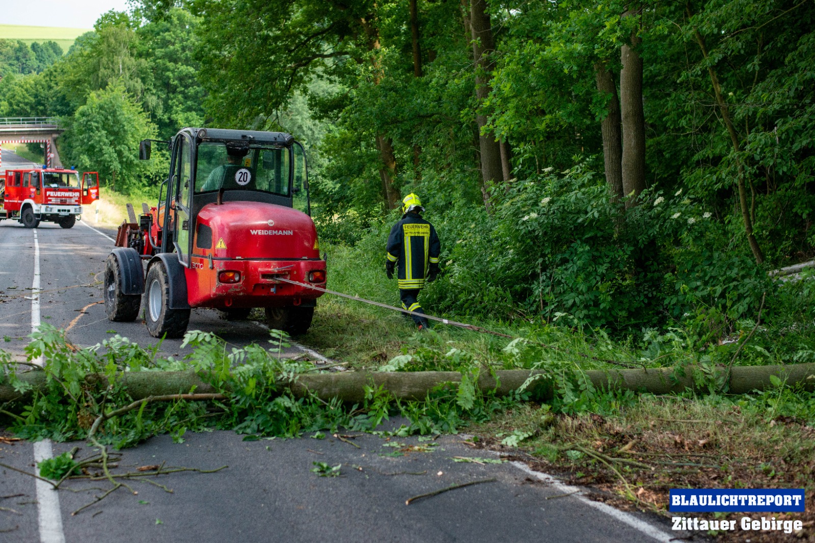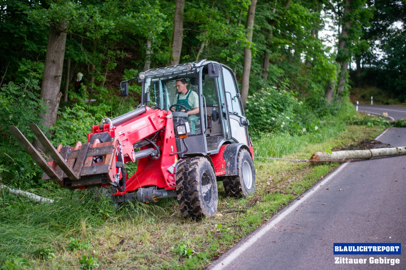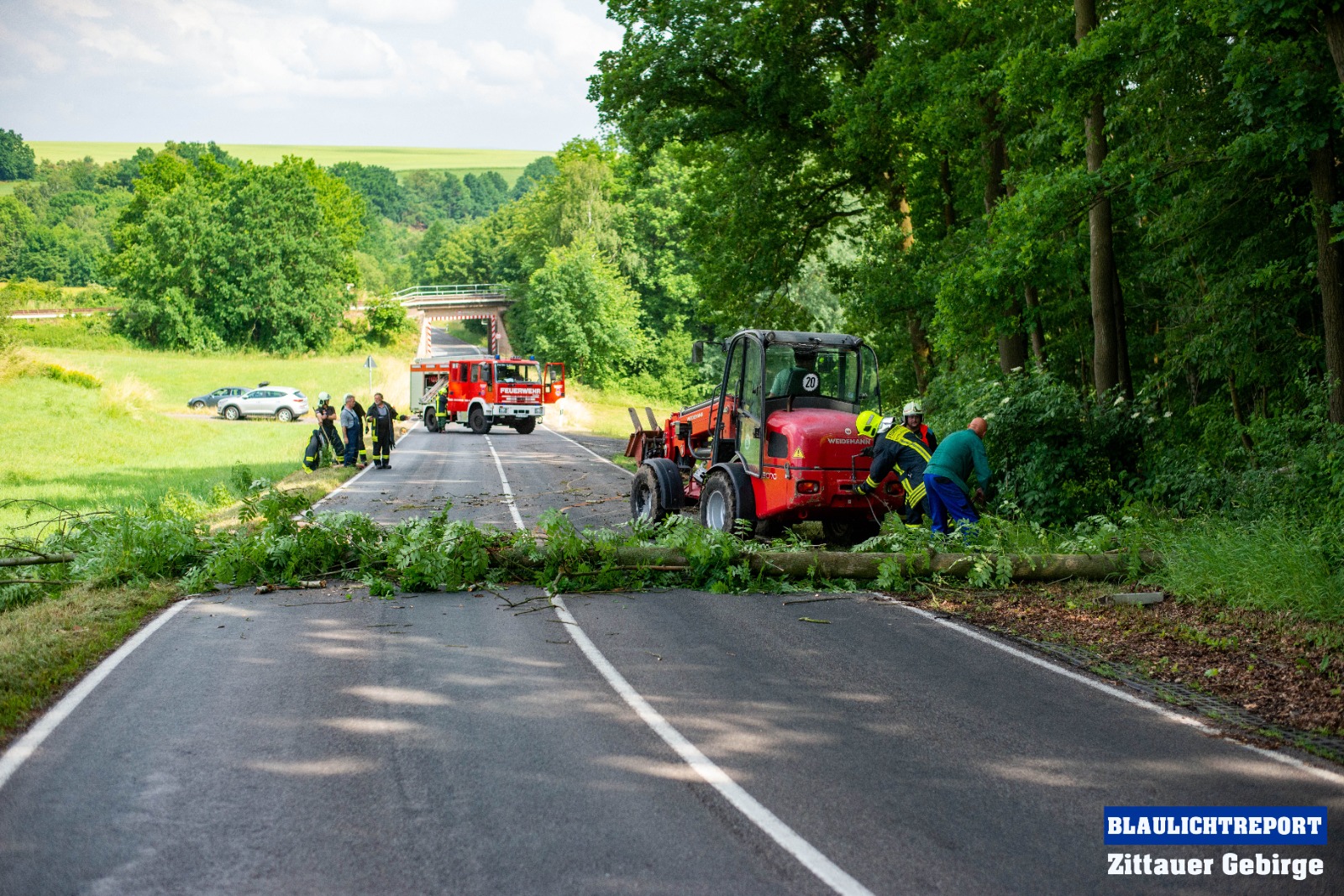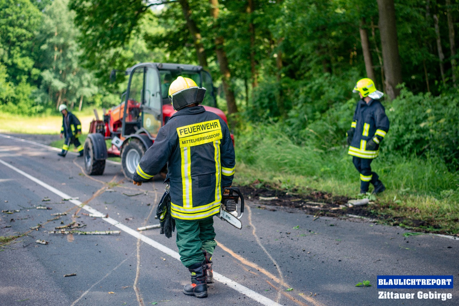 Kurz nach 15 Uhr alarmierte die integrierte Rettungsleitstelle Hoyerswerda die Feuerwehr Mittelherwigsdorf zu einer technischen Hilfeleistung an die Spitzkunnersdorfer Straße. Waldarbeiter meldeten, das ein etwa 15 Meter hoher Baum auf die Straße zu kippen drohte. Nachdem die ersten Einsatzkräfte an der Einsatzstelle eingetroffen waren, wurde die Straße nach einer ersten Lageerkundung voll gesperrt. Es bestand Gefahr im Verzug. Nicht nur ein Baum drohte auf die Fahrbahn zu kippen. Mittels Kettensägen wurden die Bäume gefällt und im Anschluss mit einem Radlader von der Straße geräumt. Als die Kameraden soweit fertig waren, wurde die Straße gereinigt und die Einsatzbereitschaft wieder hergestellt.