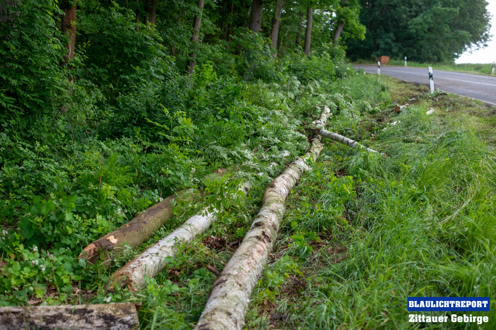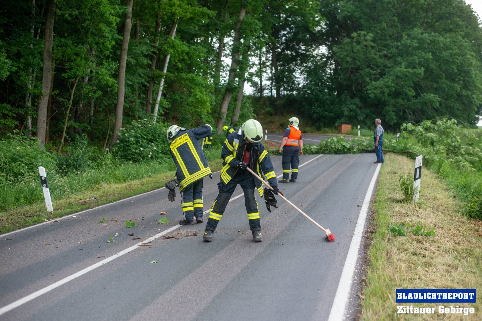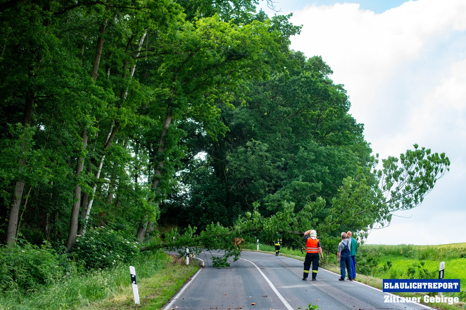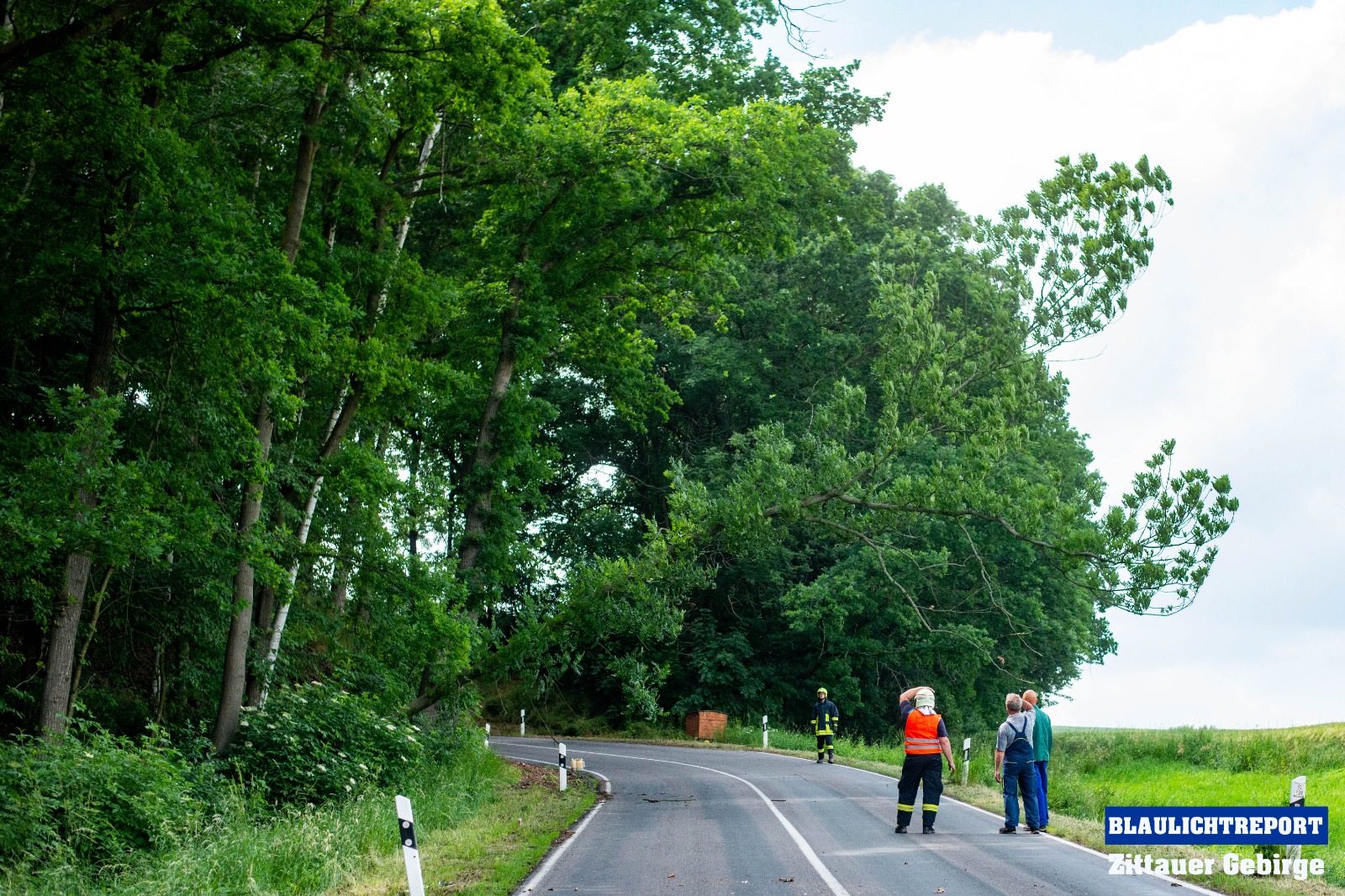 Kurz nach 15 Uhr alarmierte die integrierte Rettungsleitstelle Hoyerswerda die Feuerwehr Mittelherwigsdorf zu einer technischen Hilfeleistung an die Spitzkunnersdorfer Straße. Waldarbeiter meldeten, das ein etwa 15 Meter hoher Baum auf die Straße zu kippen drohte. Nachdem die ersten Einsatzkräfte an der Einsatzstelle eingetroffen waren, wurde die Straße nach einer ersten Lageerkundung voll gesperrt. Es bestand Gefahr im Verzug. Nicht nur ein Baum drohte auf die Fahrbahn zu kippen. Mittels Kettensägen wurden die Bäume gefällt und im Anschluss mit einem Radlader von der Straße geräumt. Als die Kameraden soweit fertig waren, wurde die Straße gereinigt und die Einsatzbereitschaft wieder hergestellt.
