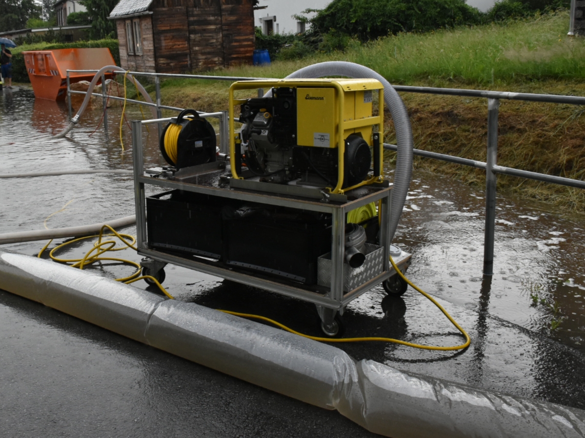 Mit einem Wassergefüllten Endlosschlauch schützen die Kameraden kurzerhand ein Einfamilienhaus vor einem Wasserschaden. Als die Sicherung gegeben war, pumpten die Kameraden das Wasser aus dem Graben und von der Straße in das benachbarte Landwasser.