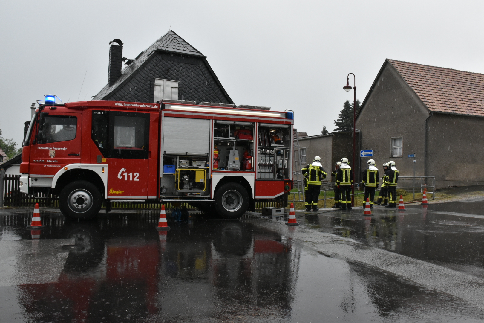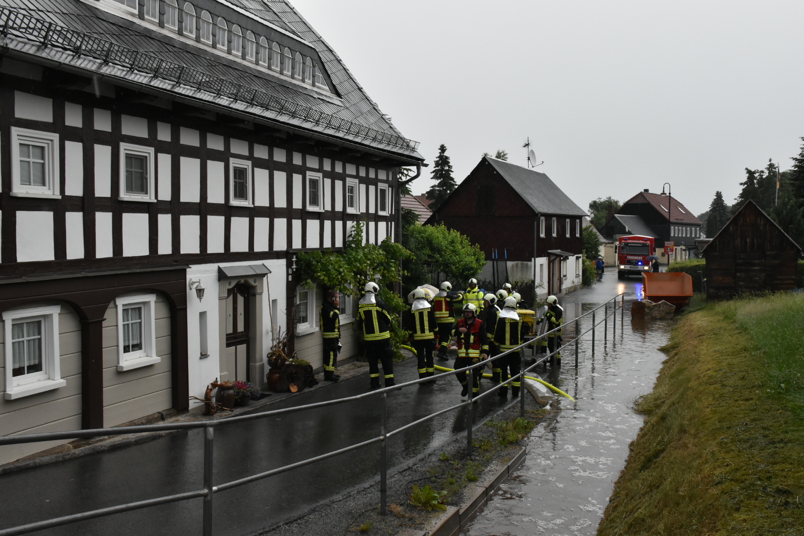 Am Samstagnachmittag setzte kurzerhand Starkregen ein, der die Feuerwehr nicht lange auf Einsätze warten ließ. Abgerückt von einer gemeinsamen Einsatzübung mit den Feuerwehren aus Leutersdorf und Spitzkunnersdorf stellten die Kameraden auf der Fahrt zum Depot fest, dass die B96 bei Eibau überflutet wurde. Durch die Leitstelle Ostsachsen ließen die Kameraden die Feuerwehr aus Eibau zum Ort des Geschehens alarmieren. Die Oderwitzer selbst wurden zu einer Überschwemmung an den Uferweg gerufen. Dort sorgte eine verstopfte 400er Leitung im Zusammenhang mit den Starkregen dafür, dass der Graben das Wasser nicht mehr abführen konnte, weshalb dieses über die Straße unter Wasser setzte.