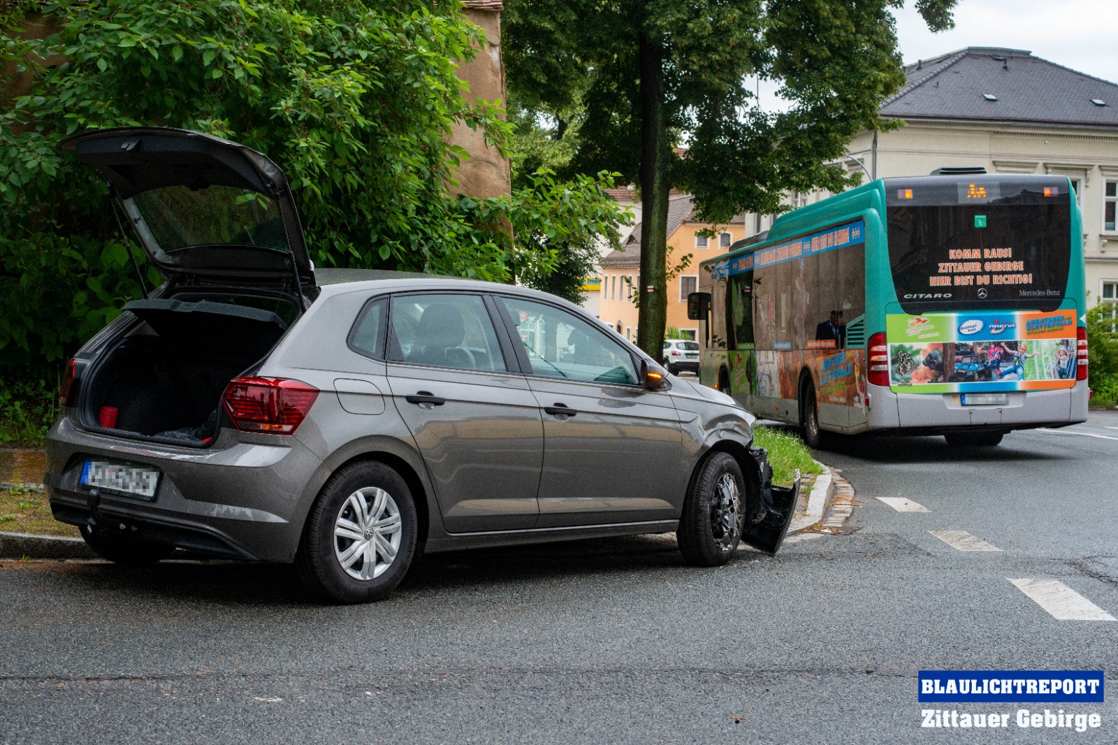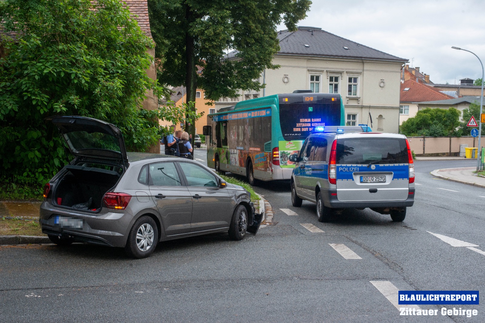 Es war kurz nach 9 Uhr, als ein Volkswagen-Fahrer die Lindenstraße in Richtung Töpferberg (B96) befuhr. Weil er auf die linke Spur der B96 abbiegen wollte, ordnete er sich auf der linken Fahrbahn ein. Zur selben Zeit wollte auch ein mit Kindern besetzter Bus auf den Ring abbiegen und positionierte sich auf der rechten Fahrbahn. Nachdem der Busfahrer erkannte das die Fahrbahn frei war fuhr dieser los. Obwohl er sich auf der rechten Spur einordnete wollte er beim Abbiegen direkt auf die linke Spur auffahren, weshalb er den PKW tuschierte und entsprechend beschädigte.