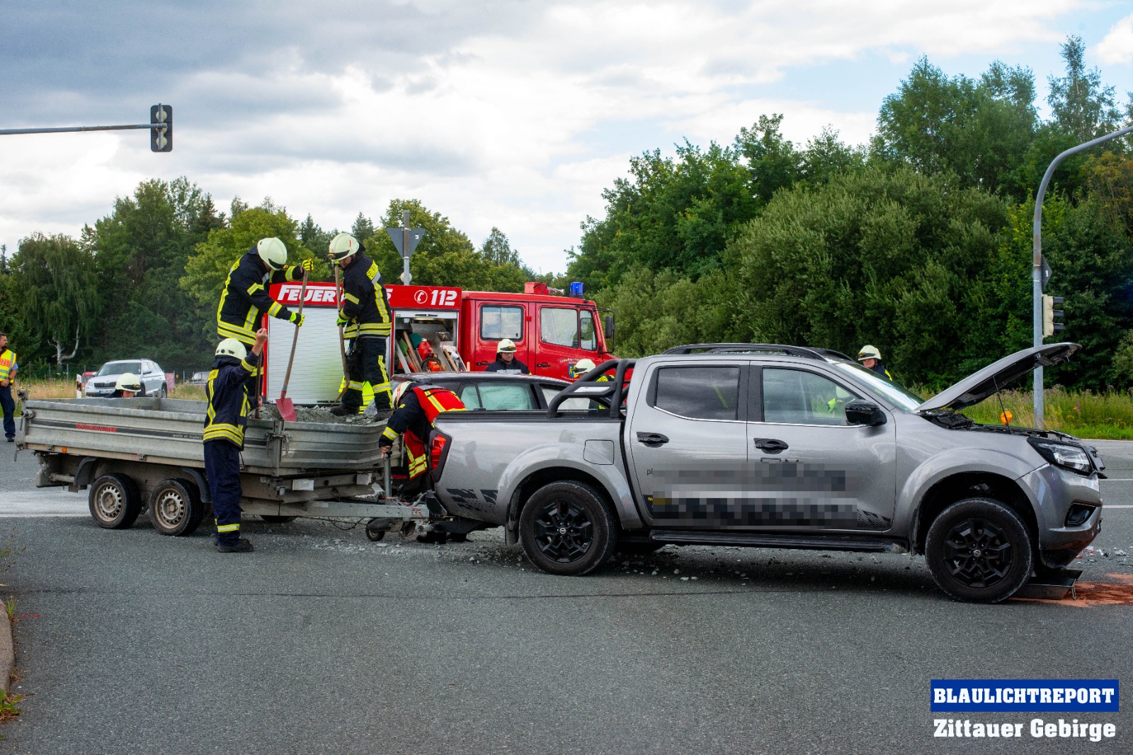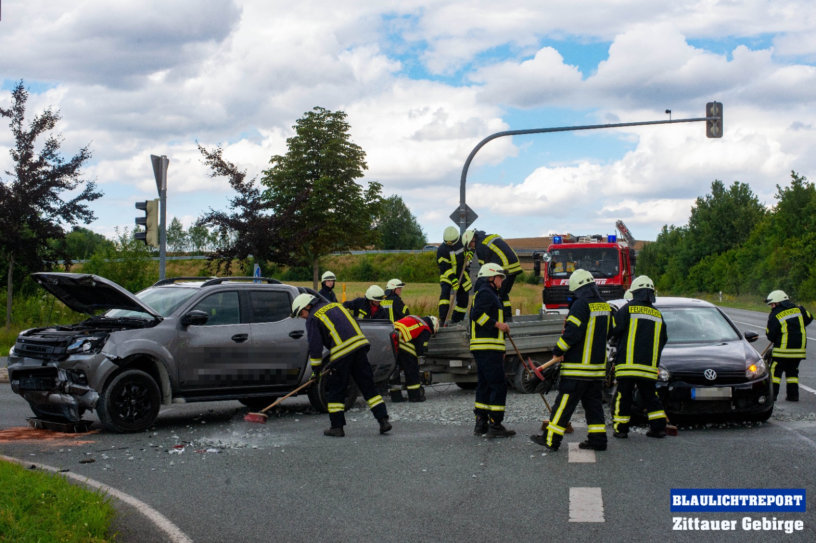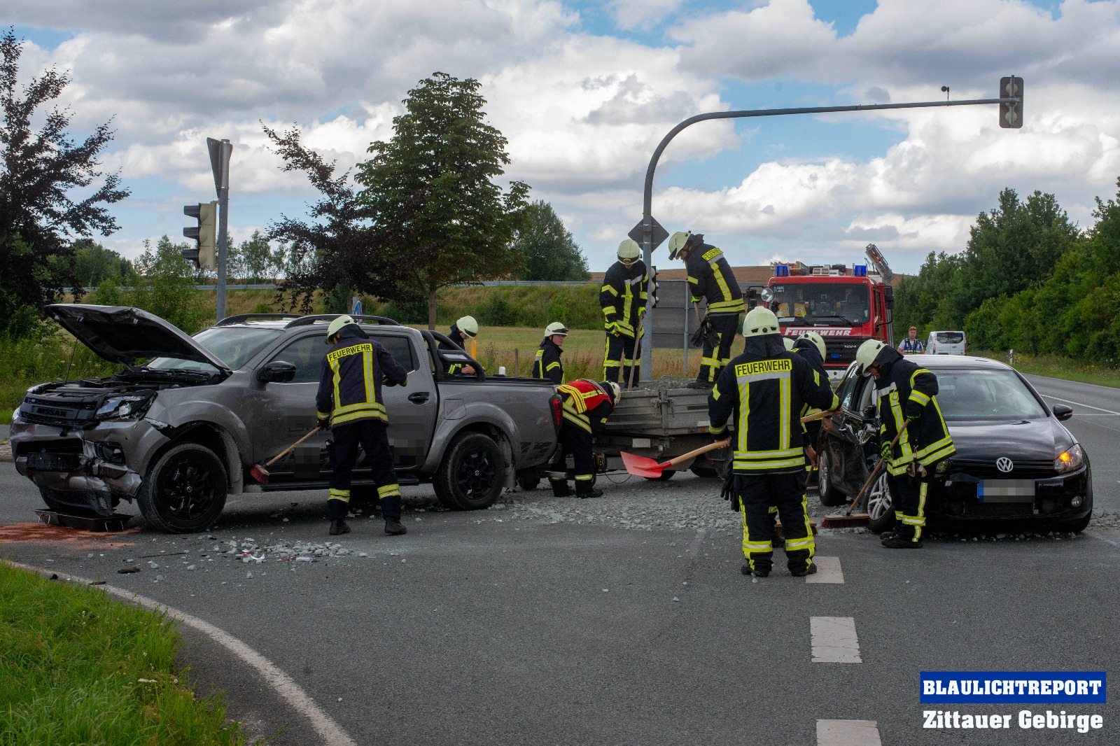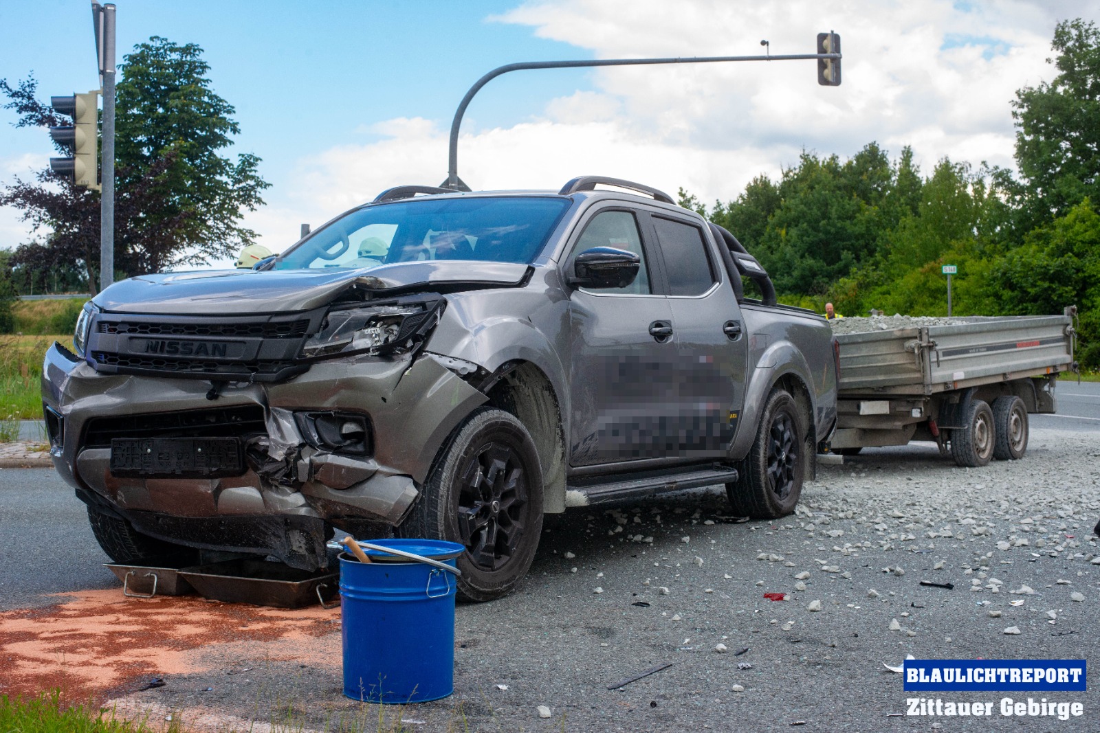 Ersten Erkenntnissen zufolge, befuhr eine 47-Jährige VW-Fahrerin die S142 in Richtung Neugersdorf und wollte die Kamerun-Kreuzung passieren. Offenbar, so die Polizei, übersah sie dabei, dass die Lichtzeichenanlage für ihre Richtung Rot anzeigte und fuhr in die Kreuzung ein. Ein, zur gleichen Zeit auf der S148 fahrender 63-jähriger, Nissan-Fahrer, mit einem mit Mineralgemisch beladenen Anhänger, konnte nicht mehr rechtzeitig reagieren und kollidierte in der Folge mit dem Volkswagen. Durch die Wucht der Kollision wurden beide Fahrzeuge stark beschädigt. Auch die Ladung machte sich selbstständig und flog zum Teil auf die Kreuzung.