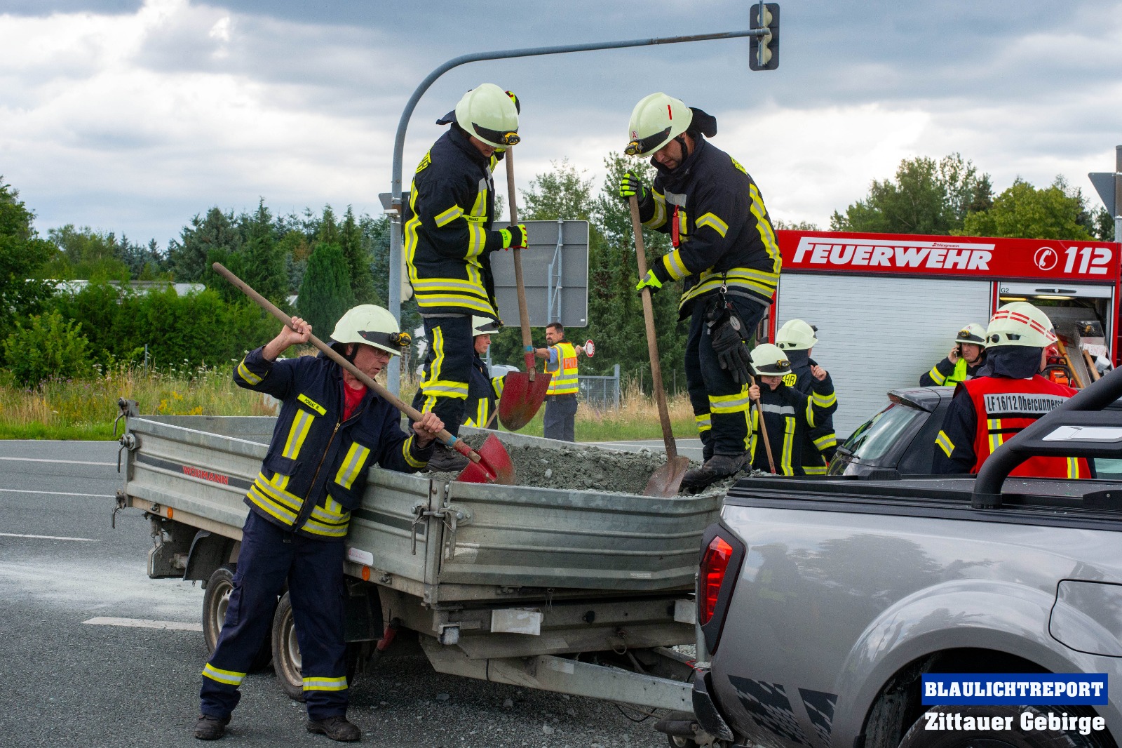 Die Feuerwehr kam zum Einsatz. Die Kameraden sicherten die Unfallstelle, nahmen ausgelaufene Betriebsstoffe auf und stellten den Brandschutz sicher. Im weiteren Verlauf packten die Kameraden mit an und sorgten dafür, dass die vom Anhänger gefallene Ladung wieder auf diesen drauf kommt.