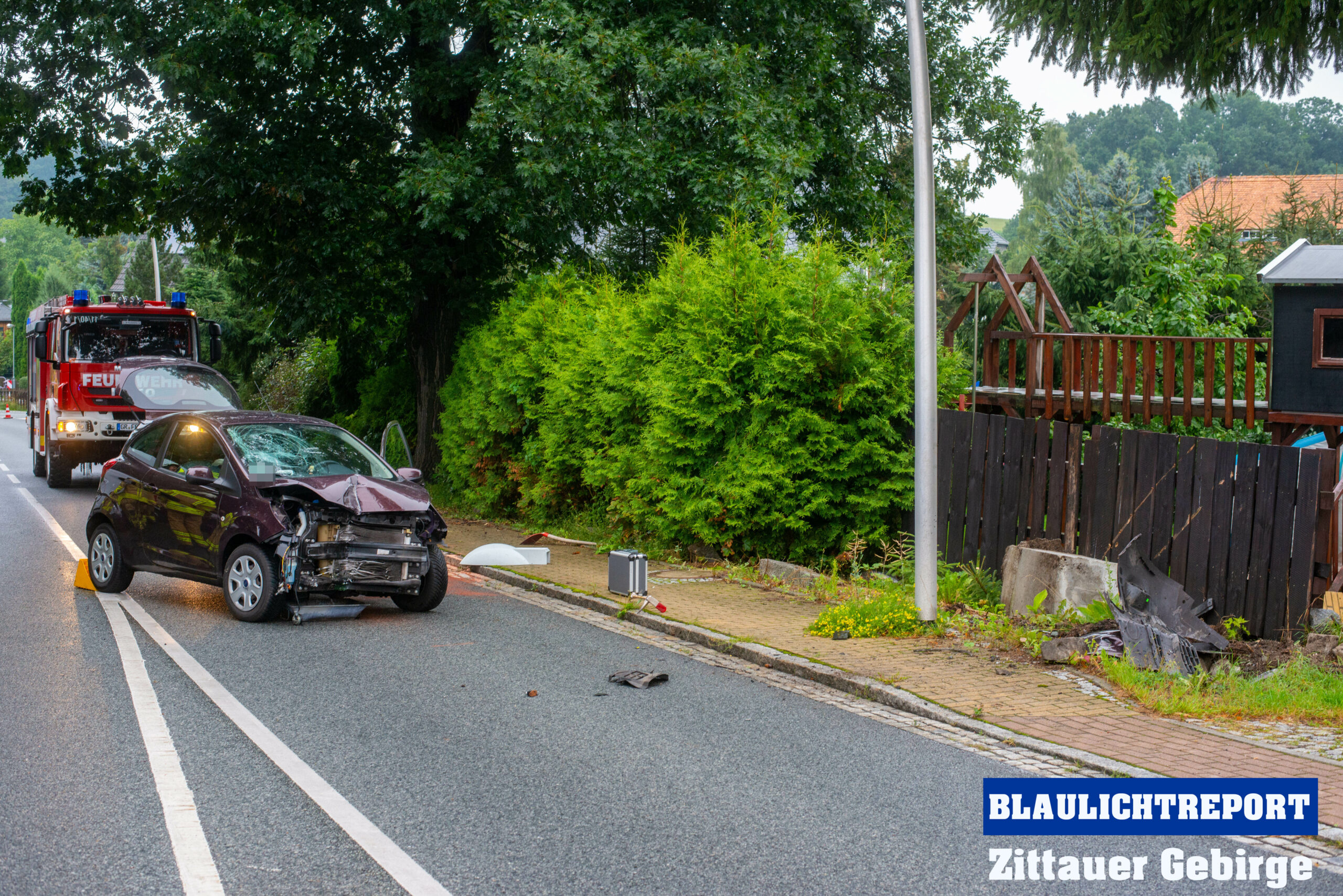 Am Dienstagmorgen fuhr eine 59- jährige mit ihrem Ford gegen eine Zaunsäule und eine Laterne. Wie die Polizei berichtete, befuhr die Fahrerin die Hauptstraße in Richtung Ortsmitte. Aus bislang ungeklärter Ursache verlor die Frau in einer Rechtskurve die Kontrolle über ihre Fahrzeug, krachte gegen eine Betonsäule und letztlich gegen eine Laterne. Glücklicherweise befanden sich zur Zeit des Unfalls keine Fußgänger auf dem Fußweg. Ein Rettungswagen brachte die Frau mit leichten Verletzungen zur Kontrolle in ein Krankenhaus. Die Polizei beziffert den Schaden mit 10.000€.
