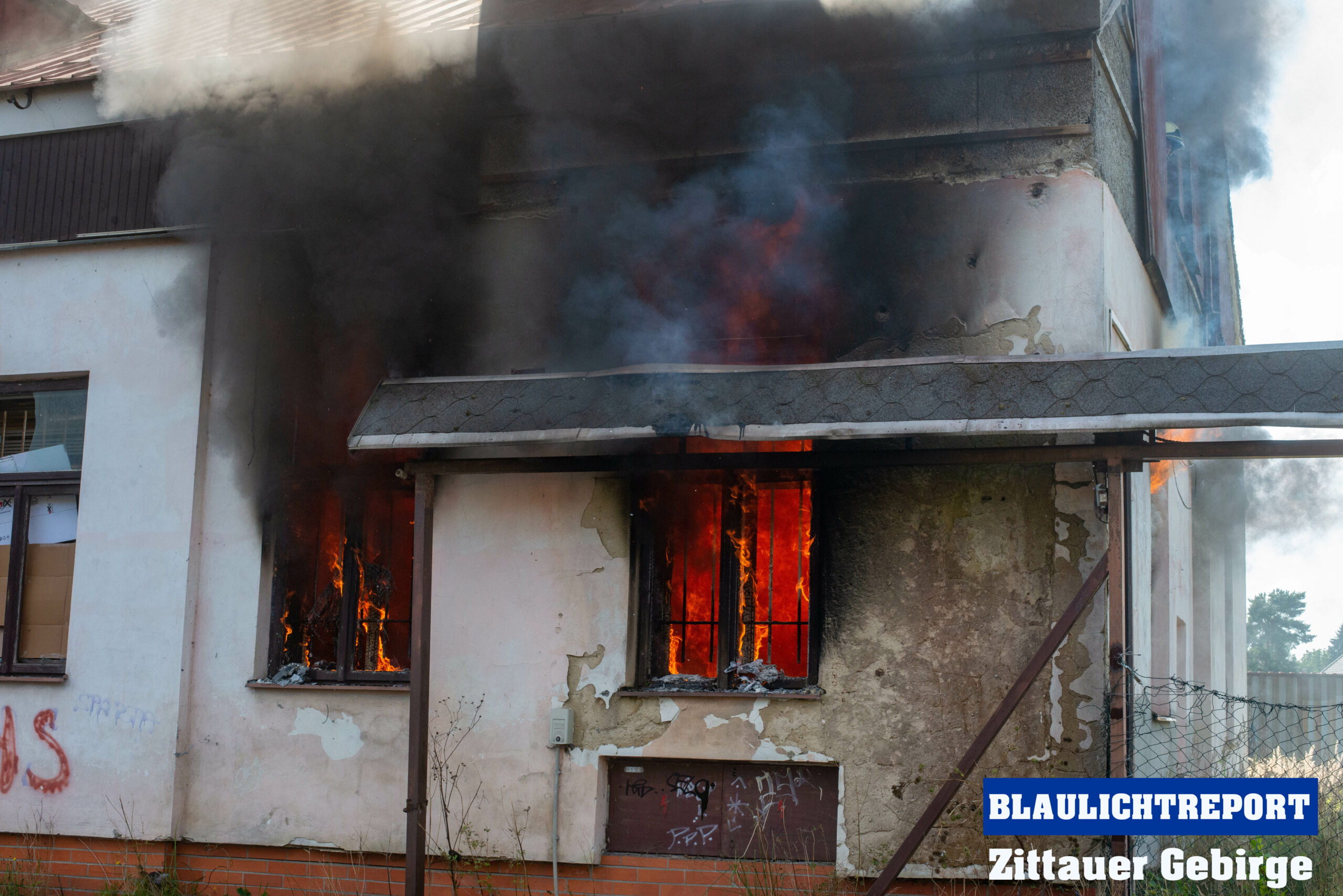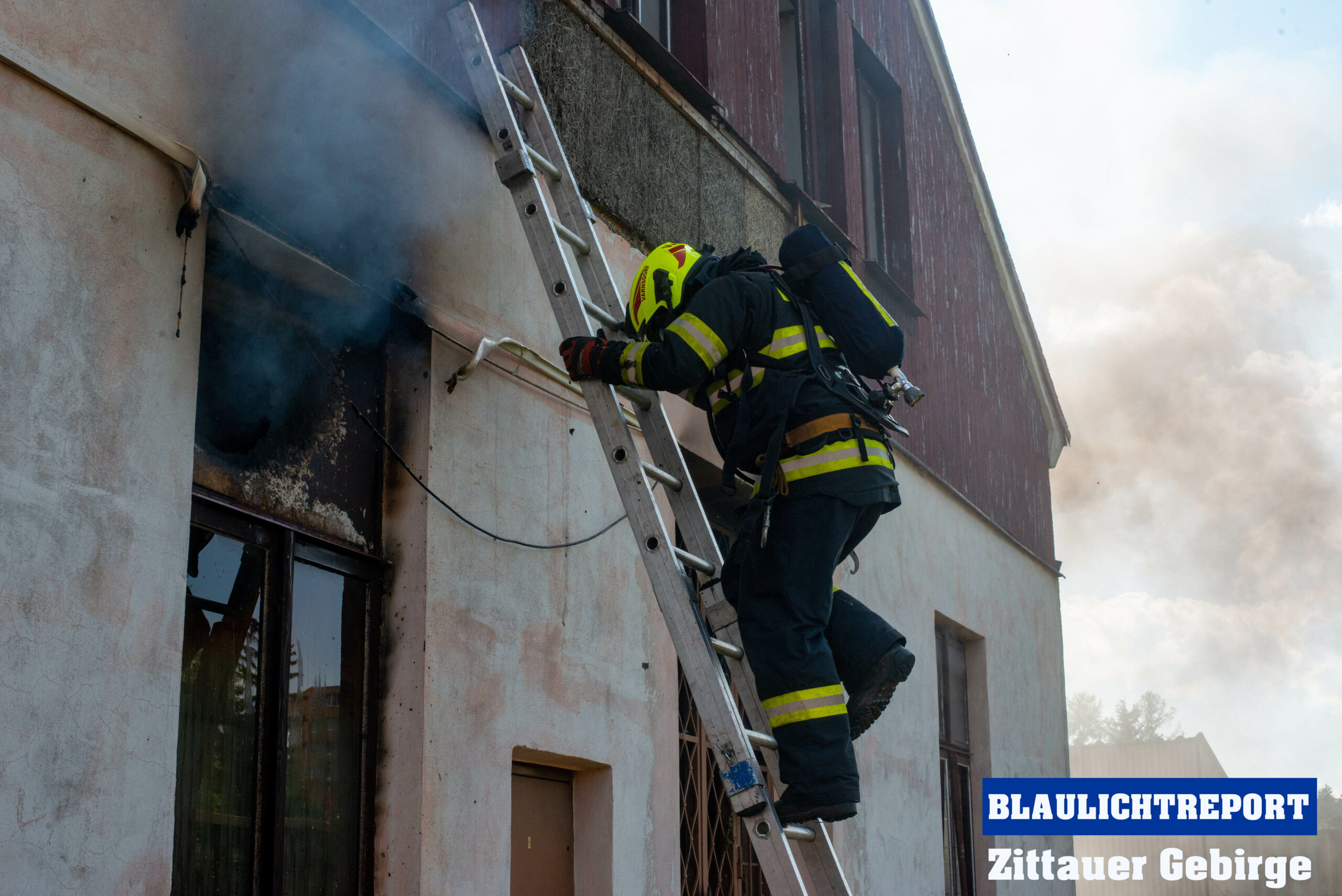 Alarmiert wurden die Feuerwehren aus Großschönau und Varnsdorf zu der realitätsnahen Übung kurz nach 15 Uhr. Als die ersten Kräfte eintrafen, war das gesamte Gebäude völlig verqualmt. Zwei Räume standen in Vollbrand und die Flammen schlugen aus den Fenstern. Aus dem Obergeschoss waren Hilferufe zu hören (Übungsannahme). Sofort begannen mehrere Trupps mit der Menschenrettung – u.a. über Steckleitern. Mehrere Atemschutztrupps durchsuchten parallel das Gebäude nach weiteren Personen. Zwei Personen wurden von den Kameraden aufgefunden und gerettet. Da das vorhandene Löschwasser aus den Fahrzeugen nicht ewig reichen würde, wurde von den Kameraden eine stabile Wasserversorgung aus der etwa 200 Meter entfernten Mandau aufgebaut.