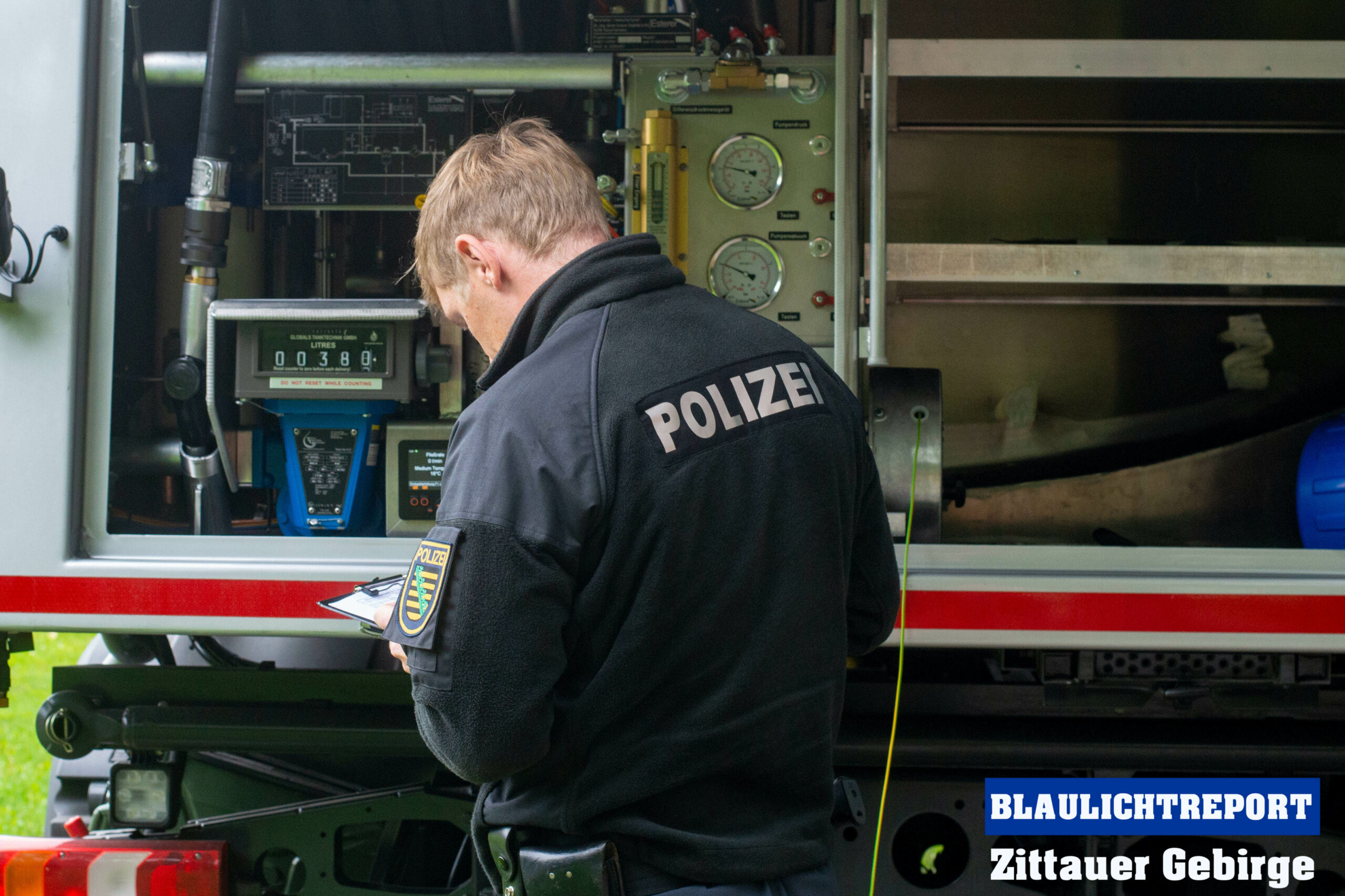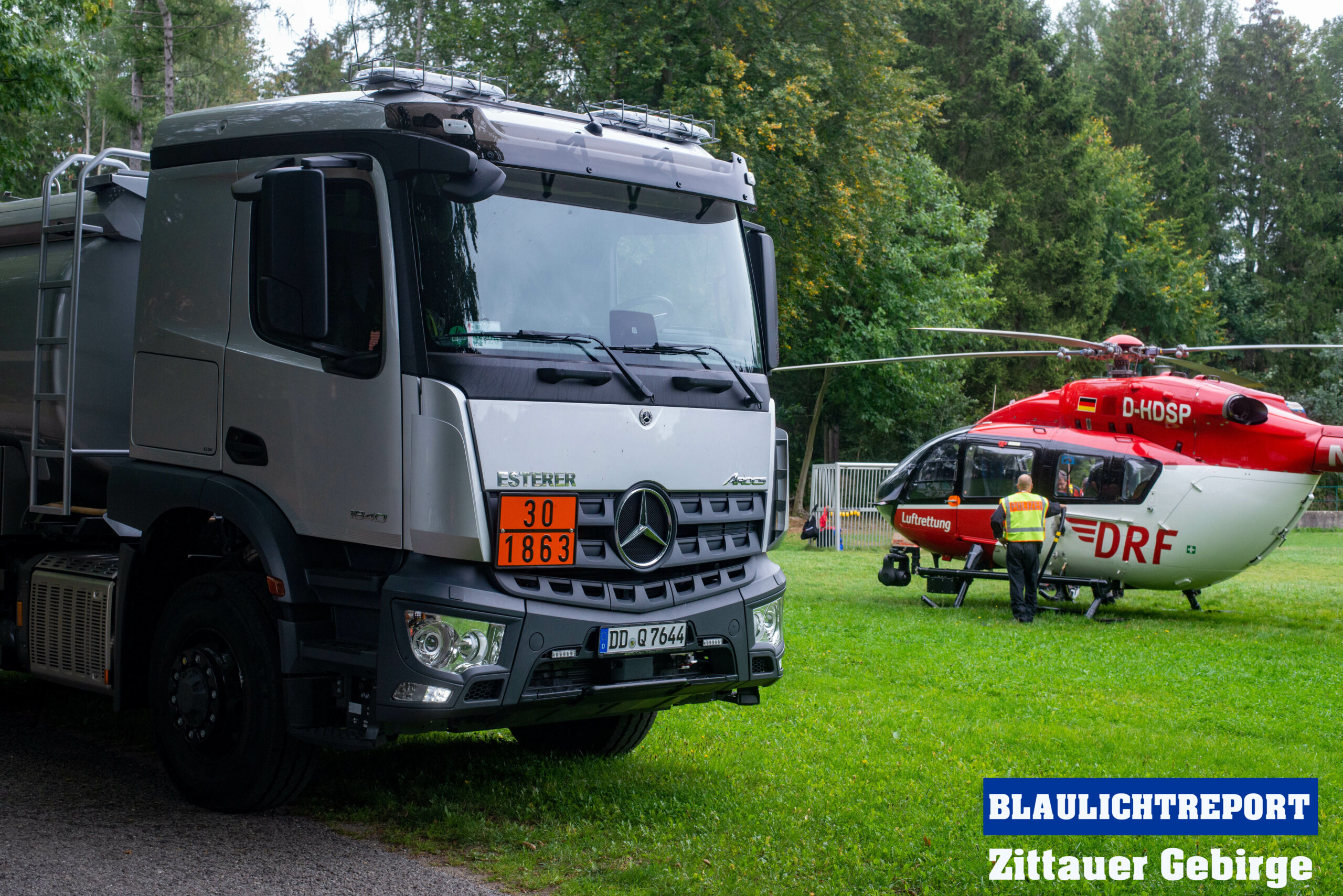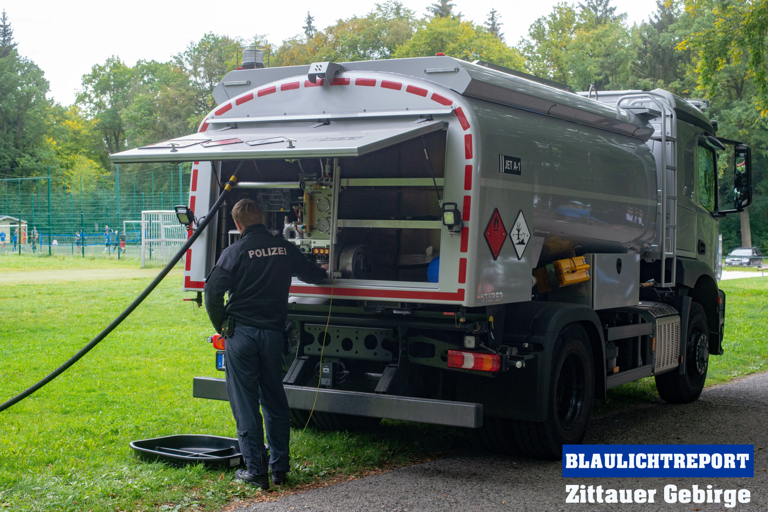 Damit den Rettern der Treibstoff nicht ausging übernahm ein Team der Polizei Dresden mit einem LKW die Betankung der Maschine am Seifhennersdorfer Querxenland.