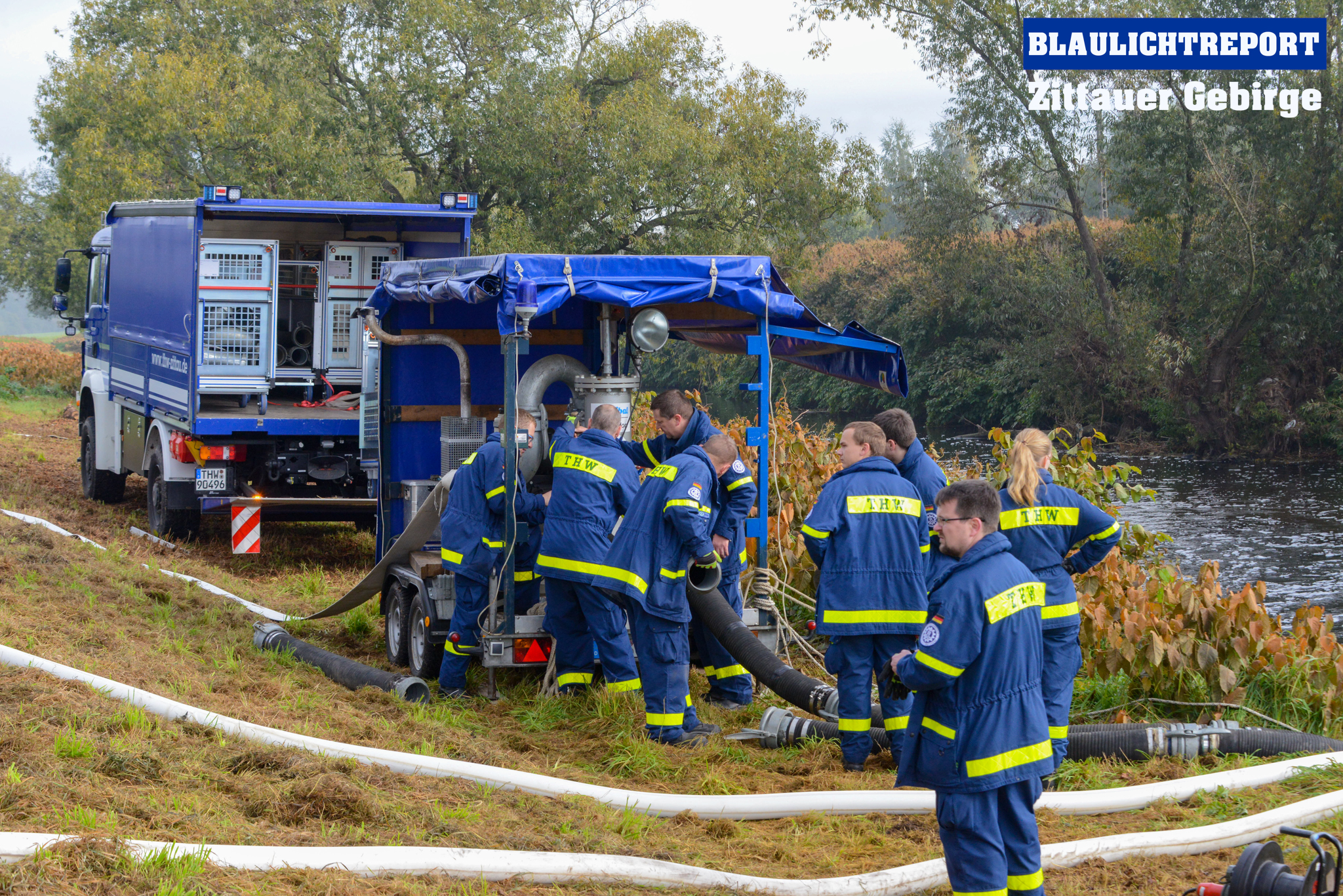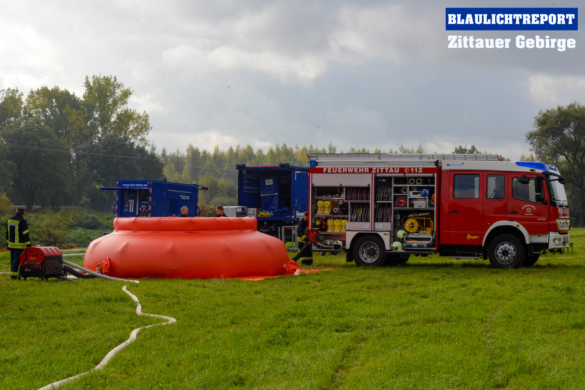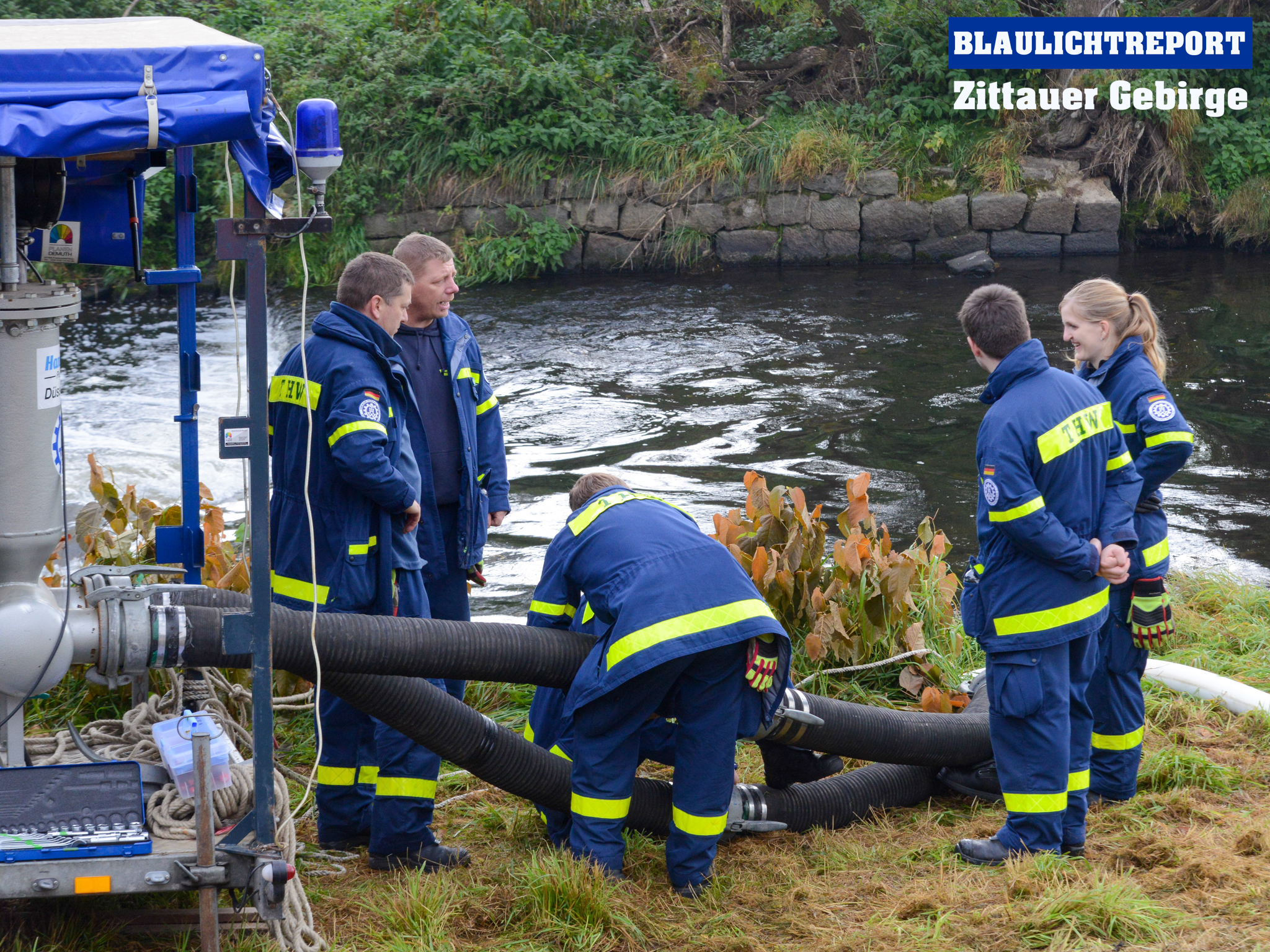 Hier setzte das THW die Pumpe Hannibal (5000L/min) ein und speiste das geförderte Wasser in einen 24m³ Faltbehälter.