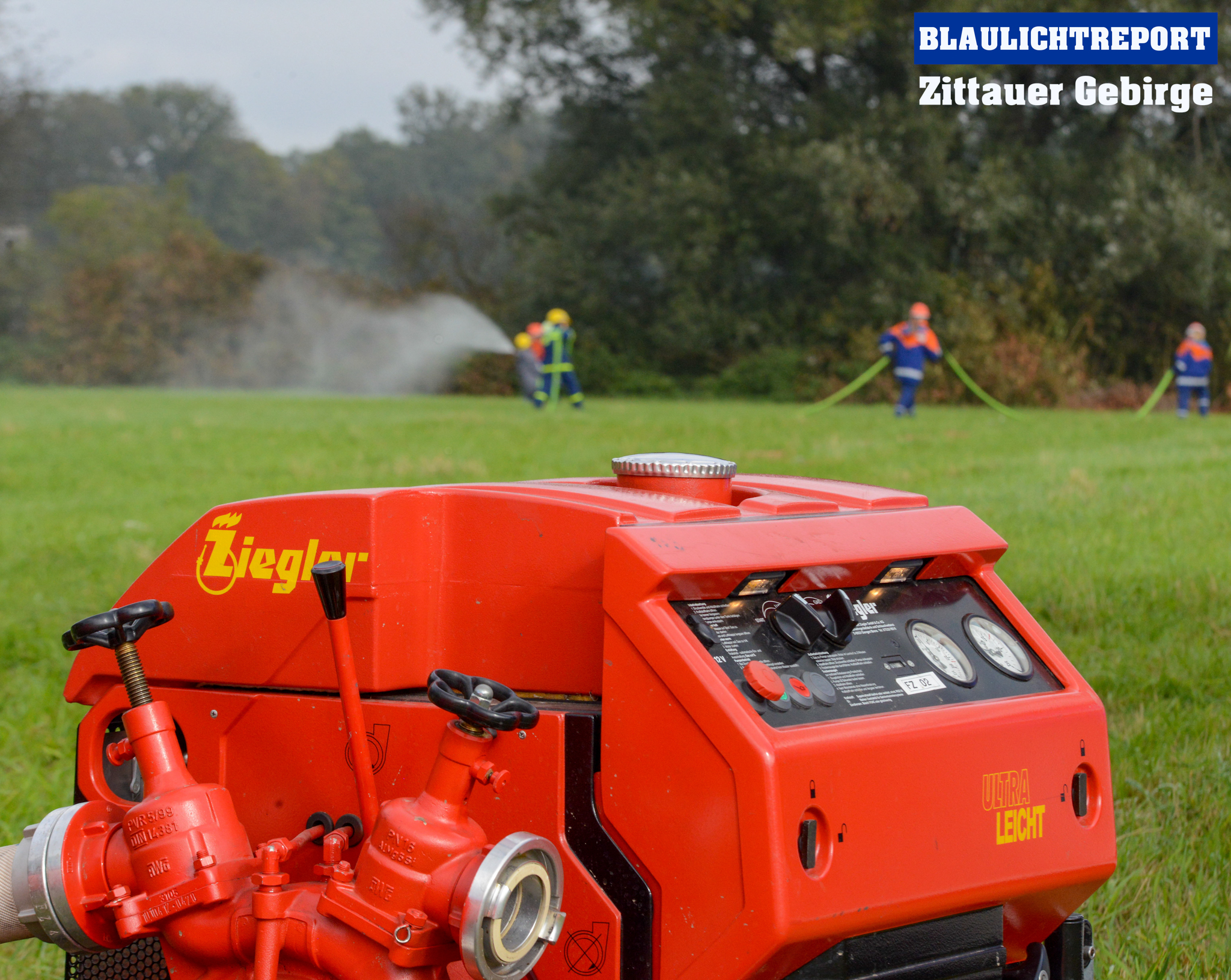 Mit einer tragbaren Pumpe der Feuerwehr (TS8) wurde die Wasserentnahme aus dem  Faltbehälter in Richtung Norden vorgenommen, und mit der Fahrezugpumpe des Löschgruppenfahrzeugs (LF10) in Richtung Süden. Die Pumpen nahmen das gespeicherte Wasser aus dem Behälter auf und gaben es mit mehr Druck, als die Förderpumpe liefert, ab um damit die Strahlrohre zu speisen.