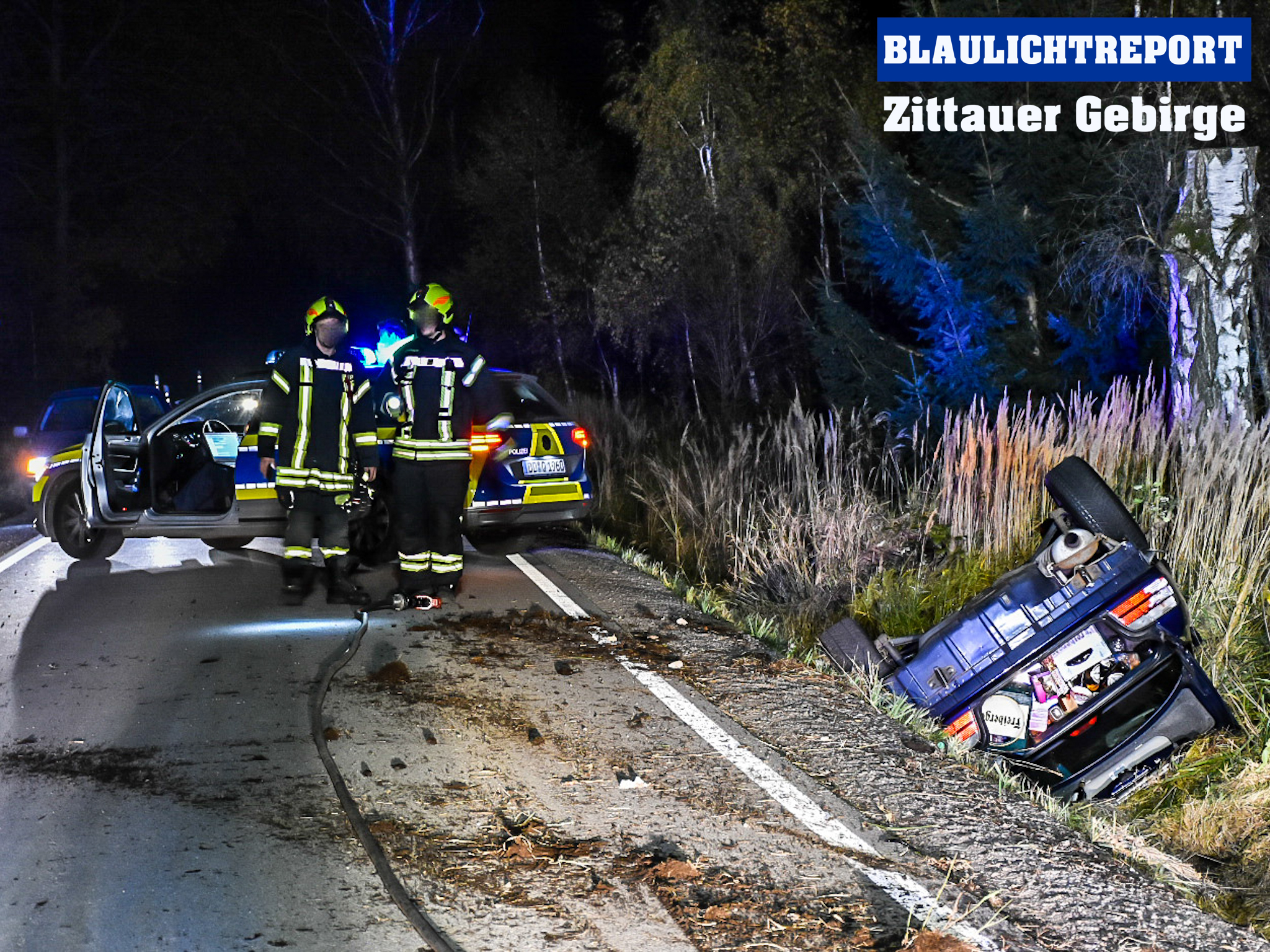 Am Samstagabend kam es zwischen Großhennersdorf und Hirschfelde zu einem Unfall. Die Alarmierung der Einsatzkräfte um 19.37 Uhr klang besorgniserregend. Ein Pkw hatte sich auf der K8631 überschlagen, mehrere verletzte Personen sollte der Unfall zur Folge haben. Einsatzkräfte aus Großhennersdorf, Herrnhut, des Rettungsdienstes und der Polizei machten sich schnellstmöglich auf den Weg zur Unfallstelle. Beim Eintreffen der ersten Einsatzkräfte war die Polizei vor Ort. Die Personen, darunter ein 4- jähriges Kind, waren aus dem Fahrzeug befreit. Offenbar gelang es den Insassen selbst sich aus der Lage zu befreien.