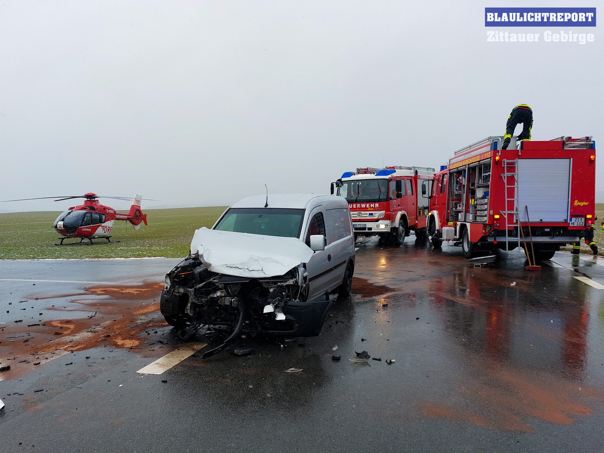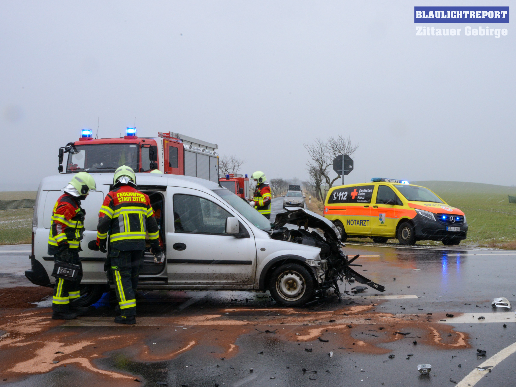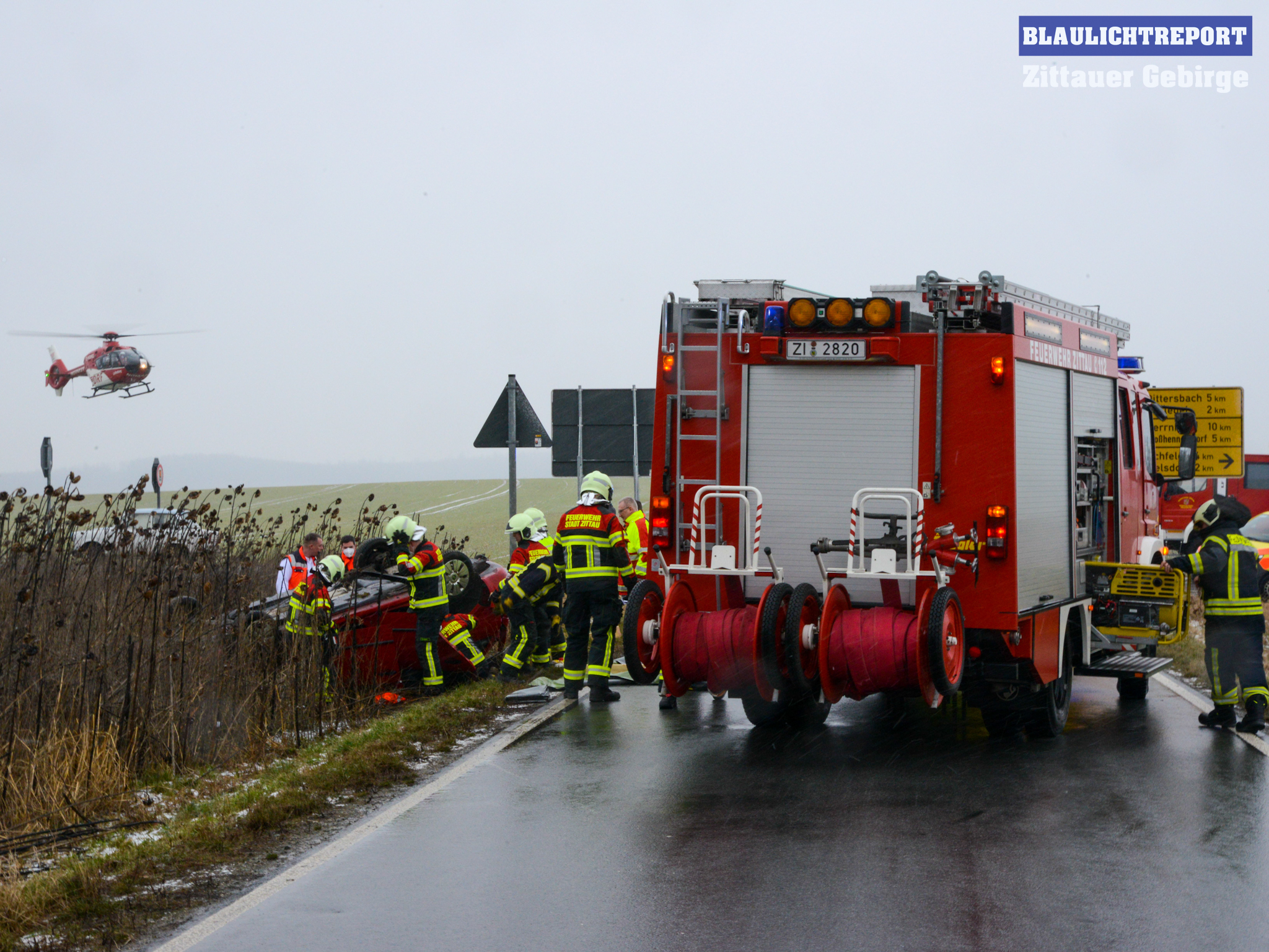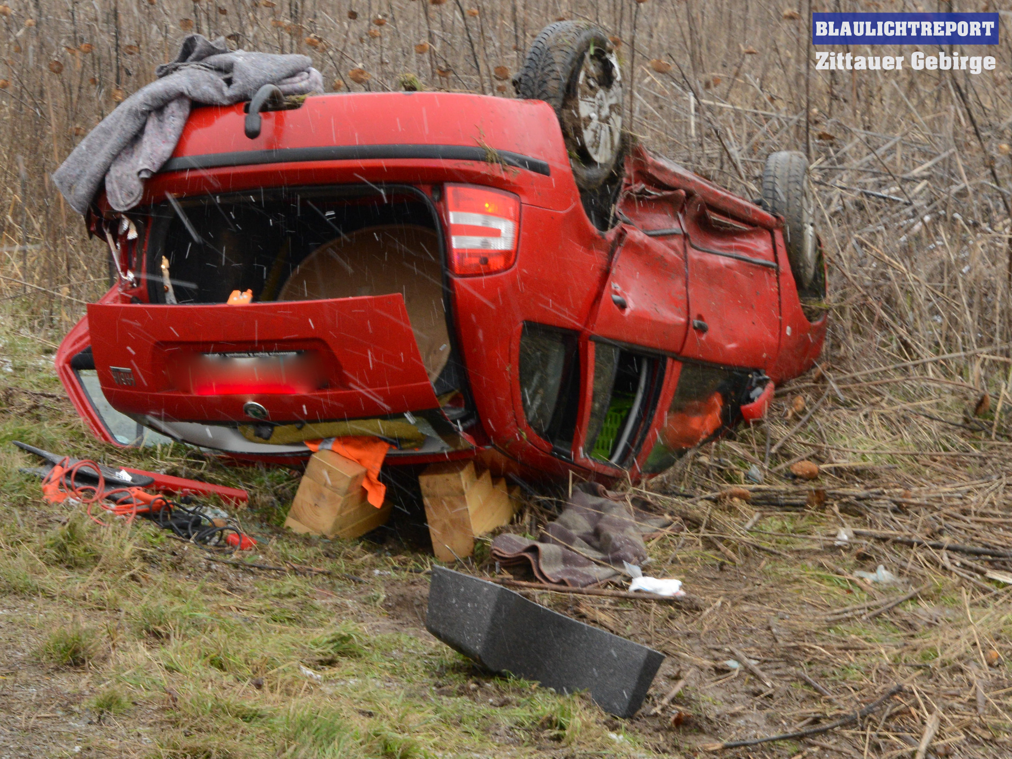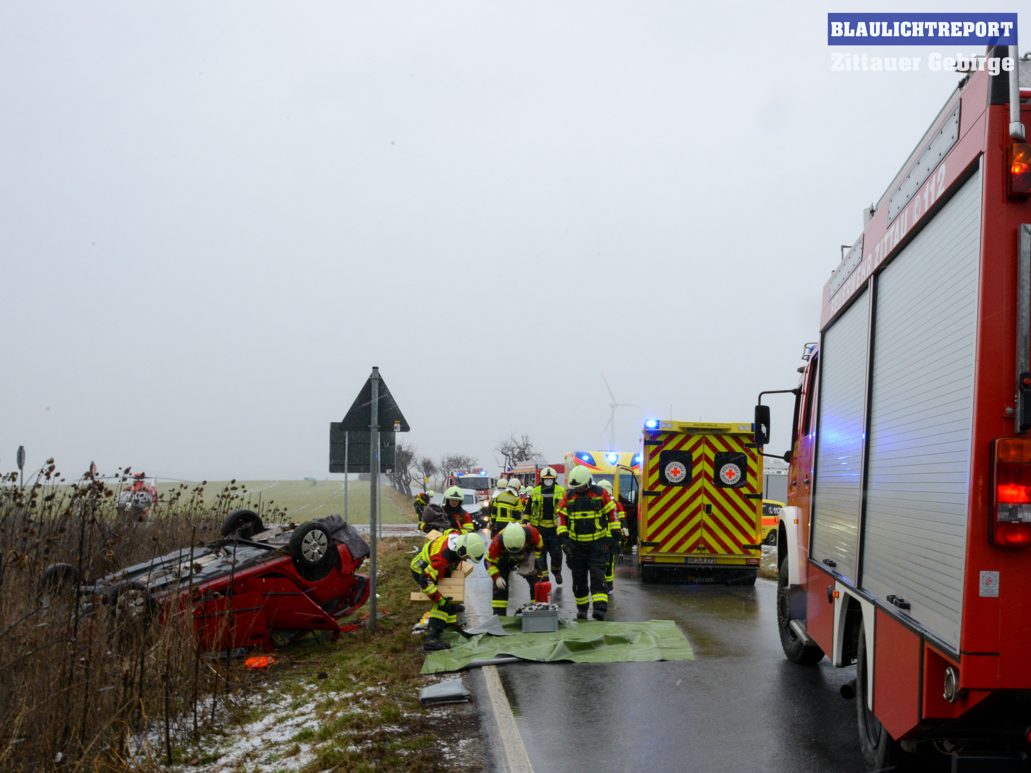 Ein 37 Jahre alte Opel-Fahrer war aus Richtung Dittelsdorf kommend in Richtung Großhennersdorf unterwegs. An der Kreuzung „Schlegler Kreuz“ hat dieser offenbar die Vorfahrt eines Skodas missachtet und krachte auf der Kreuzung mit diesem zusammen. Durch den Zusammenstoß wurde der Skoda von der Straße geschleudert und kam auf dem Feld auf dem Dach zum Liegen. Die Insassen des Skoda wurden teiles schwer verletzt, die 54- jährige Beifahrerin musste mit schwerem Rettungsgerät aus dem Fahrzeug befreit werden.