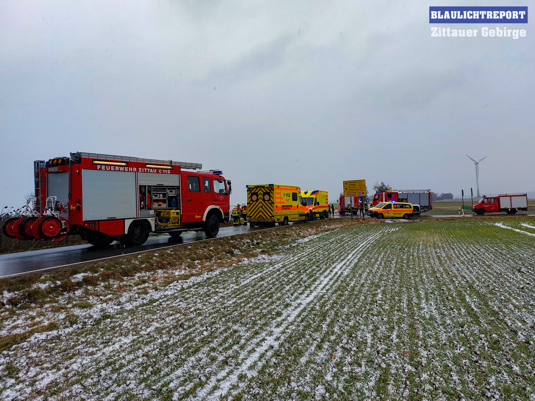 Feuerwehren aus Hirschfelde und Zittau eilten mit 7 Fahrzeugen neben dem Rettungsdienst (mit 4 Rettungswagen), einem bodengebundenen Notarzt, einem Rettungshubschrauber (Christoph 114)und der Polizei zum Unfallort. Vor Ort bot sich ein Bild der Verwüstung. Unmittelbar begannen die Kameraden zu arbeiten. Die Unfallstelle wurde gegen den fließenden Verkehr gesichert, das Fahrzeug stabilisiert und die Personen aus dem Fahrzeug befreit. Die Kameraden übernahmen die Betreuung der Patienten bis zum Eintreffen des Rettungsdienstes. Ausgelaufene Betriebsstoffe wurden aufgenommen.