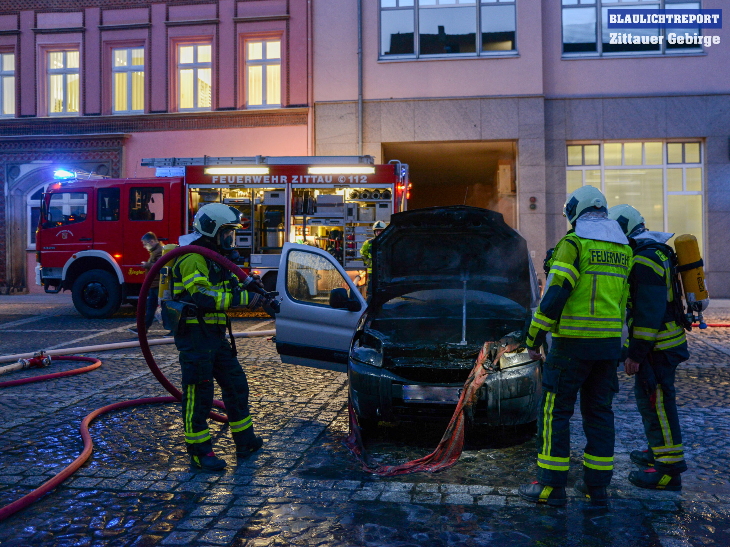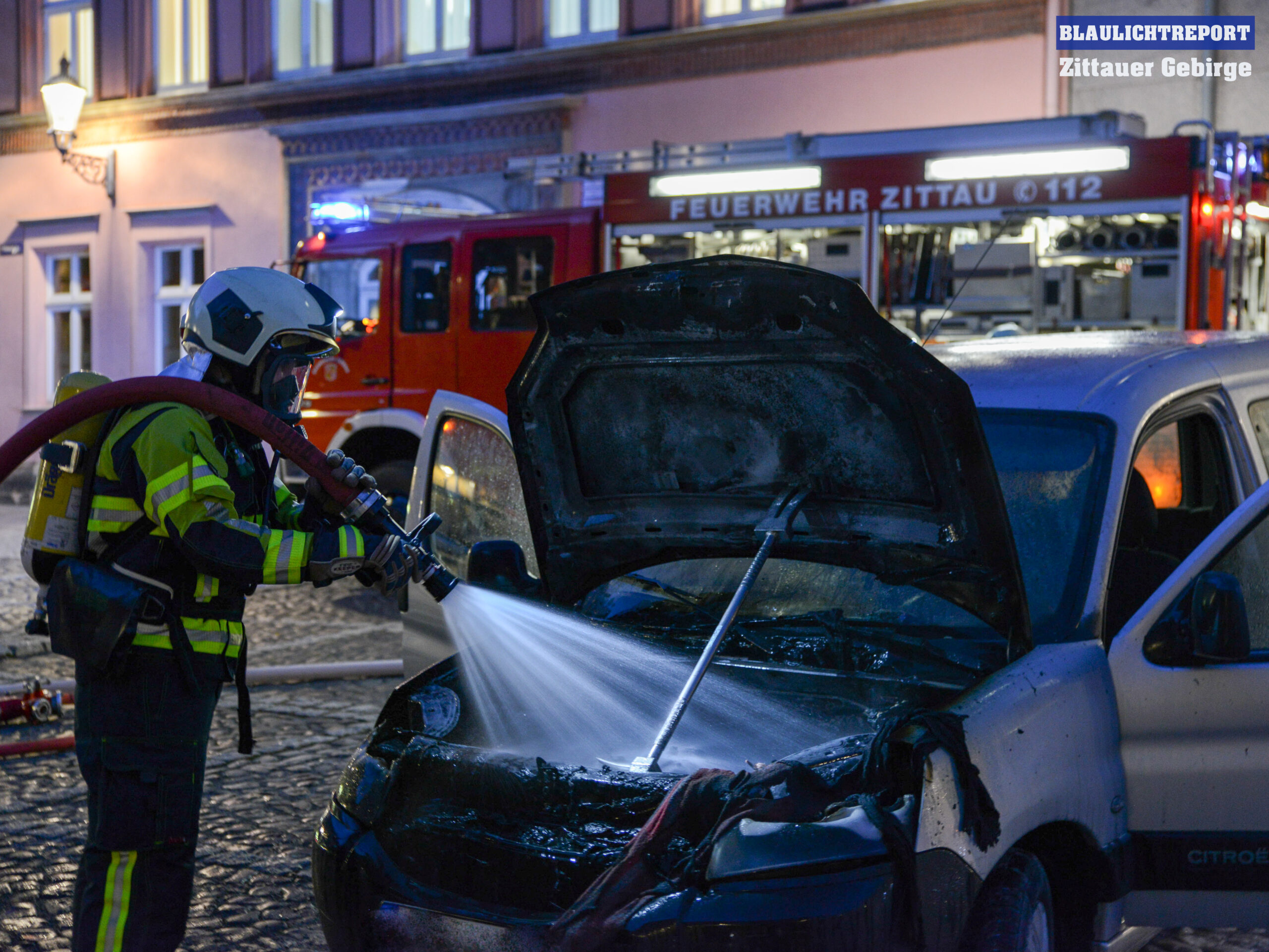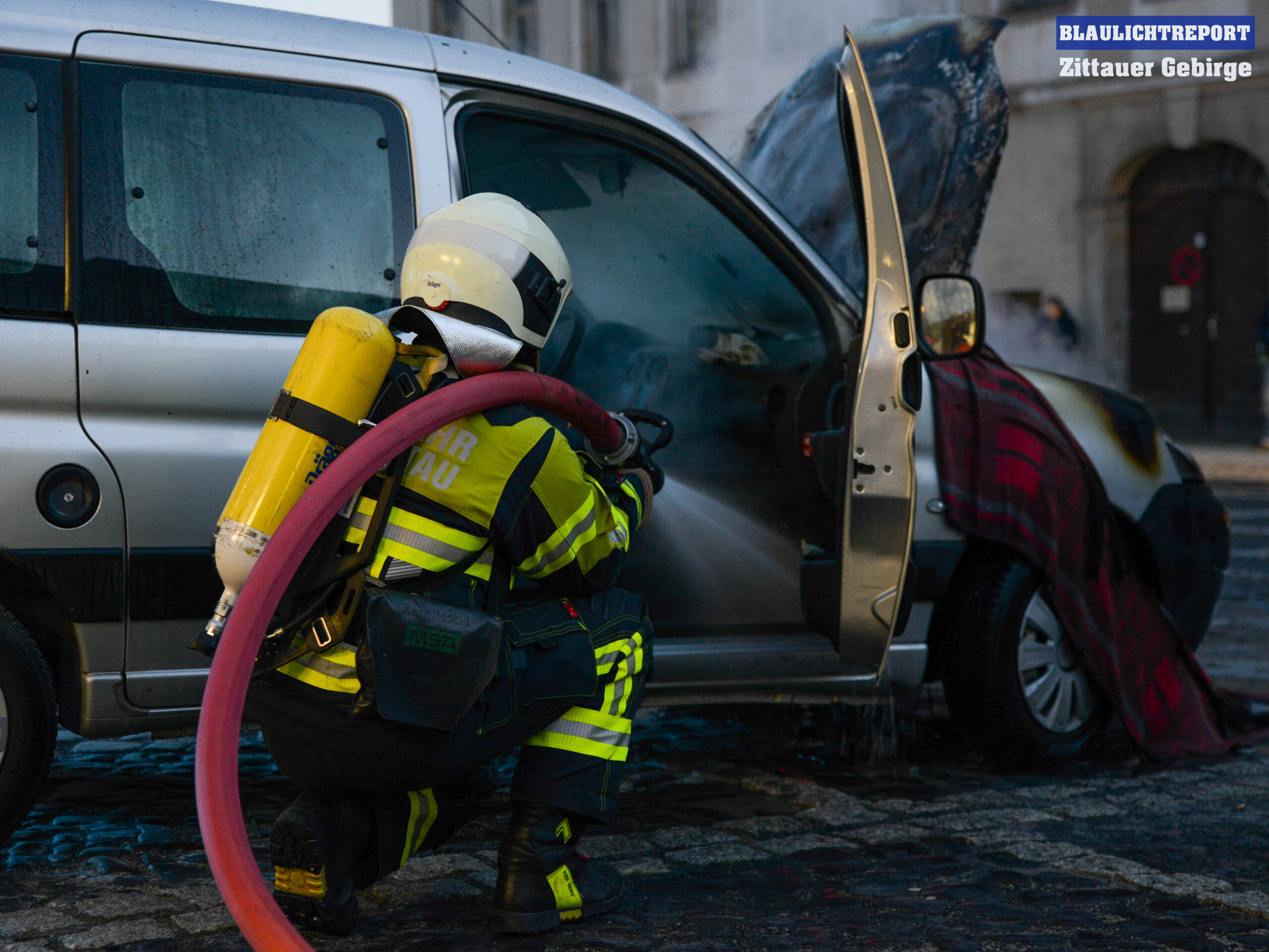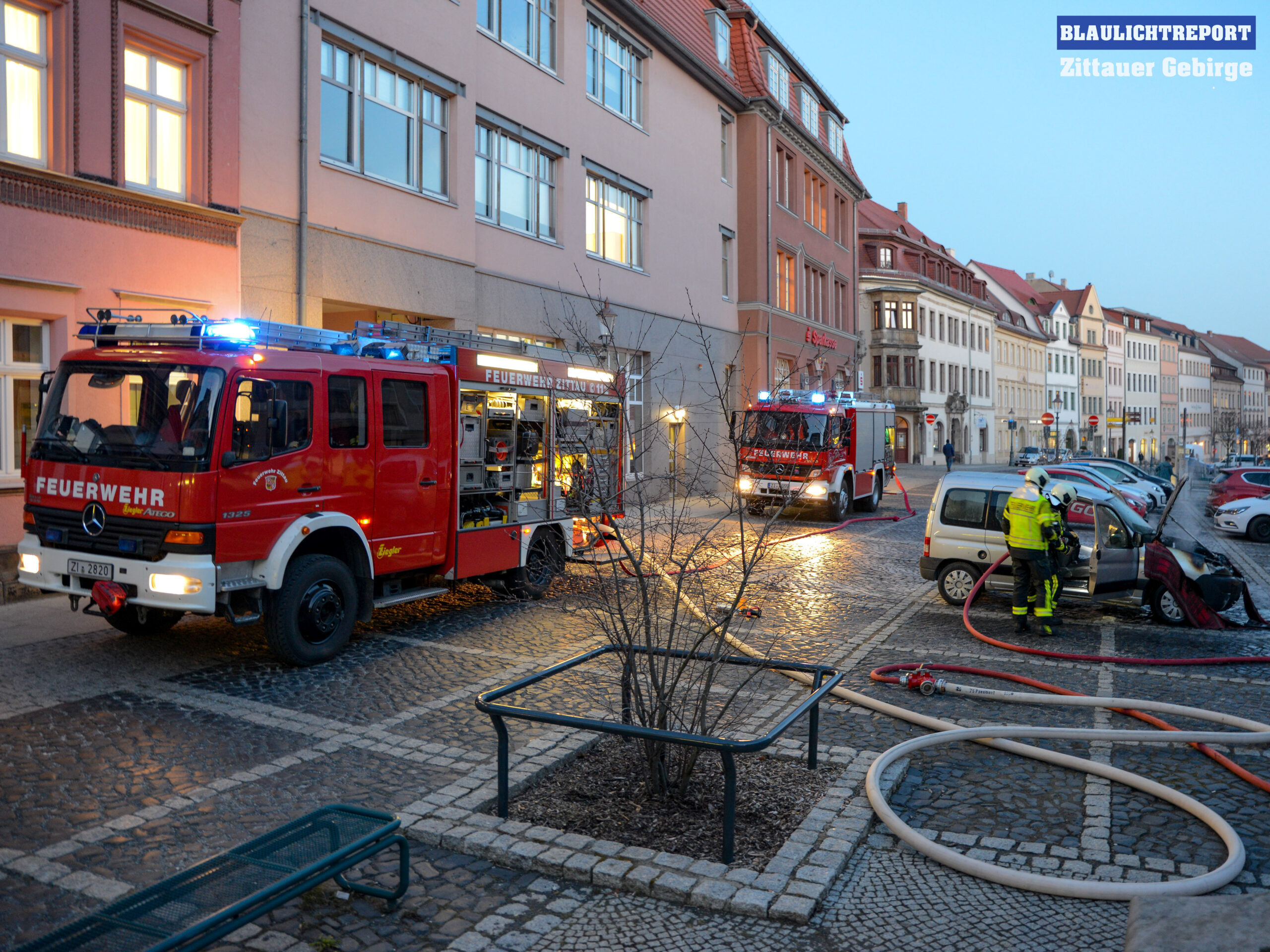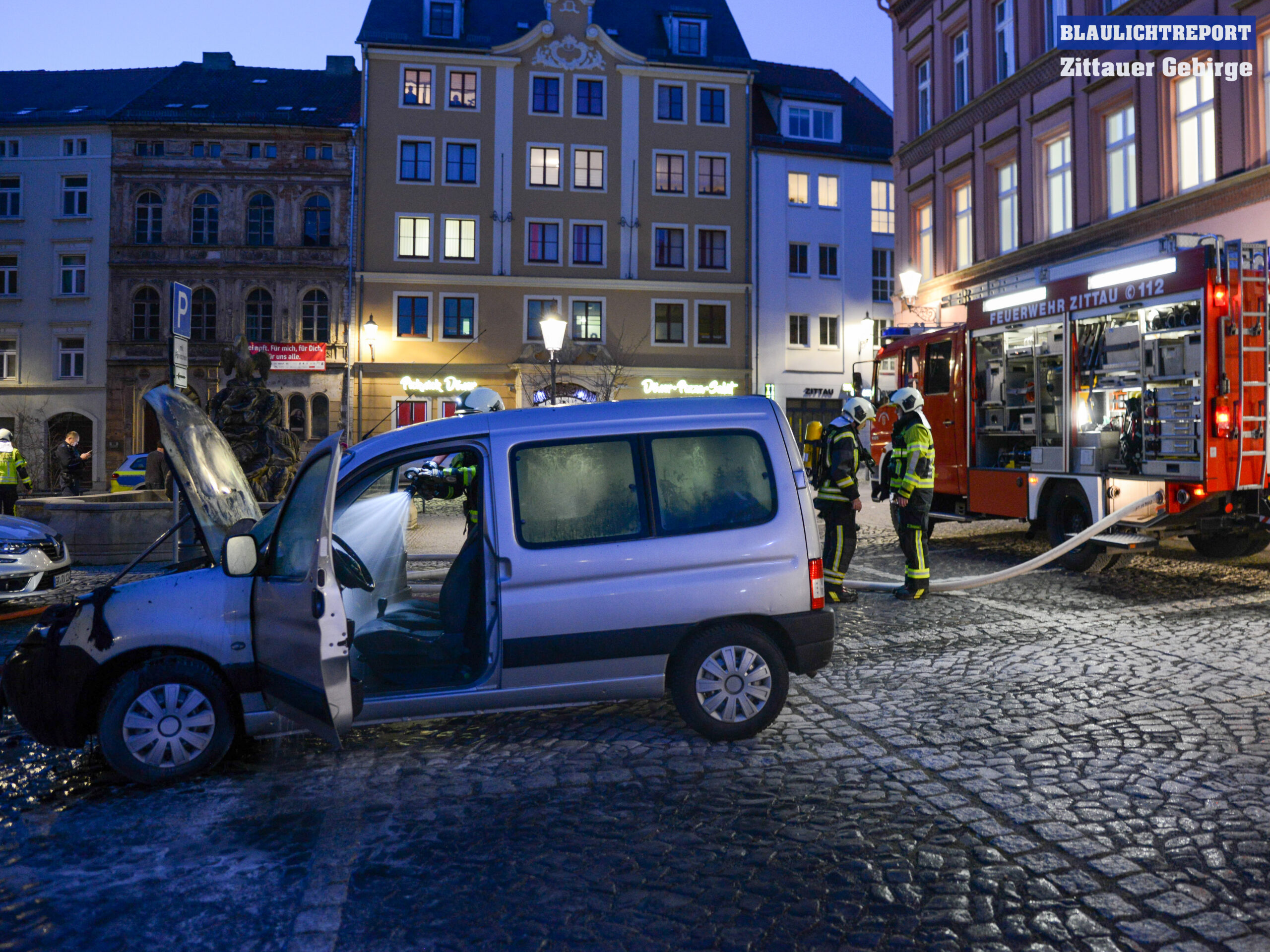 Zu einem Fahrzeugbrand wurde die Feuerwehr Zittau am Dienstagnachmittag auf den Parkplatz an der Neustadt gerufen. Noch während der Anfahrt der Kameraden hatte ein Mitarbeiter einer Dönerstube mit dem Fahrer versucht das Feuer mittels tragbaren Feuerlöscher und mehreren Eimern Wasser zu löschen. Dadurch konnte zumindest ein weiteres bzw. schnelleres Ausbreiten des Brandes verhindert werden. Unter schwerem Atemschutz, mit einem C-Rohr, löschten die Einsatzkräfte das Feuer und kontrollierten das Fahrzeug mit einer Wärmebildkamera auf versteckte Glutnester und kühlten betroffene Bereiche weiter runter.