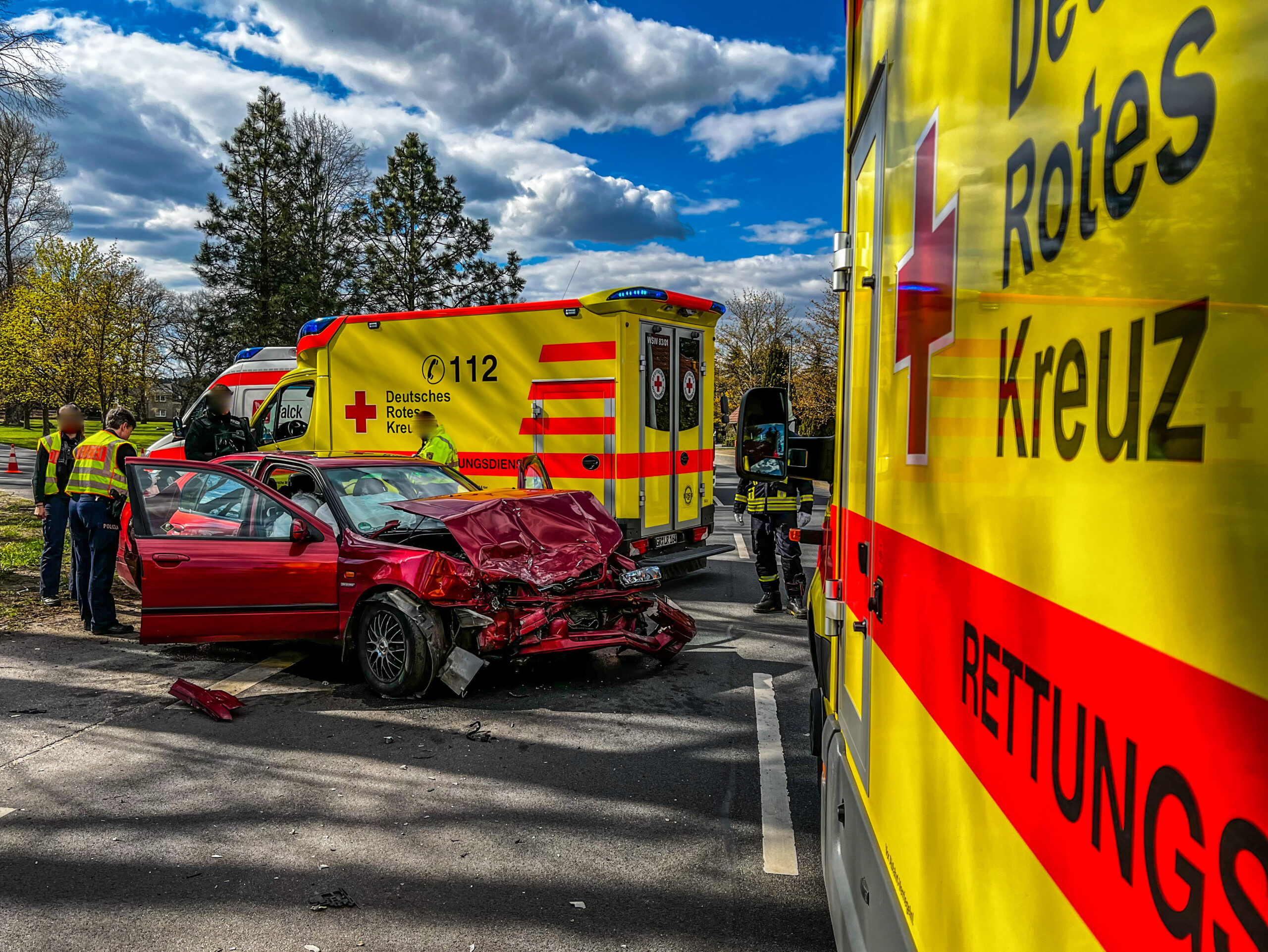 Der 91-jährige Fahrer eines Pkw Nissan befuhr die Klein Dübener Straße und missachtete offenbar in Höhe der Dorfstraße die Vorfahrt eines von rechts kommenden Pkw VW Passat eines 39-jährigen. In Folge dessen kam es zur Kollision, wobei sich beide Fahrer, eine 36- Jährige und eine neun Monate alte Insassin des VW schwer verletzten. Eine weitere 69-jährige Insassin des VW wurde leicht verletzt.