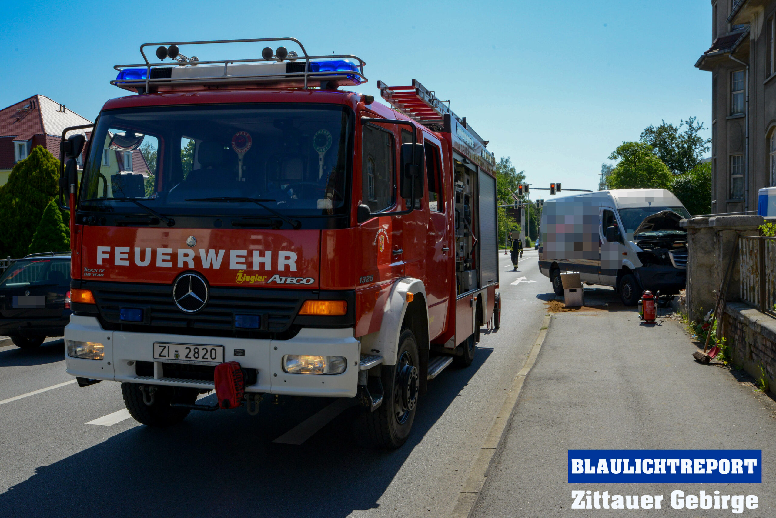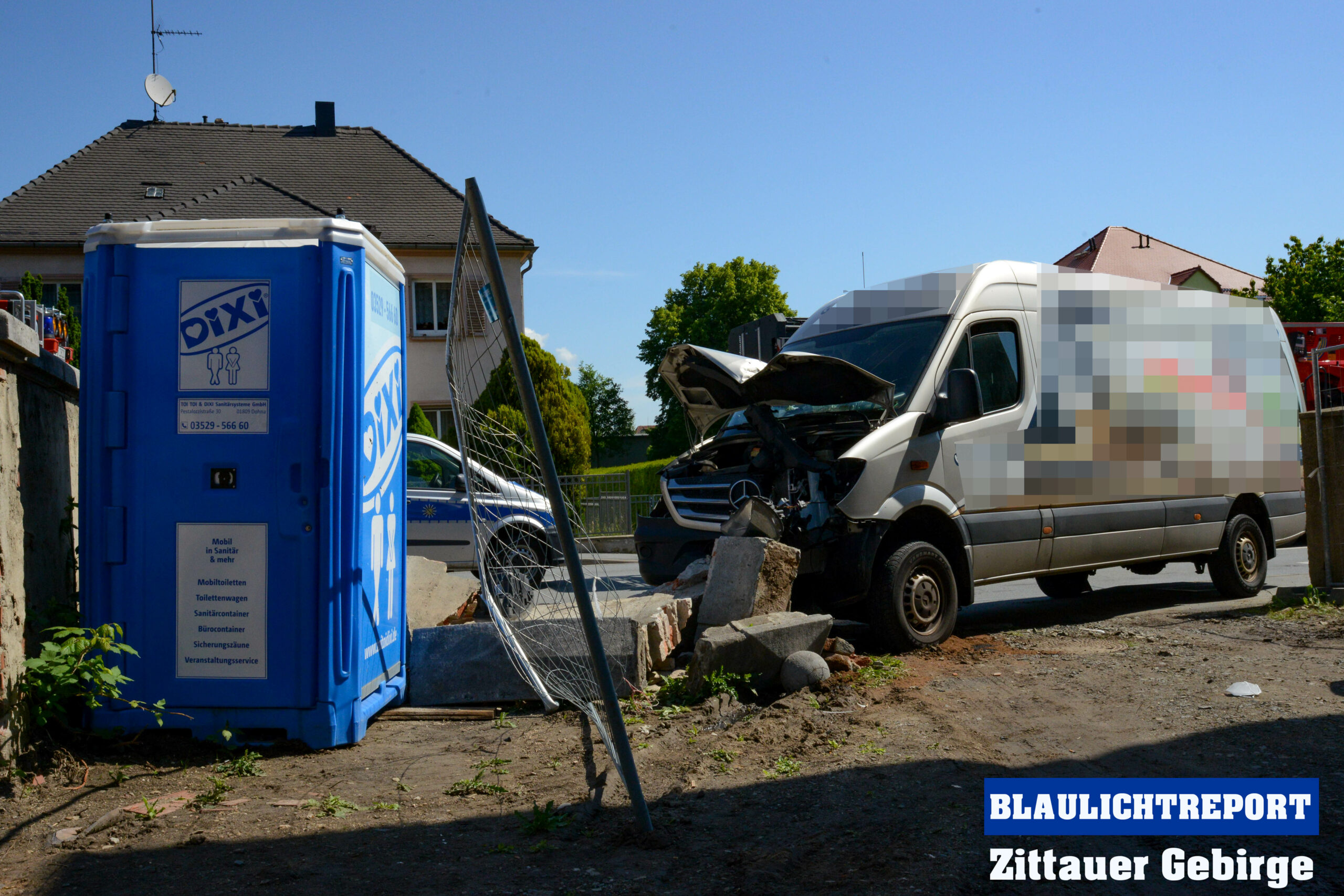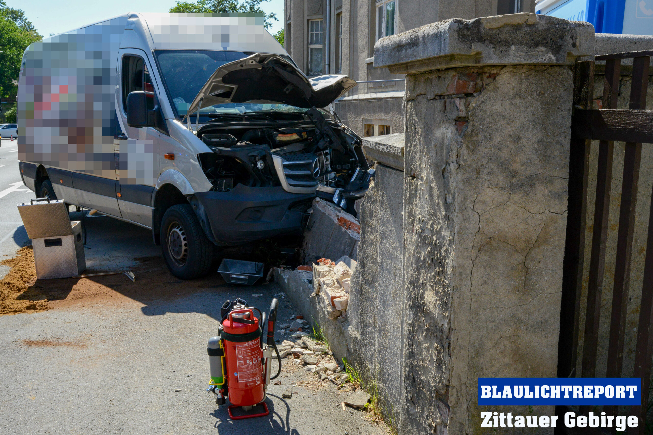 Ein 67- jähriger Fahrer eines Mercedes Transporters befuhr am Dienstagvormittag die Schrammstraße in Richtung Olbersdorf. Vermutlich aus gesundheitlichen Gründen verlor er die Kontrolle über sein Fahrzeug, kam nach Links von seinem Fahrstreifen ab und kollidierte nach dem überqueren des Fußwegs letztlich mit einer Grundstücksmauer.