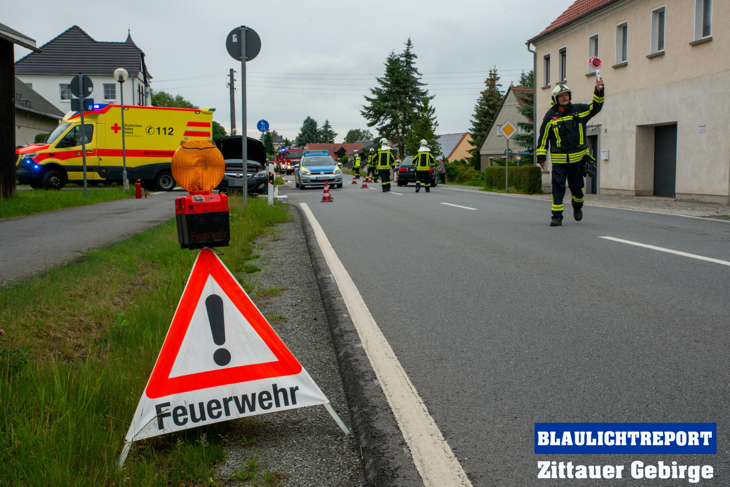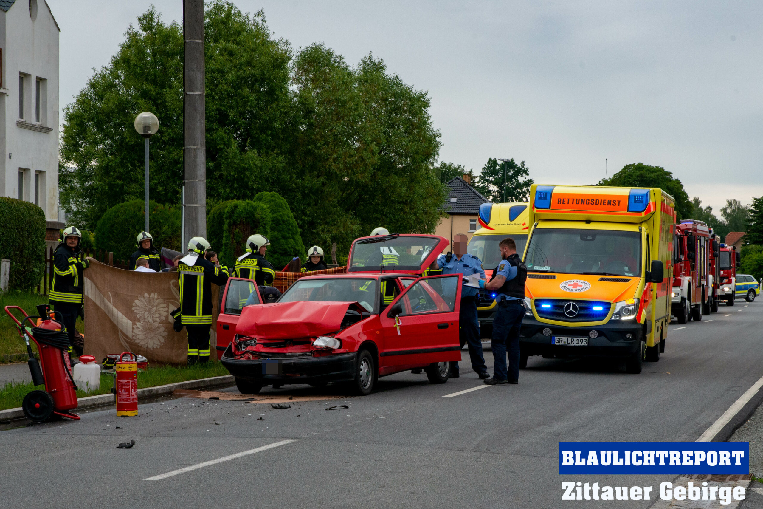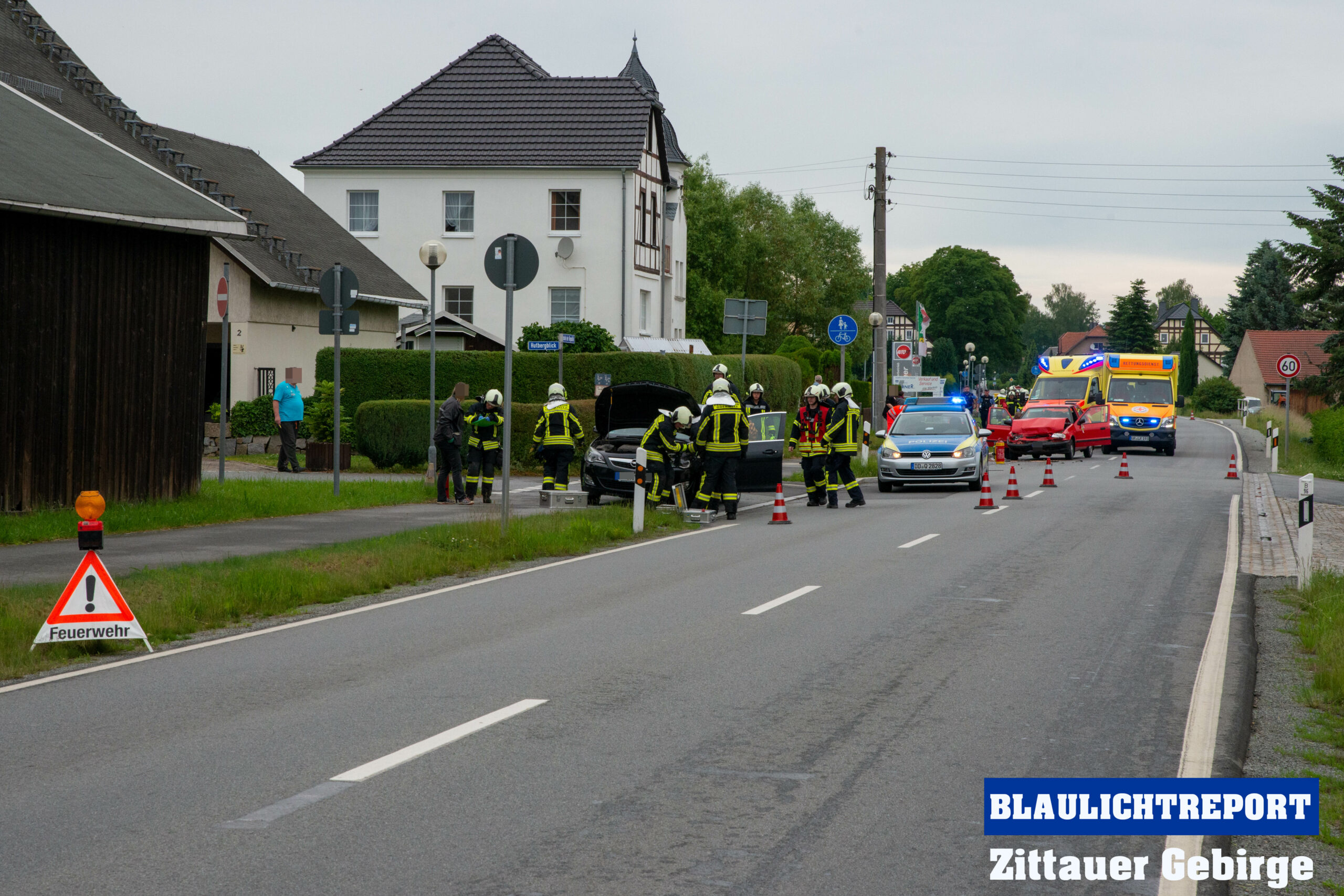 Gegen 16 Uhr ging ein Notruf bei der Rettungsleitstelle Ostsachsen ein. Gemeldet wurde ein Unfall mit zwei Fahrzeugen, Personen seinen aber nicht mehr in den Fahrzeugen gewesen. Die Gesamtfeuerwehr Oderwitz, sowie mehrere Rettungswagen und ein Notarzteinsatzfahrzeug eilten daraufhin neben der Polizei zur Unfallstelle. Vor Ort übernahm der Rettungsdienst die Versorgung der Patienten, die Feuerwehr die Absicherung der Unfallstelle. Ausgelaufene Betriebsstoffe wurden gebunden und aufgenommen, der Brandschutz wurde sichergestellt. Für die Dauer der Rettungsmaßnahmen und der Unfallaufnahme war eine Vollsperrung der Bundesstraße im betroffenen Bereich notwendig.