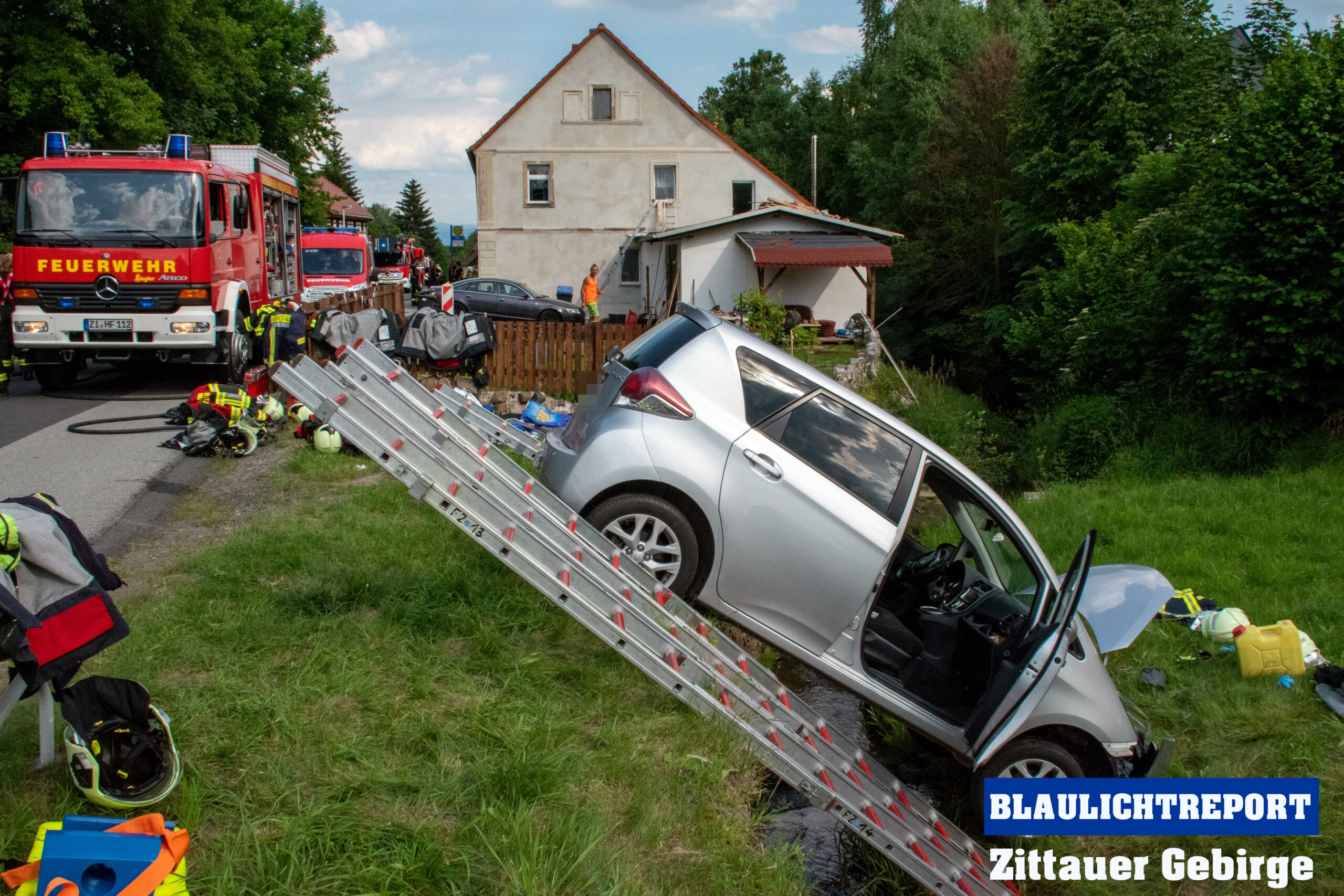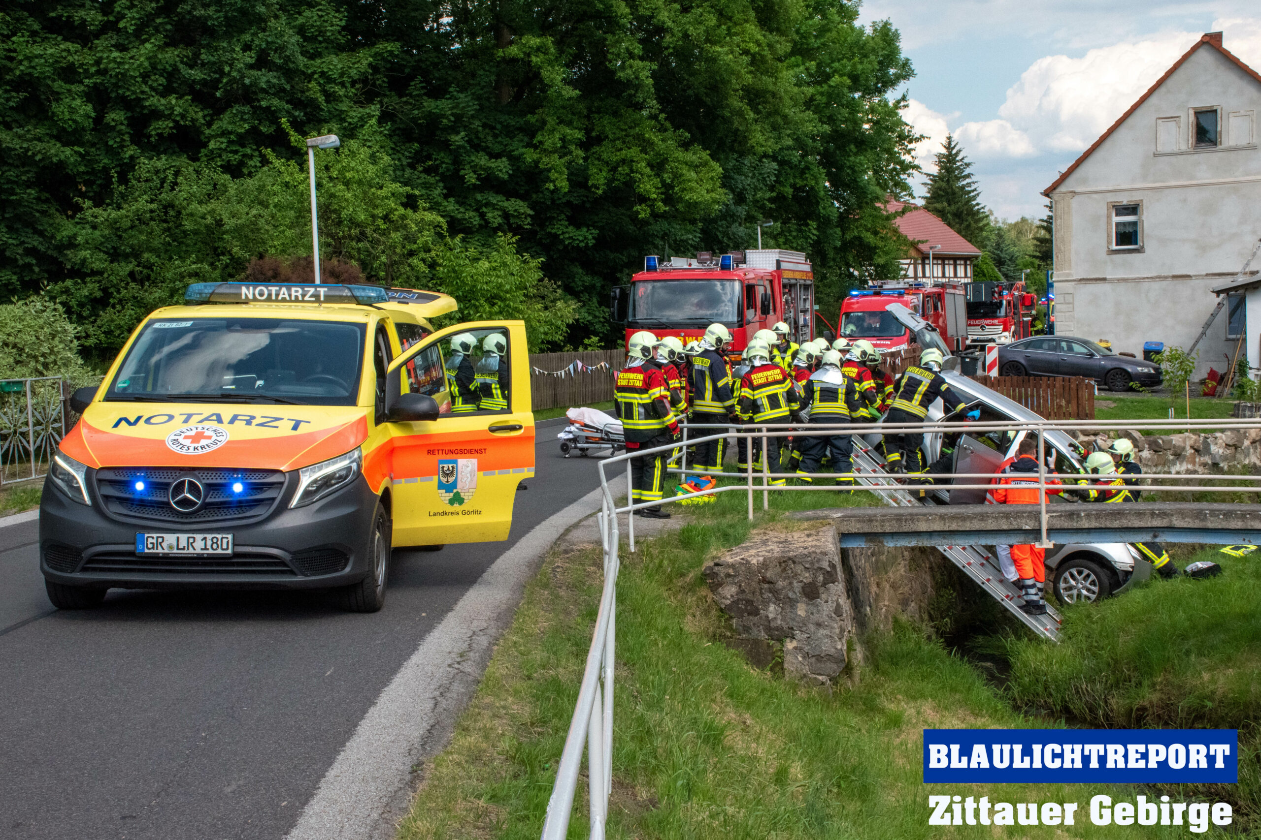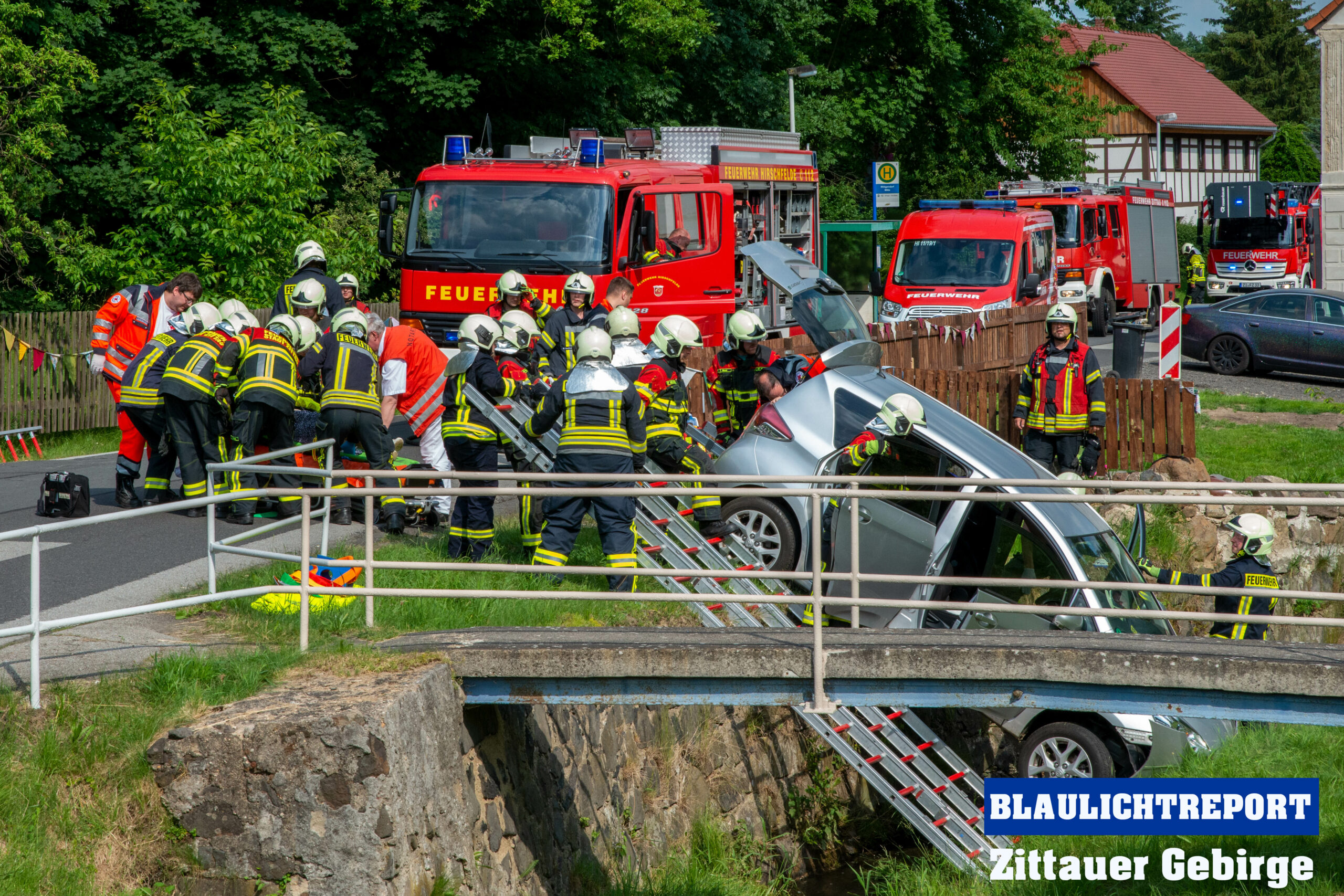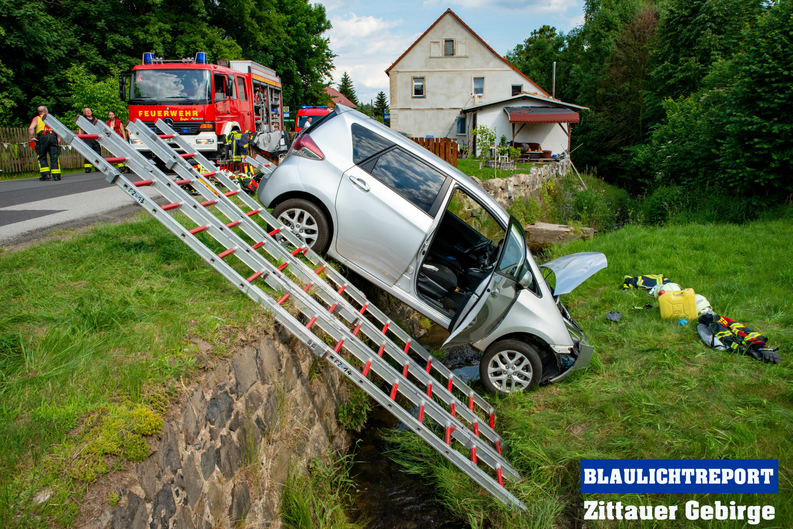 Aus bislang ungeklärter Ursache fuhr ein Toyota über den Hang einer Bachmauer. Eine Frau und ein Mann mussten von den Rettern aus dem Auto befreit werden. Anwohner, die einen lauten Knall gehört hatten, kümmerten sich um die Unfallopfer und leisteten Erste Hilfe.