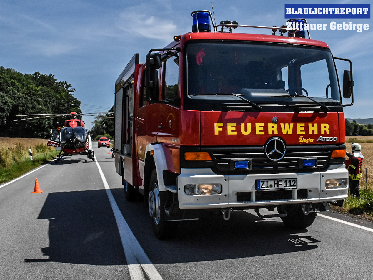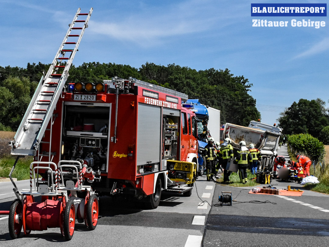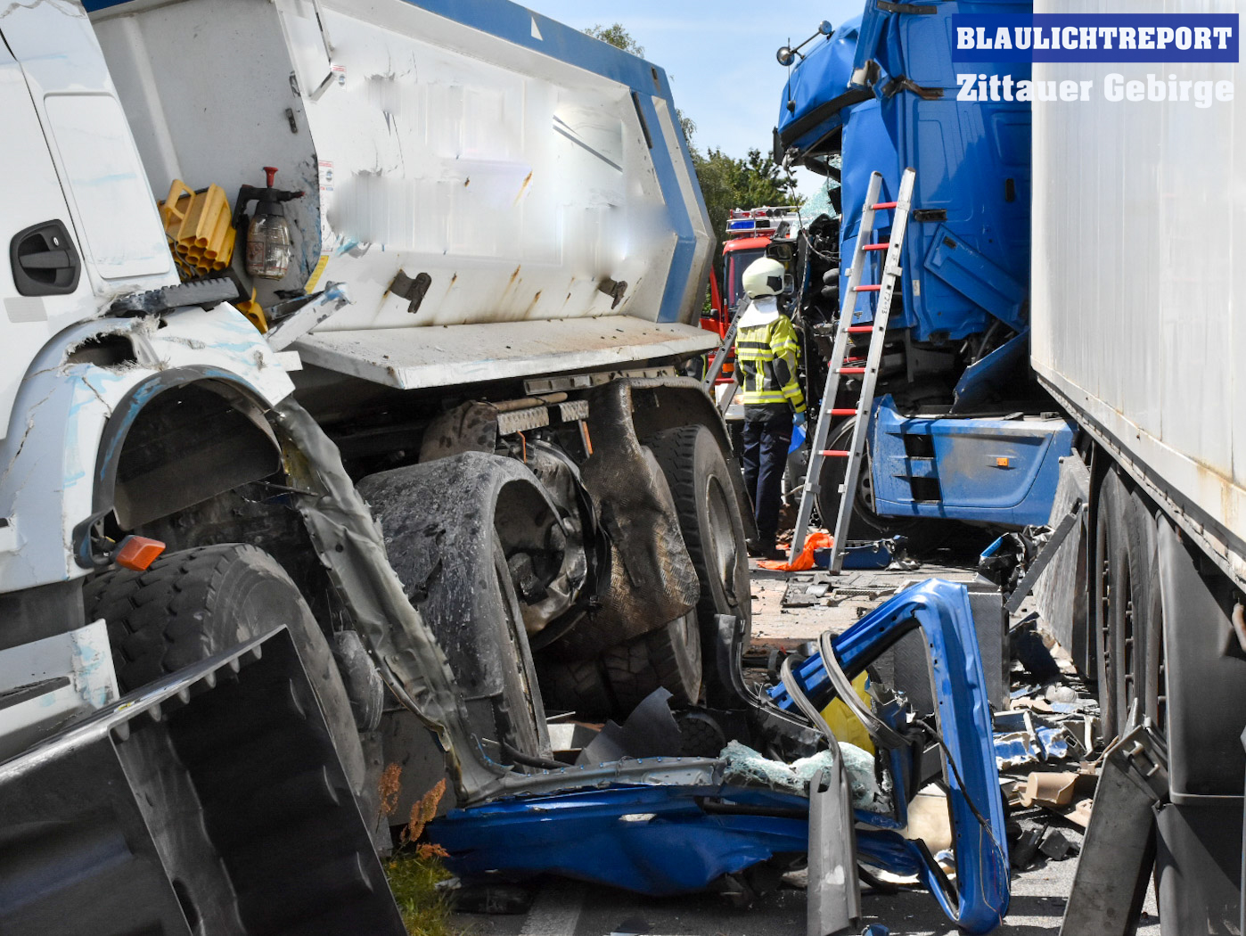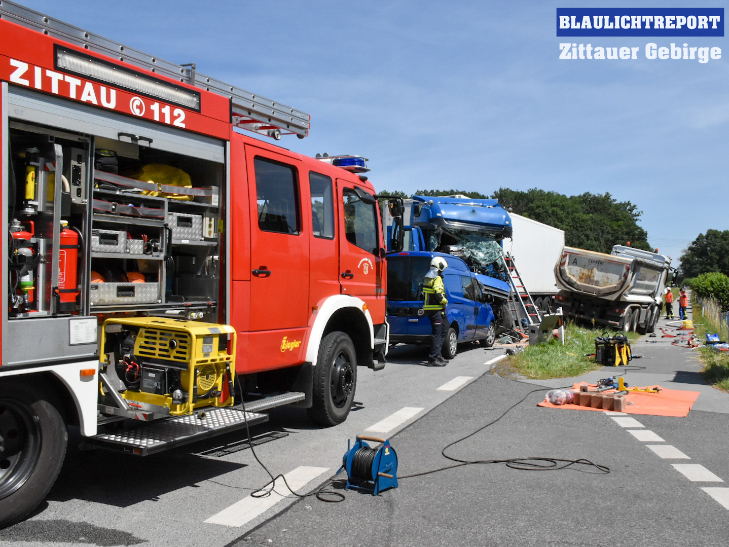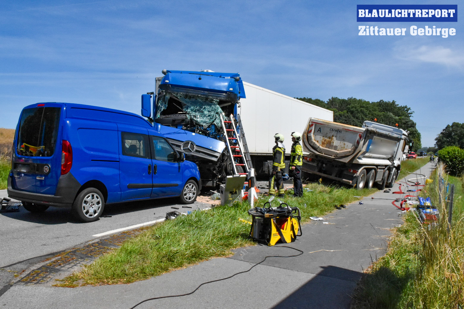 Wie die Polizei mitteilte, soll der 54-jährige Fahrer eines Sattelzug, der auf der B 99 in Richtung Zittau unterwegs war, aus noch bisher ungeklärter Ursache in den Gegenverkehr geraten sein. Dort kollidierte er mit einem von Zittau kommenden beladenen Kipper und dann mit einem dahinter fahrenden Fiat.