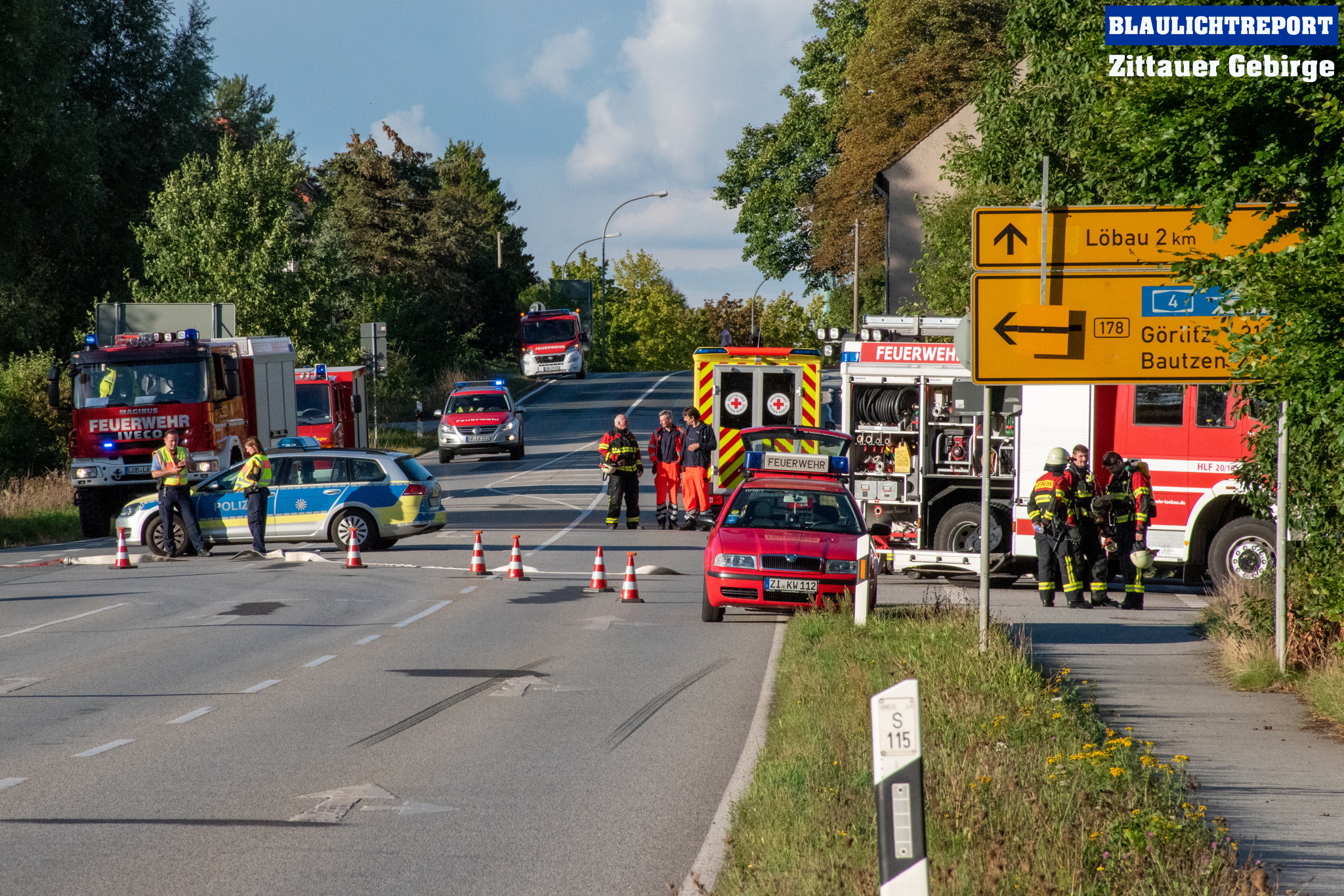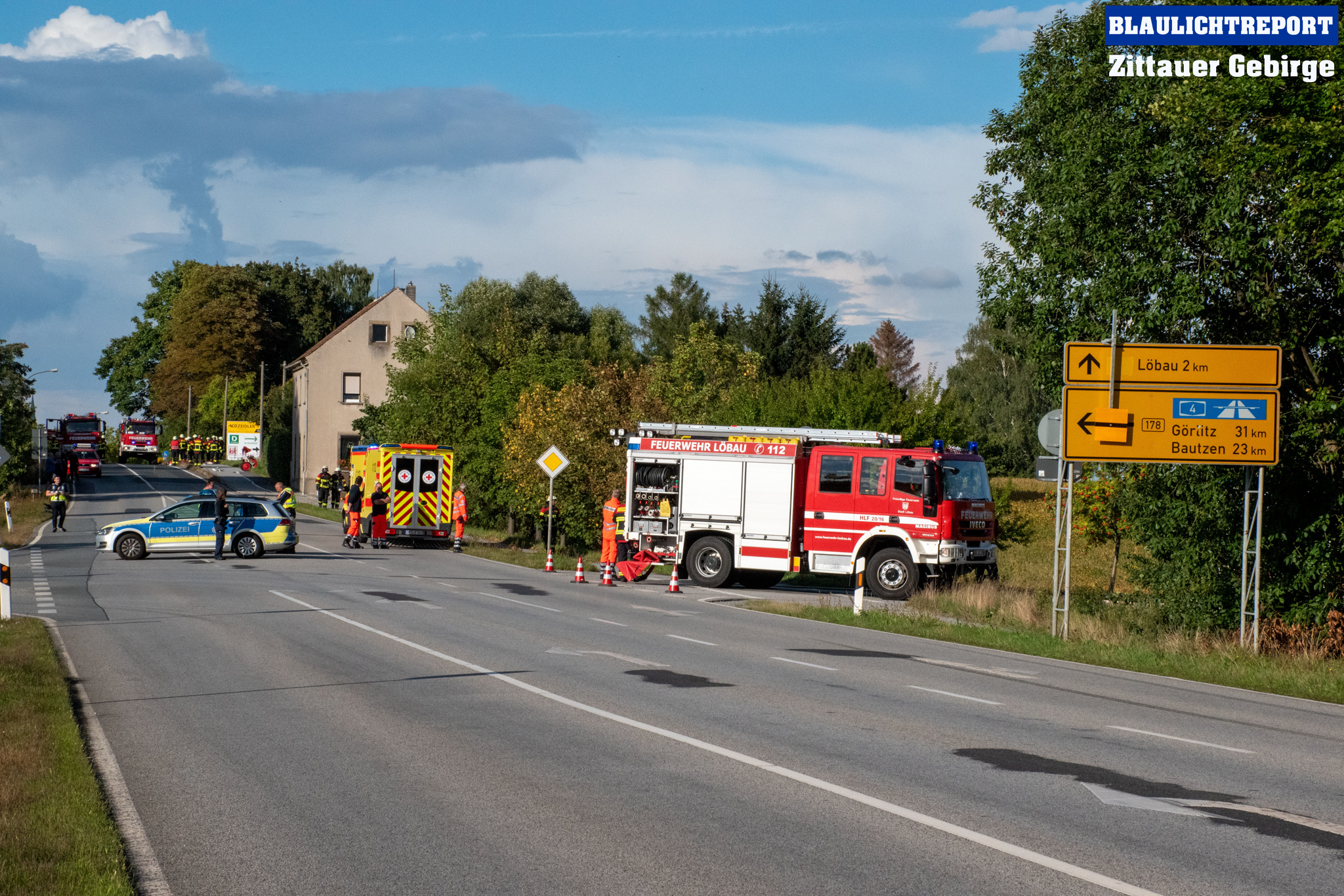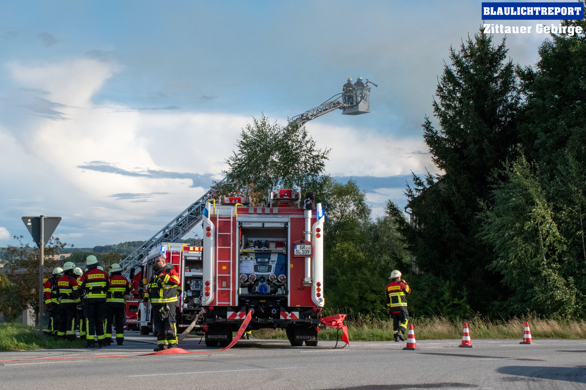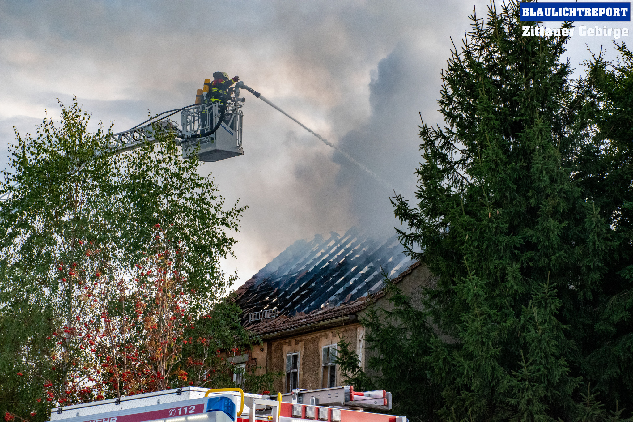 In Löbau ist am Samstagnachmittag ein Feuer in einem leerstehenden Haus ausgebrochen. Das teilte die Polizei mit. Demnach alarmierte die Rettungsleitstelle Ostsachsen die Feuerwehren aus Löbau, Ebersdorf und Großdehsa zu einem Brand in einem Gebäude an der B178 mit dem Stichwort B2. Als die ersten Kräfte eintrafen bestätigte sich die Lage und weitere Kräfte aus Kittlitz und Lautiz wurden nachalarmiert, so die Feuerwehr. Flammen schlugen durchs Dach, die Rauchwolke war kilometerweit zu sehen. Da das Dach komplett in Flammen stand, gestalteten sich die Löscharbeiten schwierig. Mittels Monitor wurde der Brand ausschließlich von der Drehleiter bekämpft. Ein Innenangriff war aufgrund der unklaren Statik des Gebäudes zu gefährlich. Für eine stabile Wasserversorgung verlegte man Mithilfe des GW-L eine lange Wegstrecke von einem Teich ein paar hundert Meter weiter.