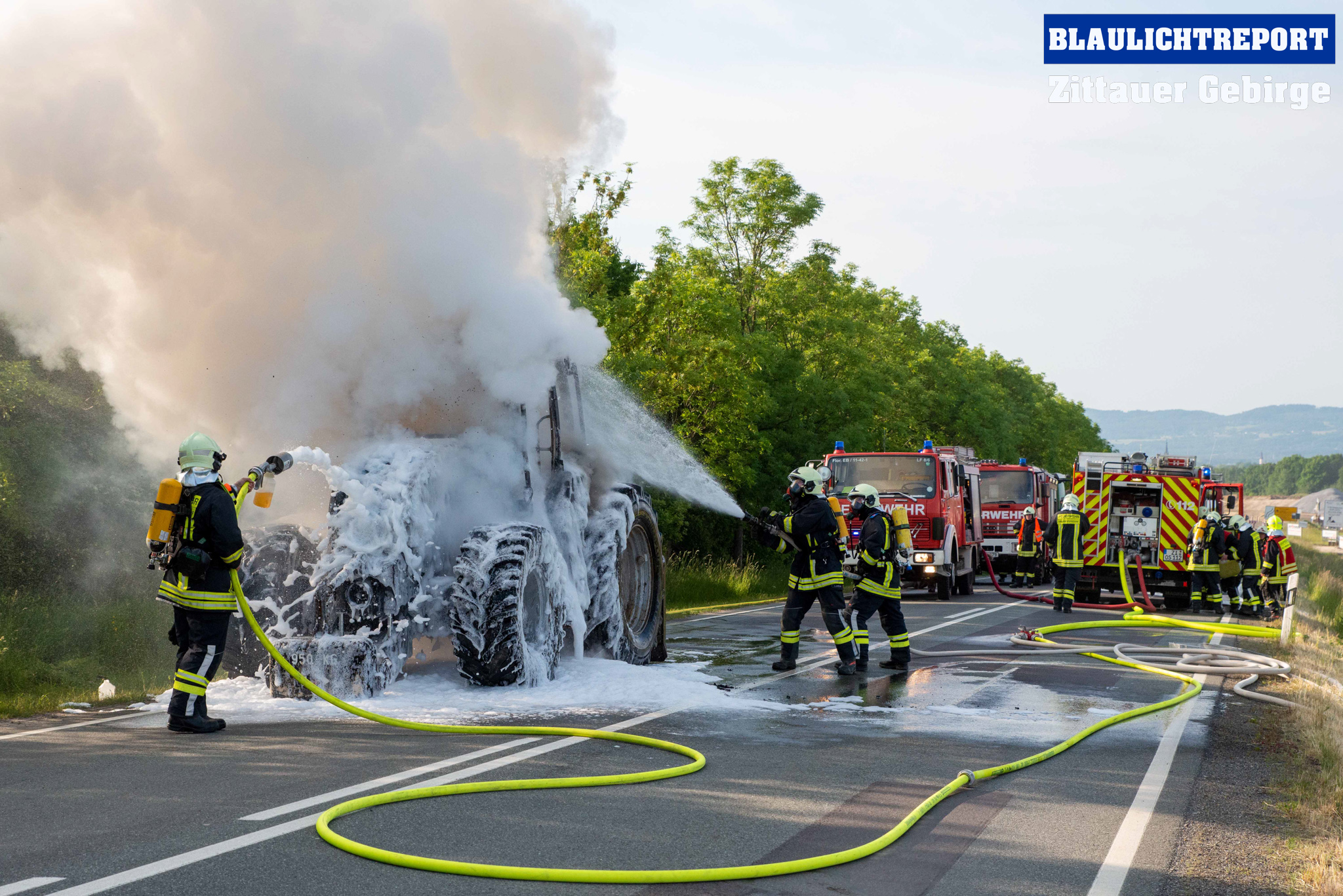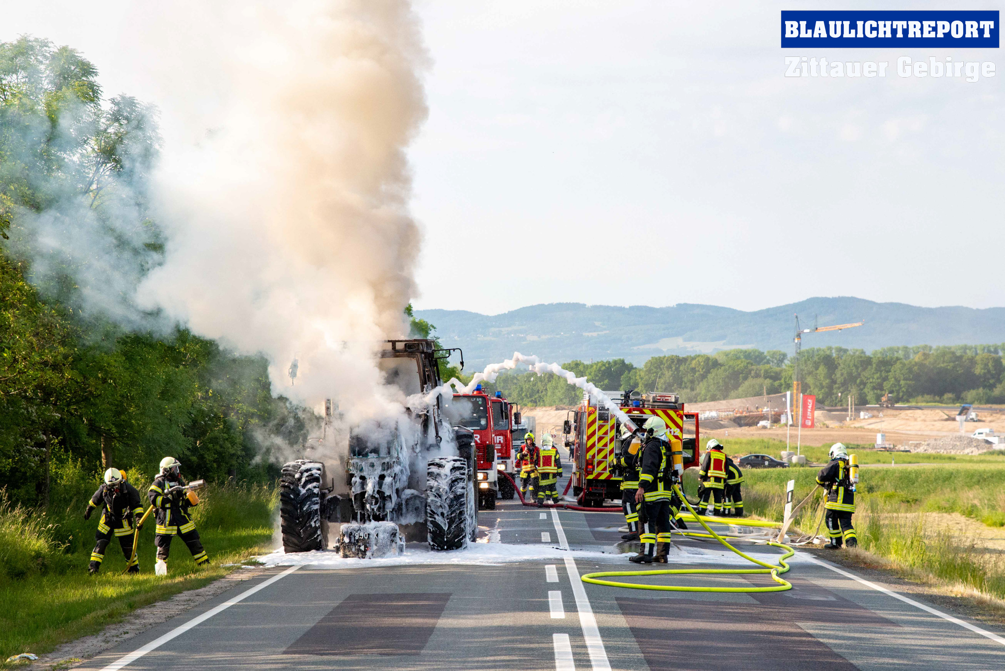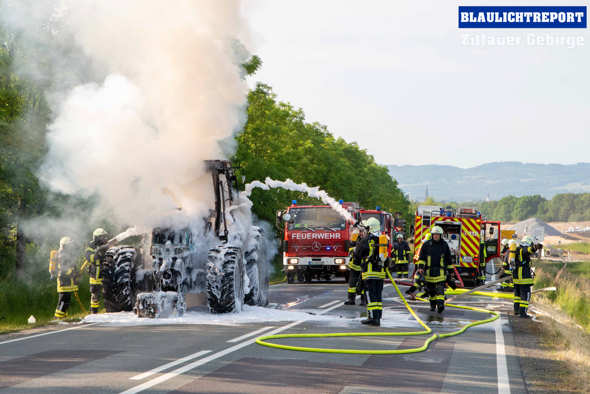 Oberseifersdorf – Am Montagmorgen ist ein Traktor auf der Bundesstraße 178 bei Oberseifersdorf in Flammen aufgegangen. Kurz vor 7.30 erhielt die Leitstelle Ostsachsen einen Notruf, bei dem der Vollbrand eines Treckers auf der Bundesstraße 178 mitgeteilt wurde. Unter dem Stichwort B2 alarmierte die Leitstelle die Ortswehren Oberseifersdorf, Eckartsberg und Mittelherwigsdorf zur Einsatzstelle. Die Rauchsäule war weit zu sehen – Anfahrt auf Sicht. Der Fahrer des Treckers, der in Richtung Großhennersdorf unterwegs war, hatte diesen abgestellt und sich in Sicherheit gebracht, als er den Brand bemerkte. Die Einsatzkräfte gingen unter schwerem Atemschutz mit einem C-Rohr und zwei Schaumrohren zu Brandbekämpfung vor. Die Bundesstraße musste für den gesamten Einsatz voll gesperrt werden.
