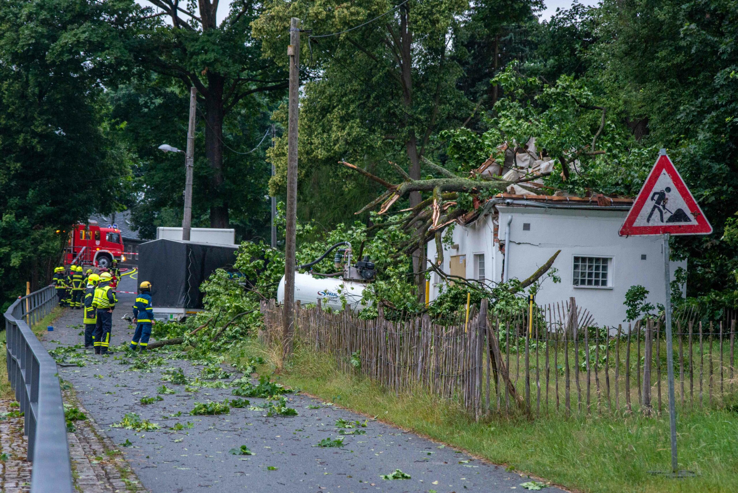 So auch die Feuerwehr Neusalza-Spremberg. Die Kameraden rückte zu einem Unwettereinsatz im Bereich der Talstraße aus. Der Sturm ließ einen Baum brechen und auf das Gebäude einer Gasverteilungsanlage fallen. Als die Kameraden vor Ort eintrafen, bestätigte sich die Lage. Durch den Aufschlag des Baumes wurde das massive Gebäude stark beschädigt. Das Dach stürzte ein. Die Einsatzleitung der Feuerwehr zog das Technische Hilfswerk hinzu. Ein Fachberater sollte über eine mögliche Einsturzgefahr des Gebäudes entscheiden. Erschwerend kam hinzu, dass auf der Leitung, trotz dem Abschiebern weiterhin 16 bar Druck vorhanden waren. Im Laufe des Einsatzes konnte sich Zugang zum Objektinneren verschafft werden, so dass die Leitung drucklos gemacht werden konnte. Der Dieseltank einer Baufirma wurde aus dem Gefahrenbereich gebracht und Grundstück gesichert. Nach etwa 4 Stunden konnte der Einsatz beendet werden. Der Energieversorger bestätigte am Morgen das Abschiebern der Gasleitung, wies aber auch daraufhin, dass es zu keinem Ausfall der Gasversorgung kam.