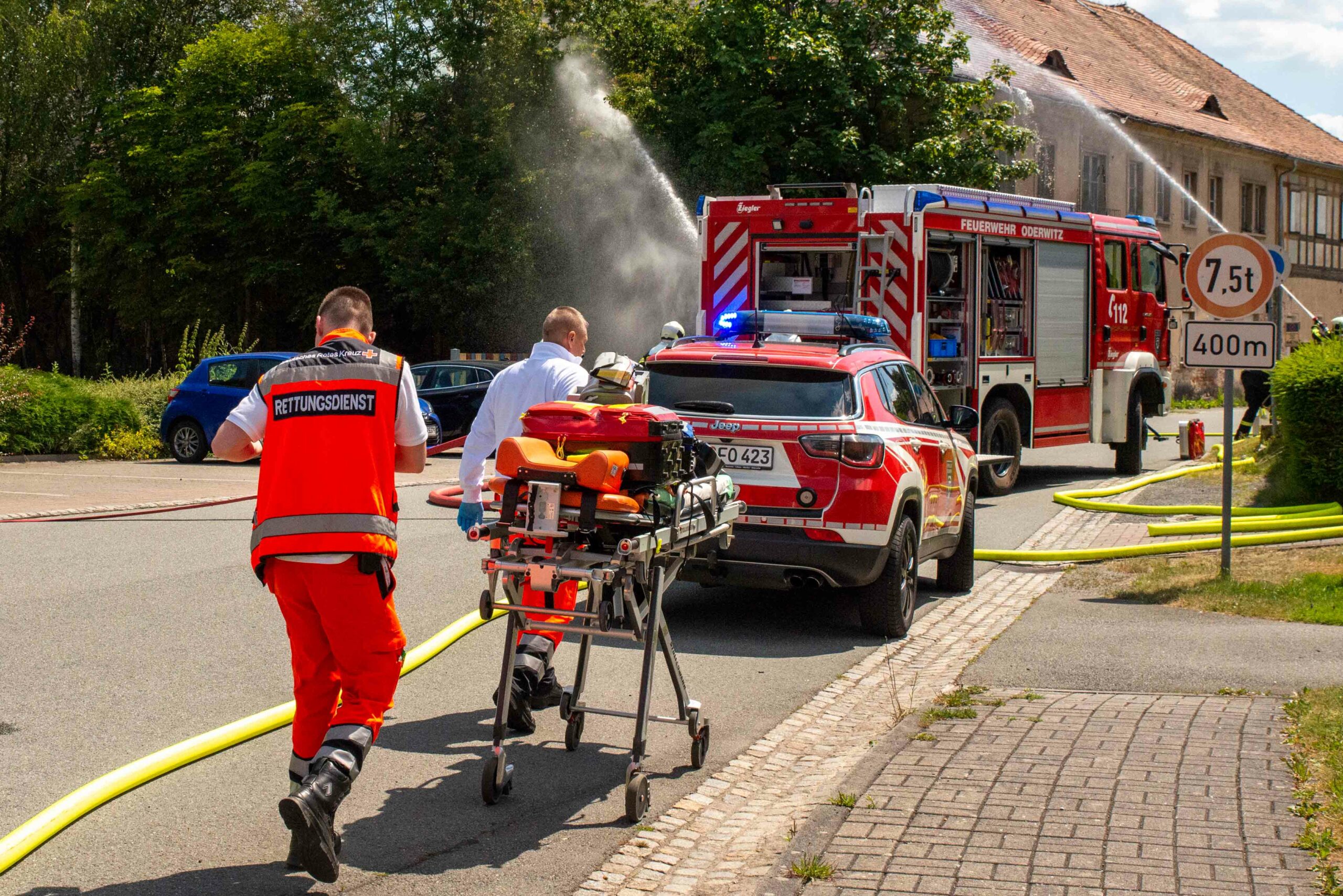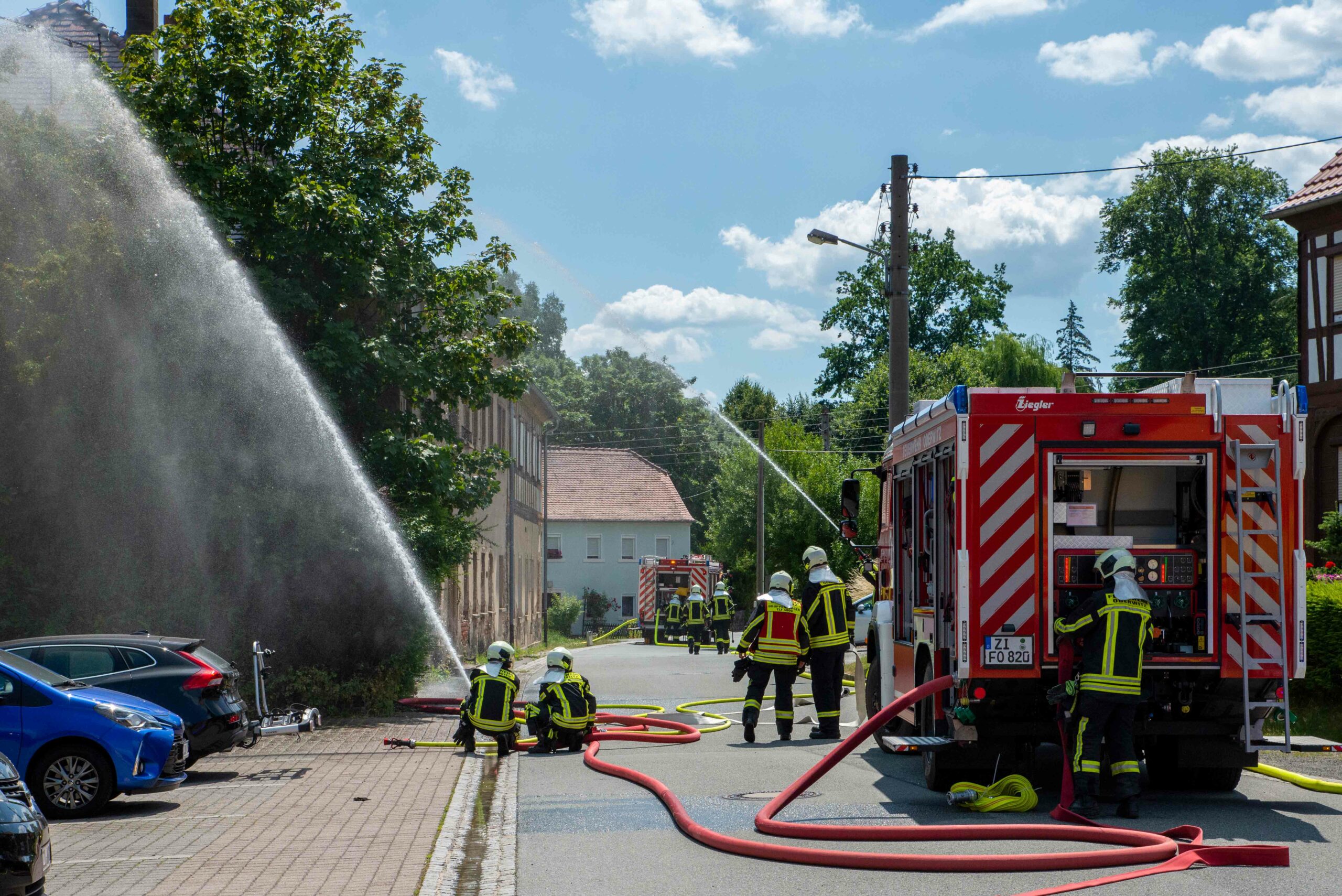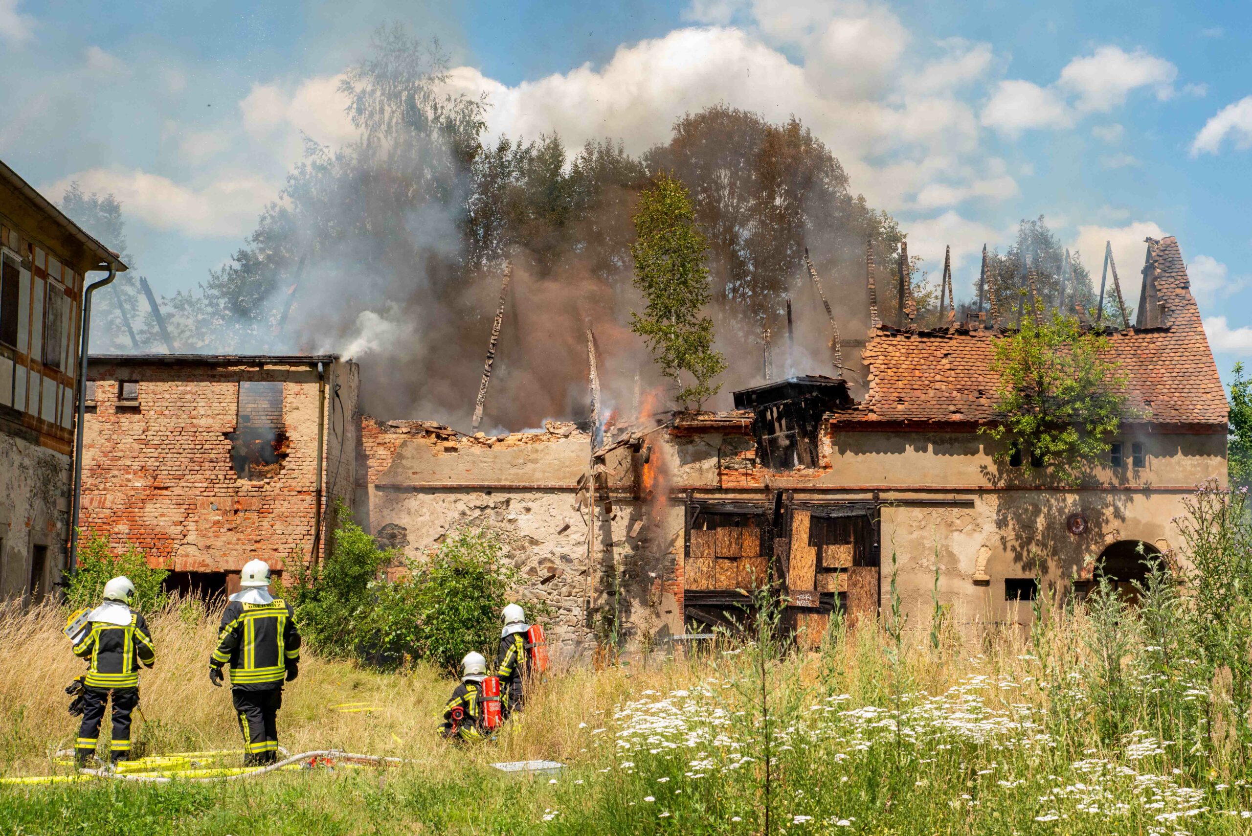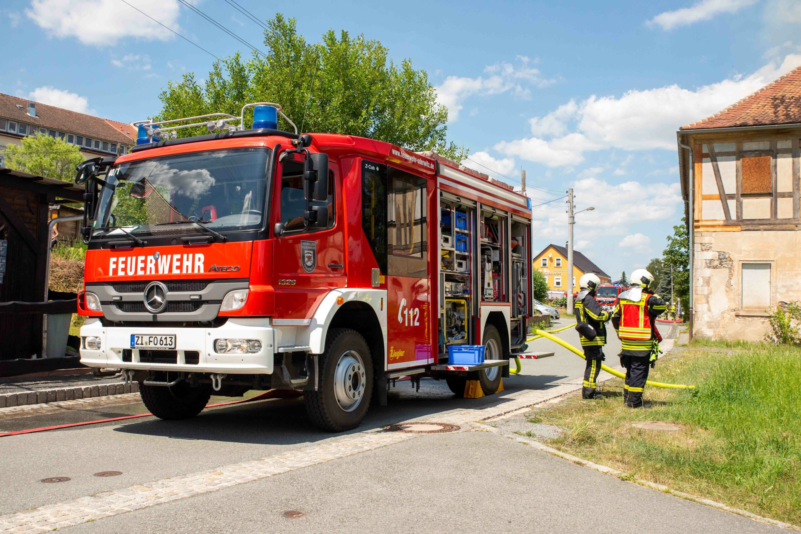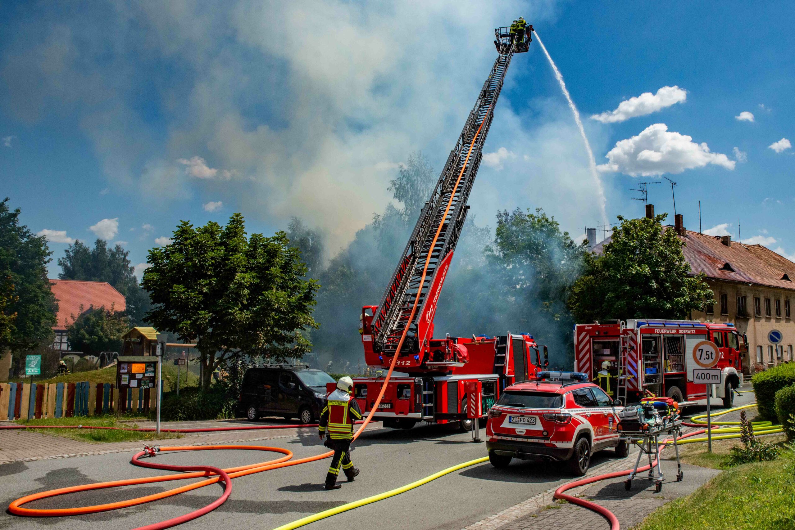 Oderwitz – Am Freitagmittag wurden die Feuerwehren Oderwitz und Spitzkunnersdorf zu einem Gebäudebrand in der Kirchstraße alarmiert. Bereits auf der Anfahrt war eine schwarze Rauchwolke sichtbar. Beim Eintreffen der ersten Einsatzkräfte hatte sich das Feuer zu einem Vollbrand entwickelt und drohte auf das baulich angrenzende Gebäude überzugreifen.