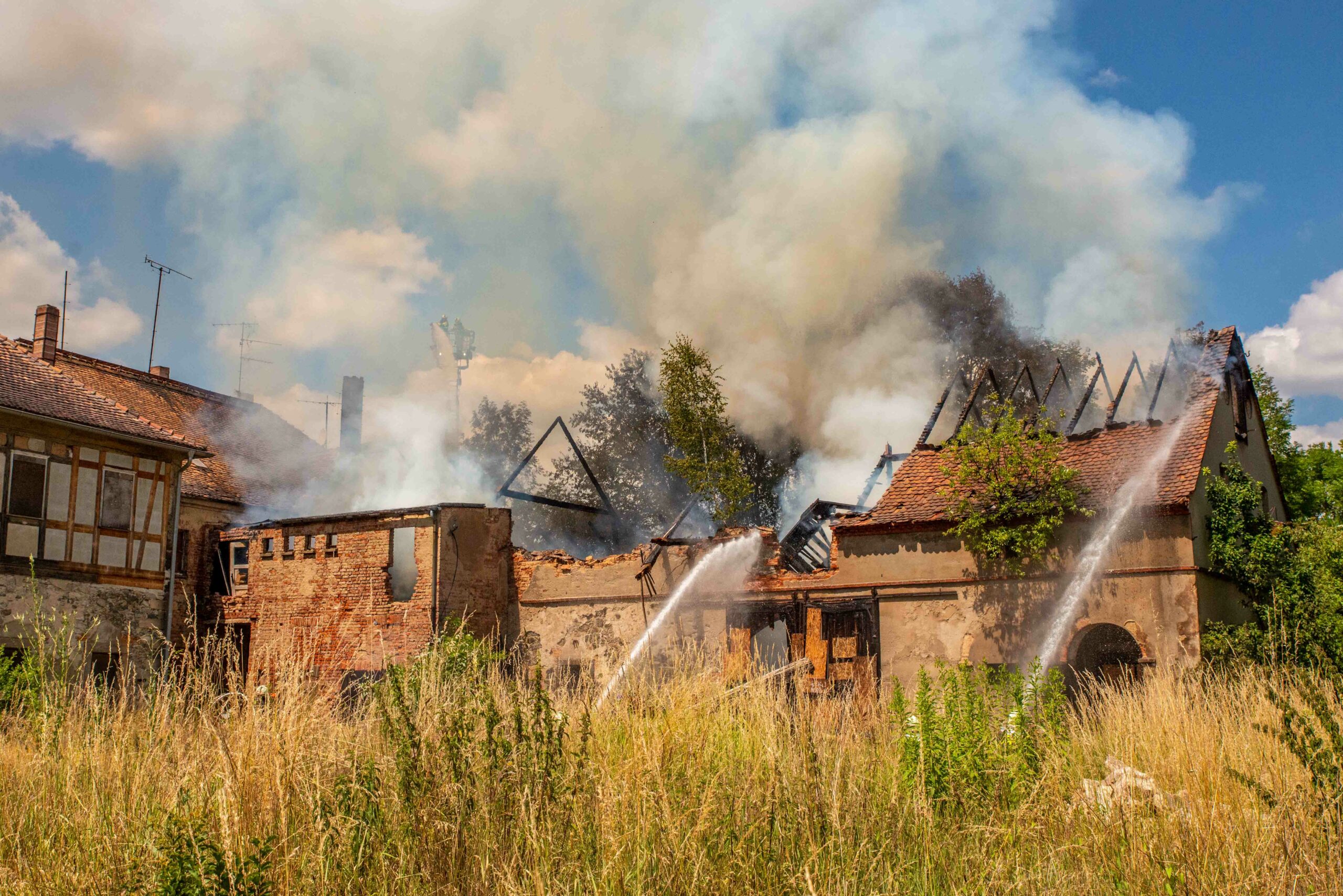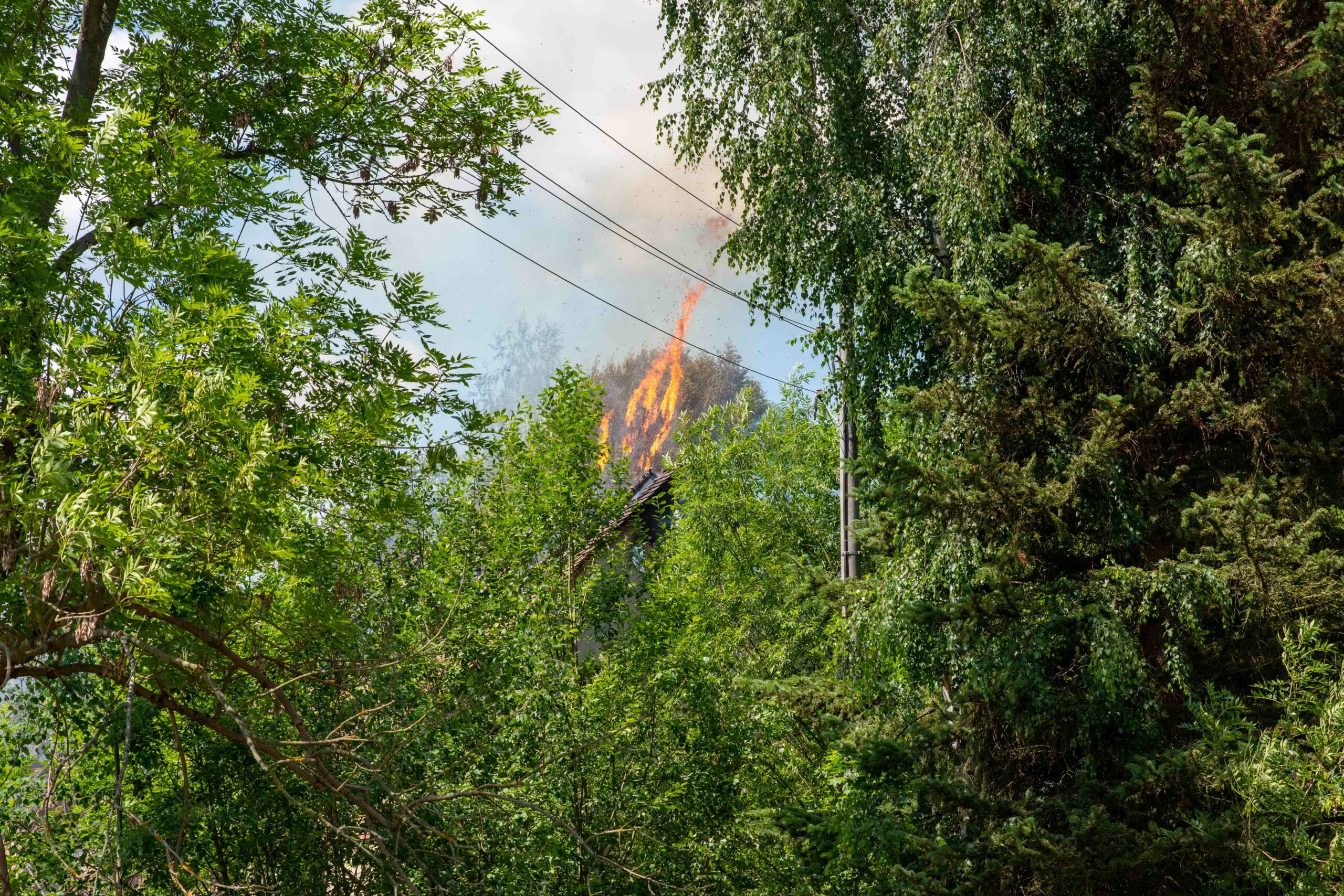 Zeitnah brach das Dach des Gebäudes ein, Flammen griffen dabei auf einen Baumwipfel über.