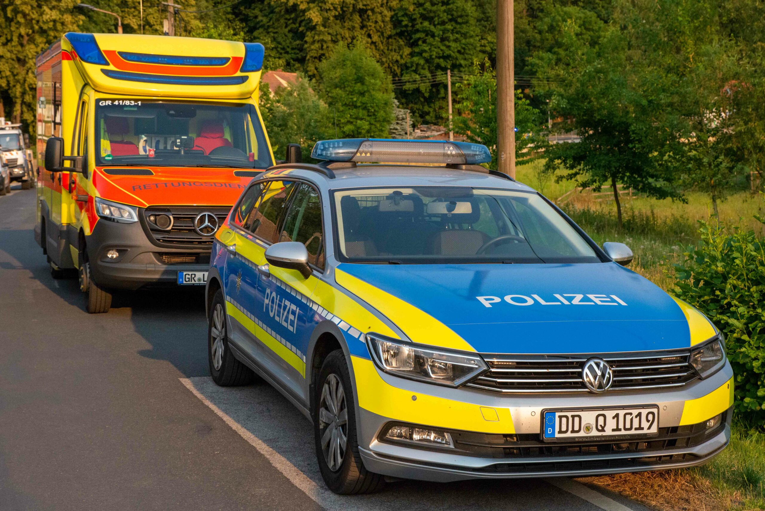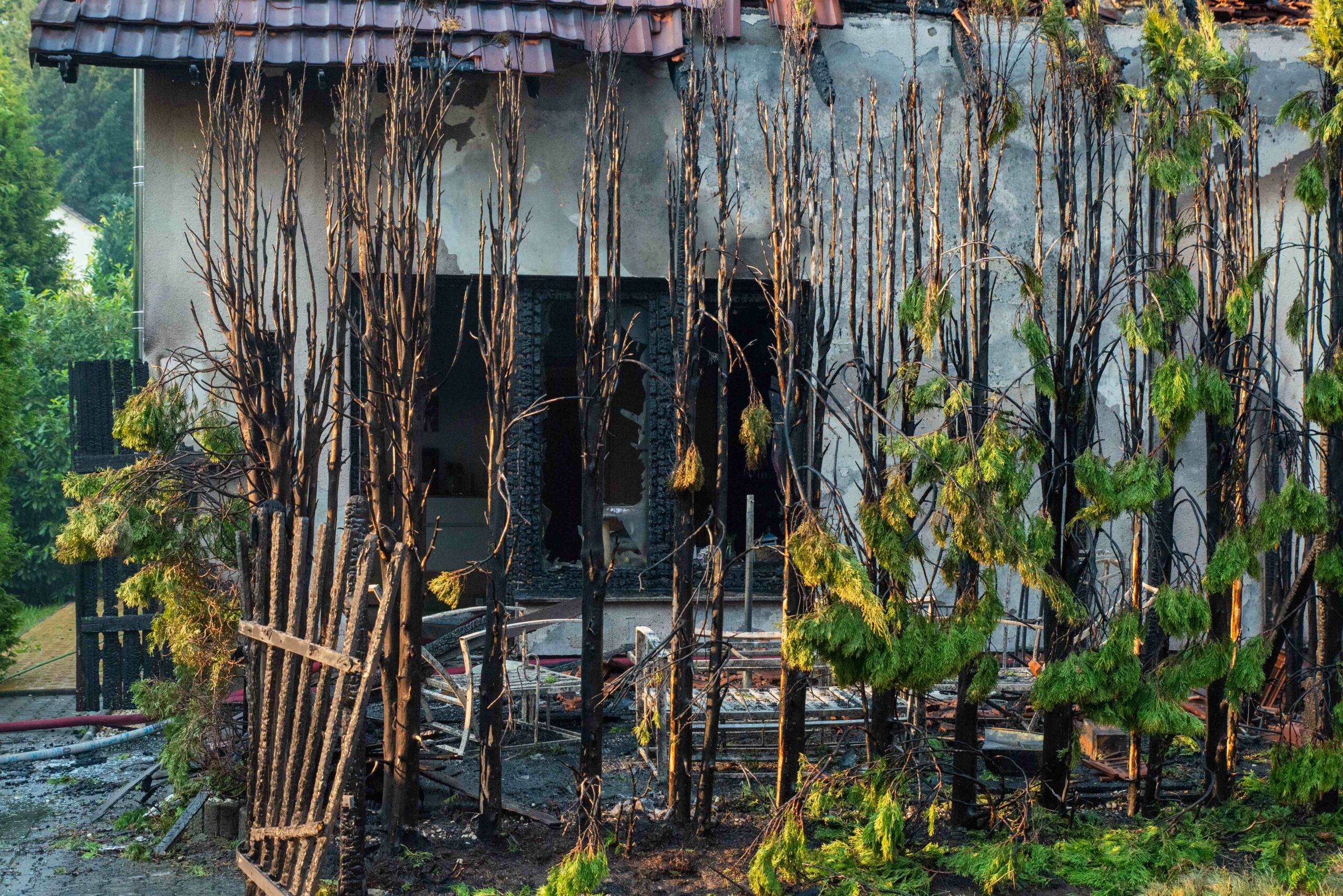 Am späten Sonntagnachmittag kam es zu einem Großeinsatz für die Feuerwehren um Ebersbach. Der 52- jähriger Bewohner eines Wohnhauses wollte das Grundstück pflegen und hatte dazu Unkraut mit einem Gasbrenner abgeflämmt. Dann nahm das Unheil seinen Lauf: Eine Koniferen Hecke geriet in Brand. Die Flammen zogen unter die Dachhaut und auch der Eingangsbereich der Terrasse wurde durch den Brand stark beschädigt. Beim Eintreffen der ersten Kräfte stand die Hecke in Vollbrand, so der Einsatzleiter der Feuerwehr Schöpstal. Alle Bewohner waren zu diesem Zeitpunkt aus dem Wohnhaus raus gewesen, „nur“ drei Katzen waren noch im Gebäude. Zwei dieser konnten durch die Feuerwehr gerettet werden, die dritte schien geflüchtet zu sein – war nicht auffindbar. Nachdem die äußerlichen Flammen gelöscht waren, untersuchten die Kameraden Wände und Dach mit einer Wärmebildkamera. In diesem Zusammenhang war die Öffnung der Dachhaut notwendig geworden. Hierzu kam die Drehleiter der Berufsfeuerwehr Görlitz zum Einsatz, nachdem der Strom der dort verlaufenden Leitung abgestellte wurde. Versteckte Glutnester wurden mit der Wärmebildkamera aufgespürt und abgelöscht.