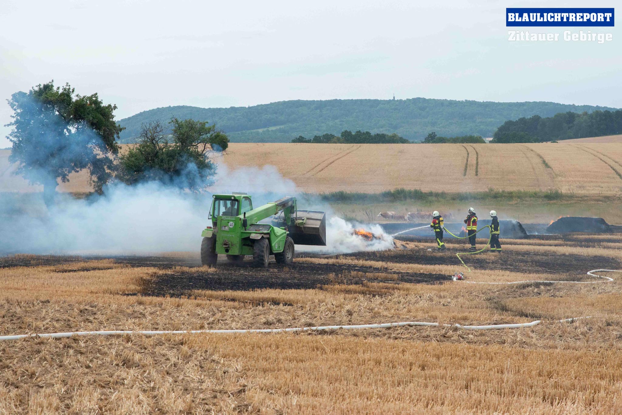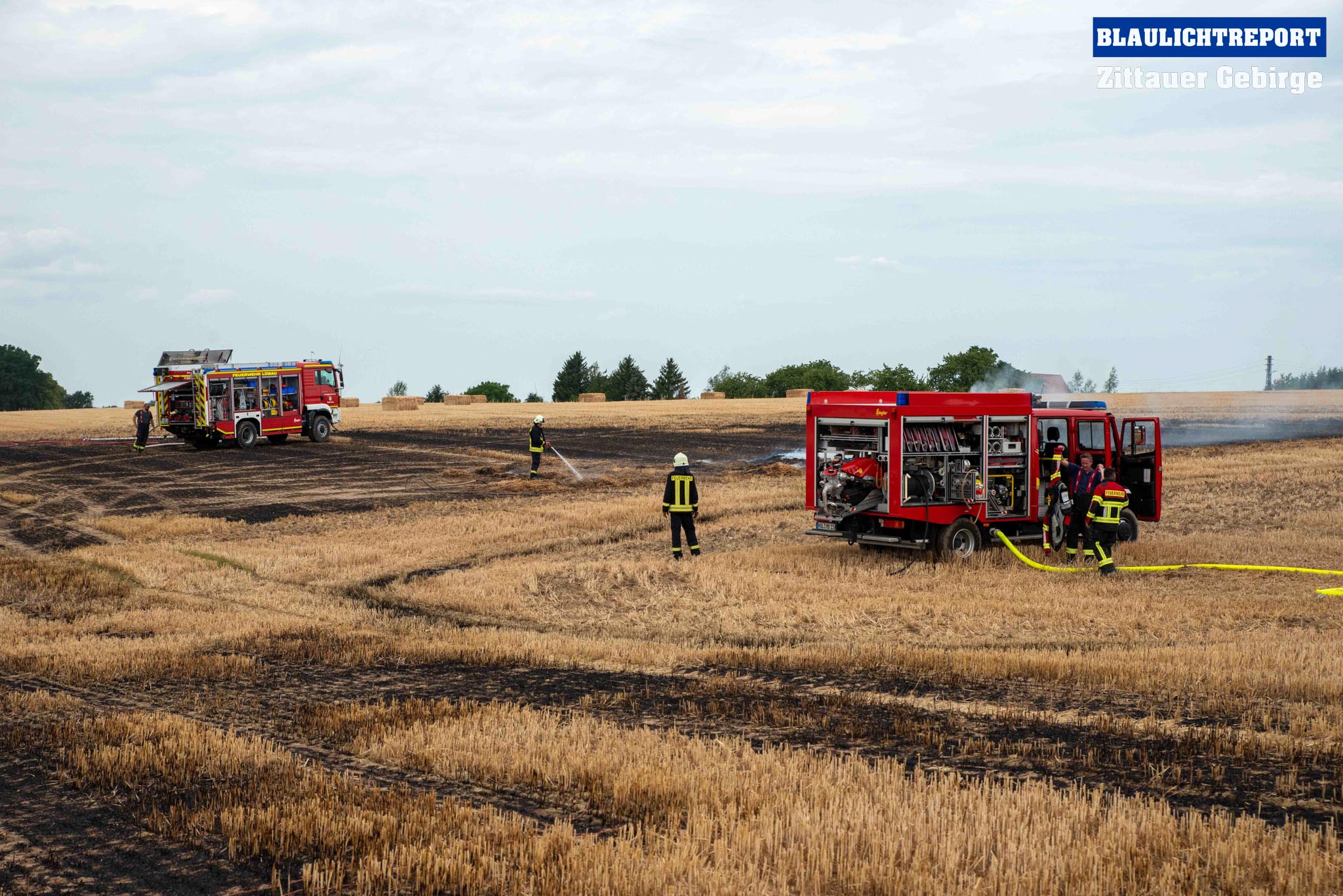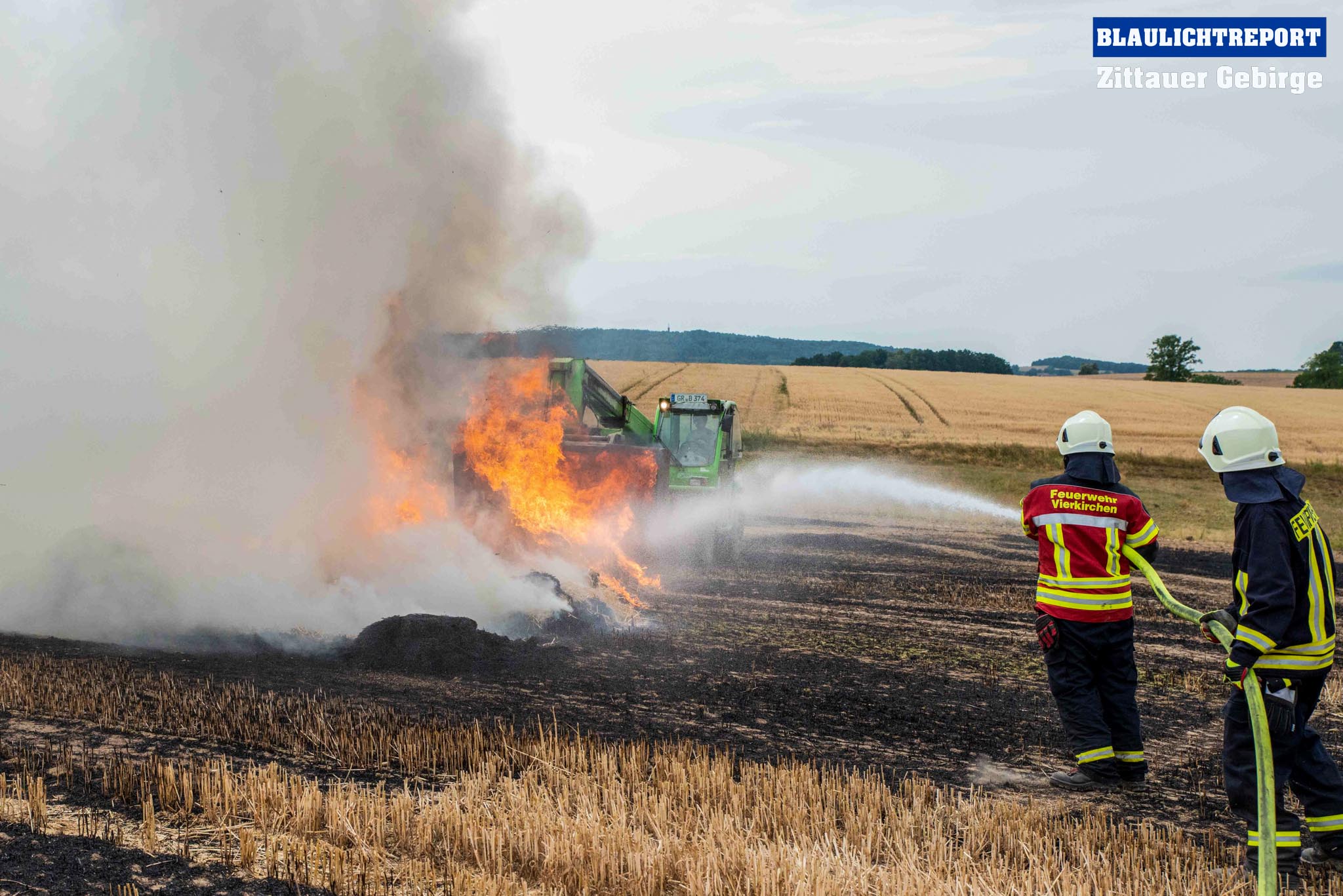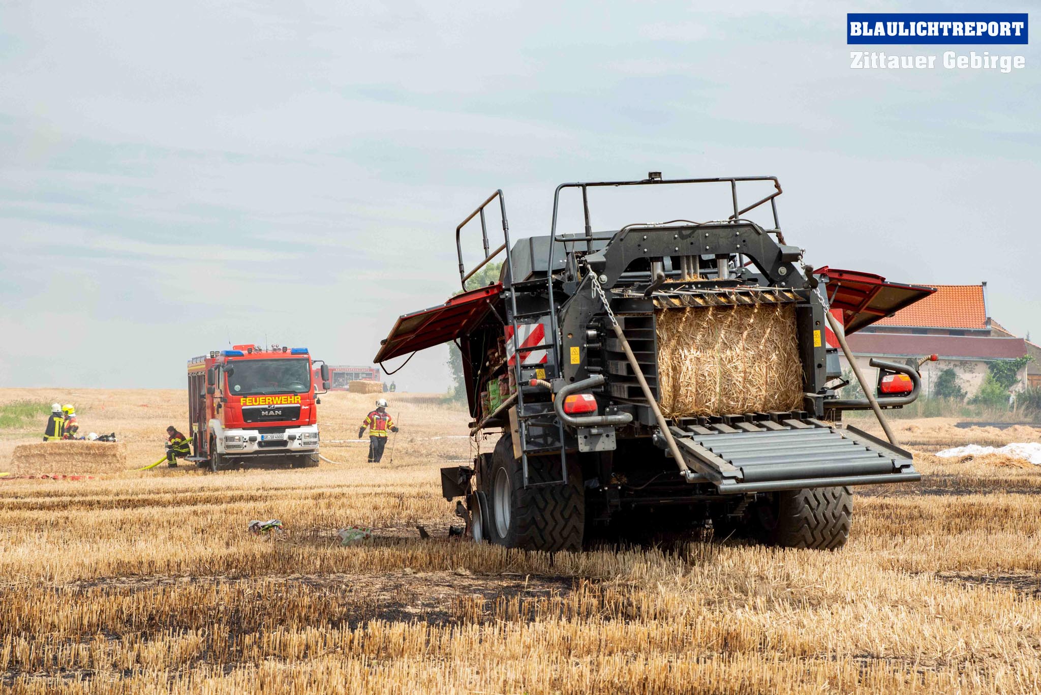Schöps – Am Montagvormittag kam es zu einem Brand an einer Strohballenpresse. Ein Landwirt war mit der Erntemaschine auf einem Feld an der S 111 im Einsatz, als das Gerät plötzlich zu brennen begann. Die Rettungsleitstelle Ostsachsen alarmierte nach dem Notruf die Feuerwehren Reichenbach, Sohland, Mengelsdorf-Biesig, Krobnitz-Meuselwitz, Buchholz-Tetta, Zoblitz und Löbau. Insgesamt kamen 39 Kameraden aus 7 Ortswehren zum Einsatz. Trotz des schnellen Einsatzes breitete sich das Feuer durch den Wind rasch auf dem Stoppelfeld aus, drohte auf ein Gebäude zuzulaufen und auf dieses überzugreifen. Beim Eintreffen erfolgte sofort eine Riegelstellung. Durch diese konnte ein Übergreifen auf das mit Holz verschalte Gebäude verhindert werden. Indes kümmerten sich weitere Kameraden um eine stabile Wasserversorgung, für die ein Unterflurhydrant an der S111 angezapft wurde. Weiter wurde die Brandbekämpfung, teils unter schwerem Atemschutz, auf dem restlichen Feld aufgenommen. Etwa 6.000m2 Stoppelfeld und mehrere Ballen begannen zu brennen und fielen so den Flammen zum Opfer. Der Wind trieb das Feuer ordentlich an. Mit Technik unterstützte der Landwirt bei den Löschabreiten. Die Strohballen mussten für das Ablöschen auseinandergezogen werden.