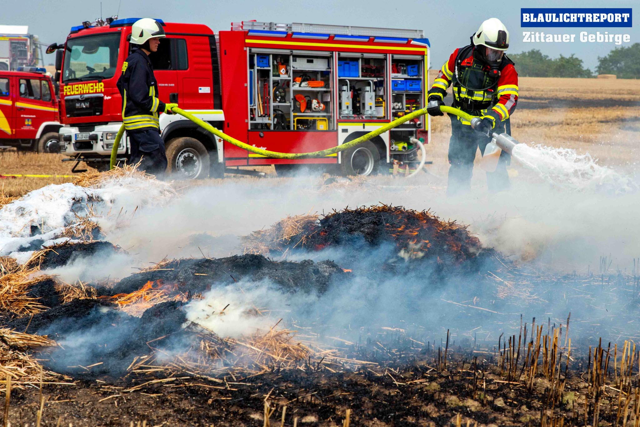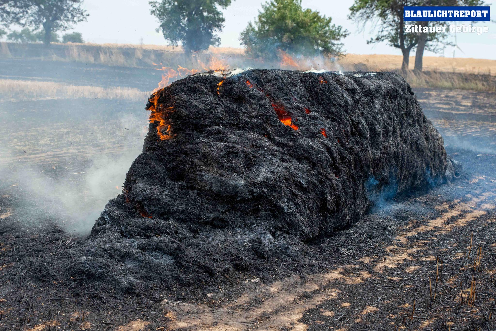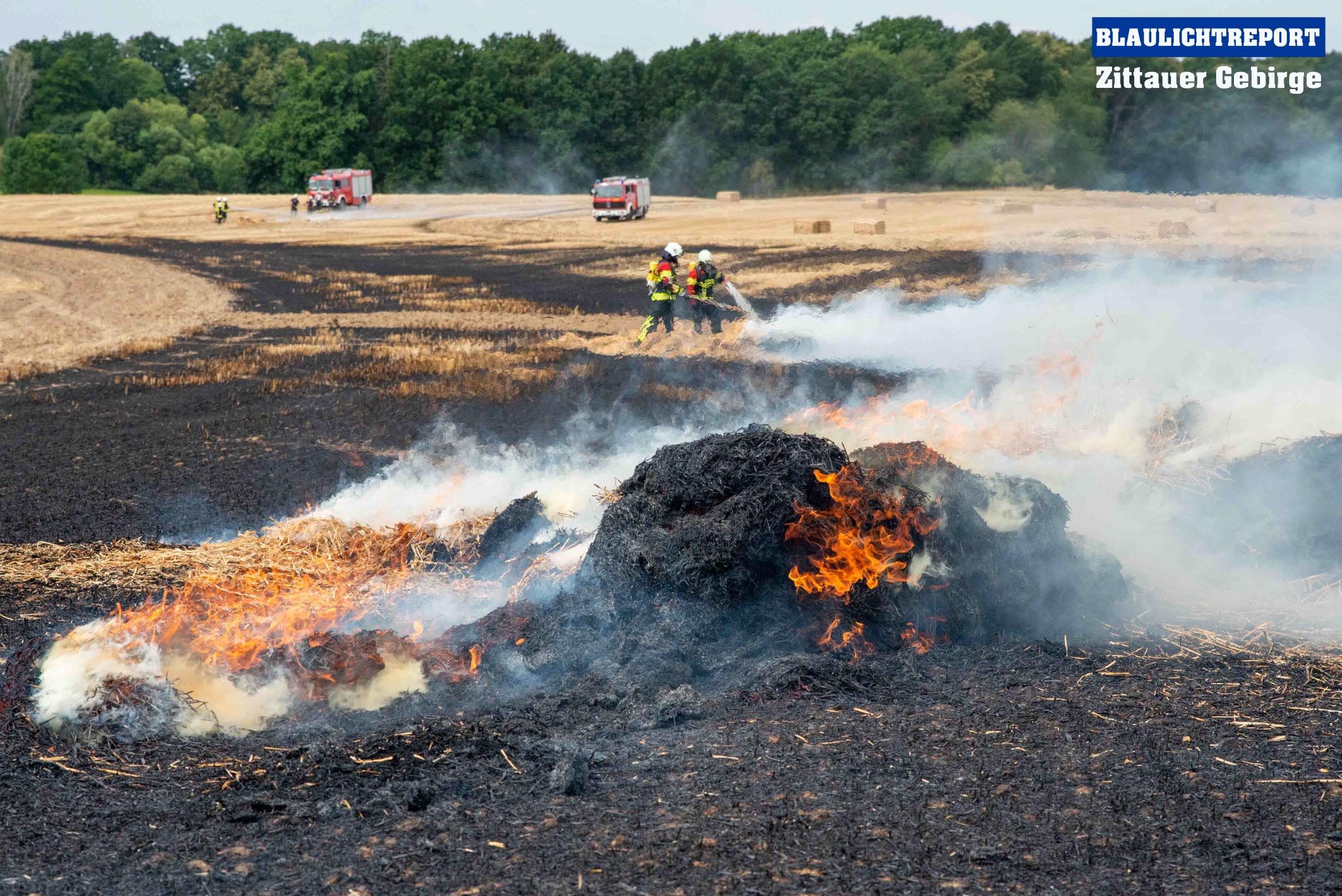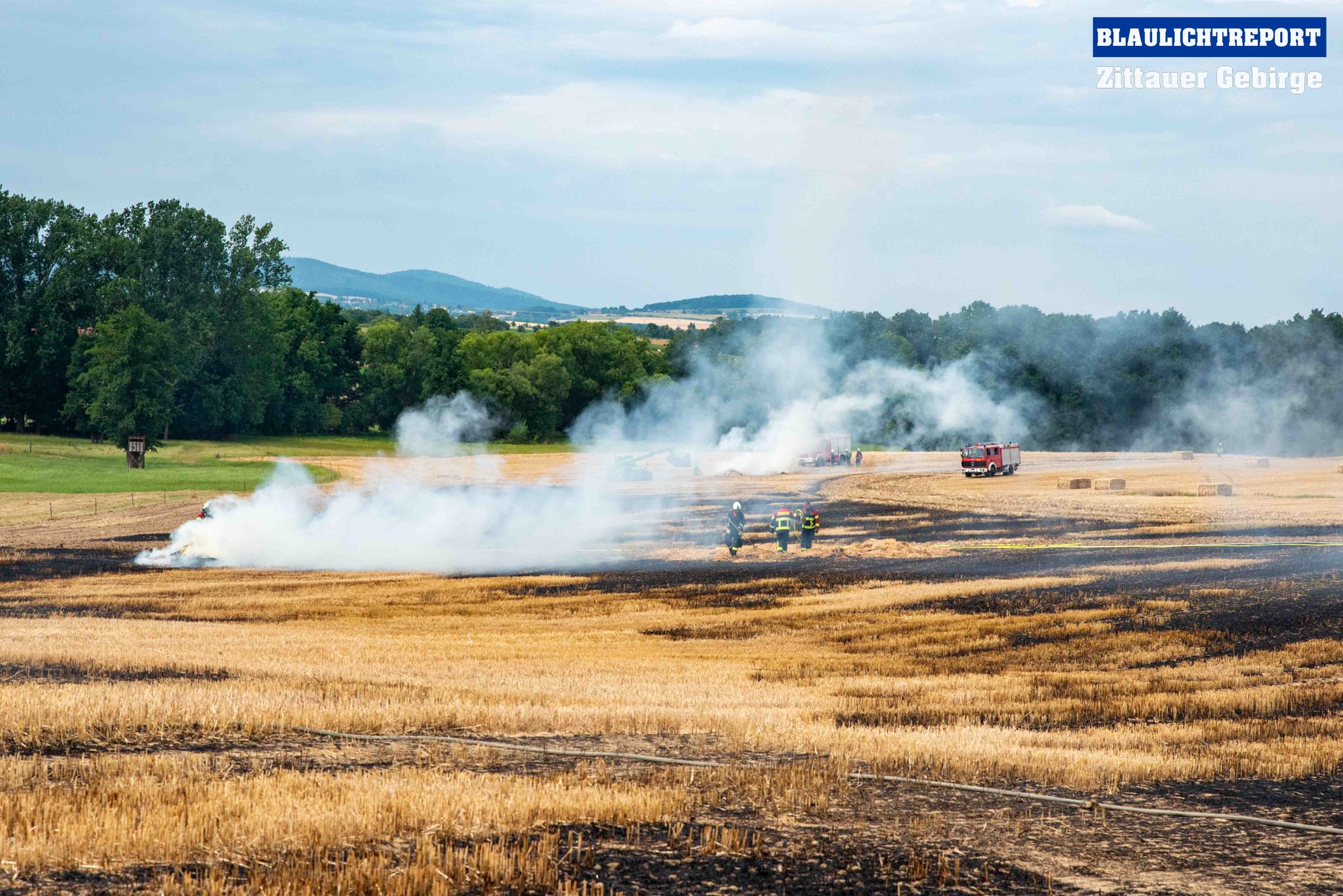 Schöps – Am Montagvormittag kam es zu einem Brand an einer Strohballenpresse. Ein Landwirt war mit der Erntemaschine auf einem Feld an der S 111 im Einsatz, als das Gerät plötzlich zu brennen begann. Die Rettungsleitstelle Ostsachsen alarmierte nach dem Notruf die Feuerwehren Reichenbach, Sohland, Mengelsdorf-Biesig, Krobnitz-Meuselwitz, Buchholz-Tetta, Zoblitz und Löbau. Insgesamt kamen 39 Kameraden aus 7 Ortswehren zum Einsatz. Trotz des schnellen Einsatzes breitete sich das Feuer durch den Wind rasch auf dem Stoppelfeld aus, drohte auf ein Gebäude zuzulaufen und auf dieses überzugreifen. Beim Eintreffen erfolgte sofort eine Riegelstellung. Durch diese konnte ein Übergreifen auf das mit Holz verschalte Gebäude verhindert werden. Indes kümmerten sich weitere Kameraden um eine stabile Wasserversorgung, für die ein Unterflurhydrant an der S111 angezapft wurde. Weiter wurde die Brandbekämpfung, teils unter schwerem Atemschutz, auf dem restlichen Feld aufgenommen. Etwa 6.000m2 Stoppelfeld und mehrere Ballen begannen zu brennen und fielen so den Flammen zum Opfer. Der Wind trieb das Feuer ordentlich an. Mit Technik unterstützte der Landwirt bei den Löschabreiten. Die Strohballen mussten für das Ablöschen auseinandergezogen werden.