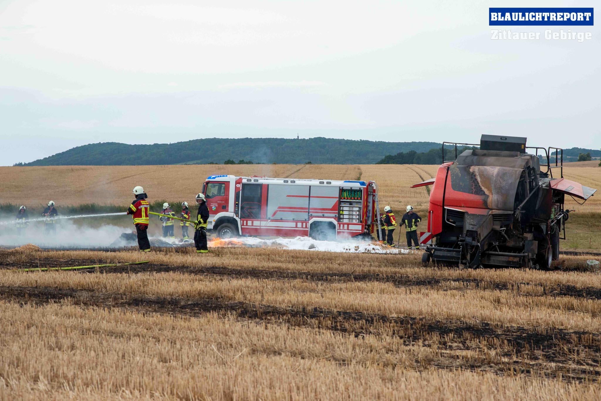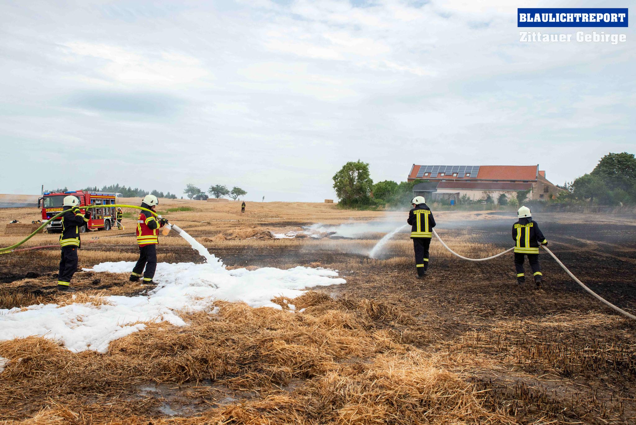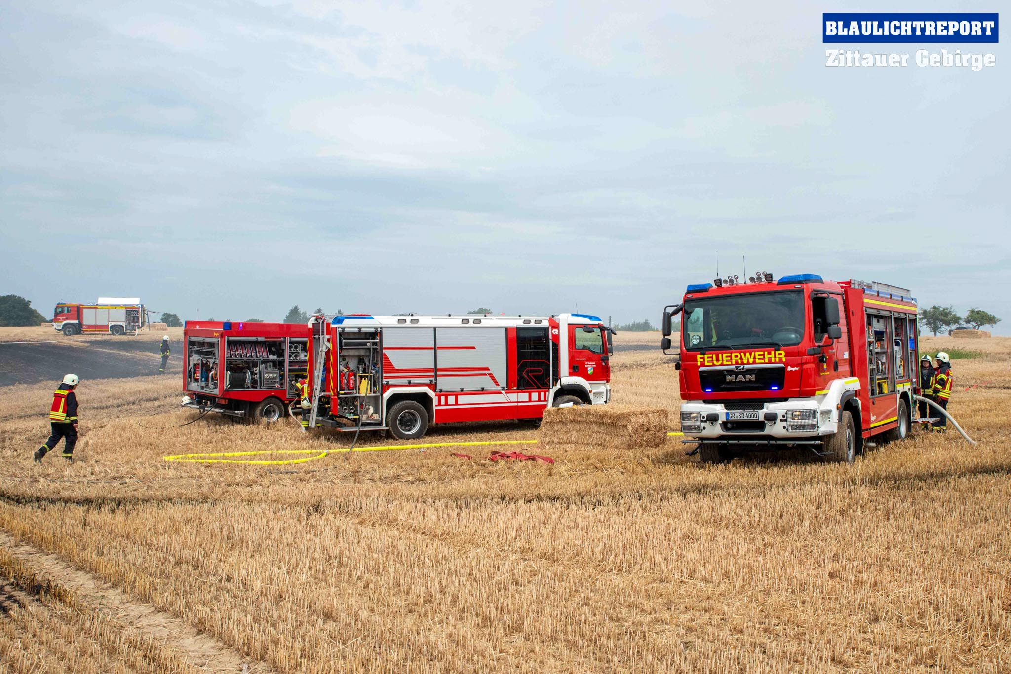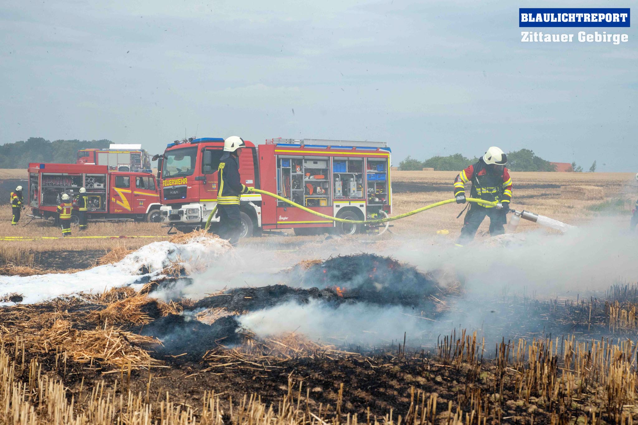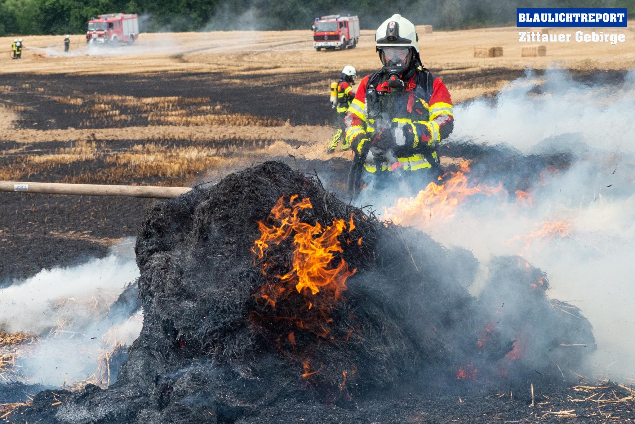 Schöps – Am Montagvormittag kam es zu einem Brand an einer Strohballenpresse. Ein Landwirt war mit der Erntemaschine auf einem Feld an der S 111 im Einsatz, als das Gerät plötzlich zu brennen begann. Die Rettungsleitstelle Ostsachsen alarmierte nach dem Notruf die Feuerwehren Reichenbach, Sohland, Mengelsdorf-Biesig, Krobnitz-Meuselwitz, Buchholz-Tetta, Zoblitz und Löbau. Insgesamt kamen 39 Kameraden aus 7 Ortswehren zum Einsatz. Trotz des schnellen Einsatzes breitete sich das Feuer durch den Wind rasch auf dem Stoppelfeld aus, drohte auf ein Gebäude zuzulaufen und auf dieses überzugreifen. Beim Eintreffen erfolgte sofort eine Riegelstellung. Durch diese konnte ein Übergreifen auf das mit Holz verschalte Gebäude verhindert werden. Indes kümmerten sich weitere Kameraden um eine stabile Wasserversorgung, für die ein Unterflurhydrant an der S111 angezapft wurde. Weiter wurde die Brandbekämpfung, teils unter schwerem Atemschutz, auf dem restlichen Feld aufgenommen. Etwa 6.000m2 Stoppelfeld und mehrere Ballen begannen zu brennen und fielen so den Flammen zum Opfer. Der Wind trieb das Feuer ordentlich an. Mit Technik unterstützte der Landwirt bei den Löschabreiten. Die Strohballen mussten für das Ablöschen auseinandergezogen werden.
