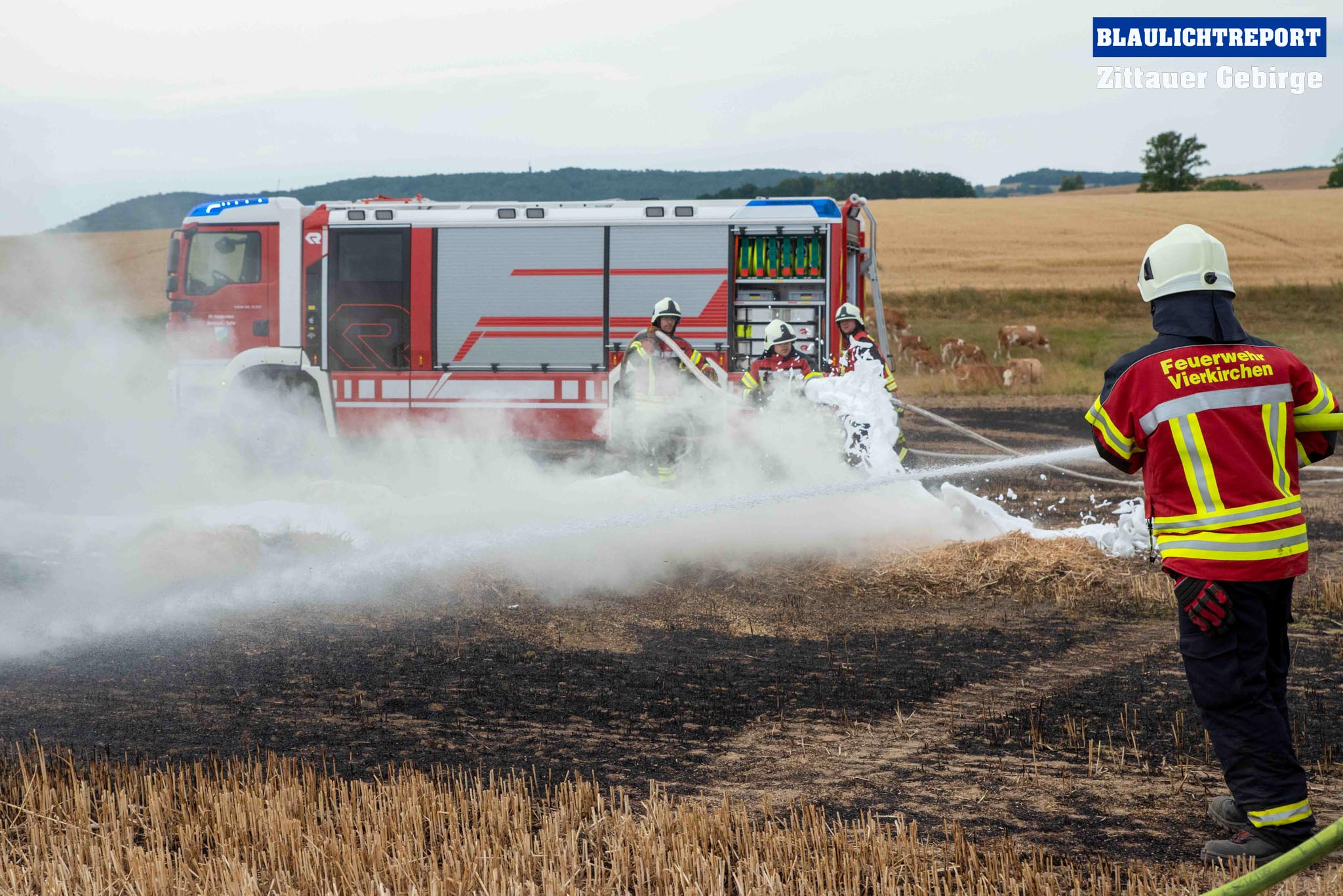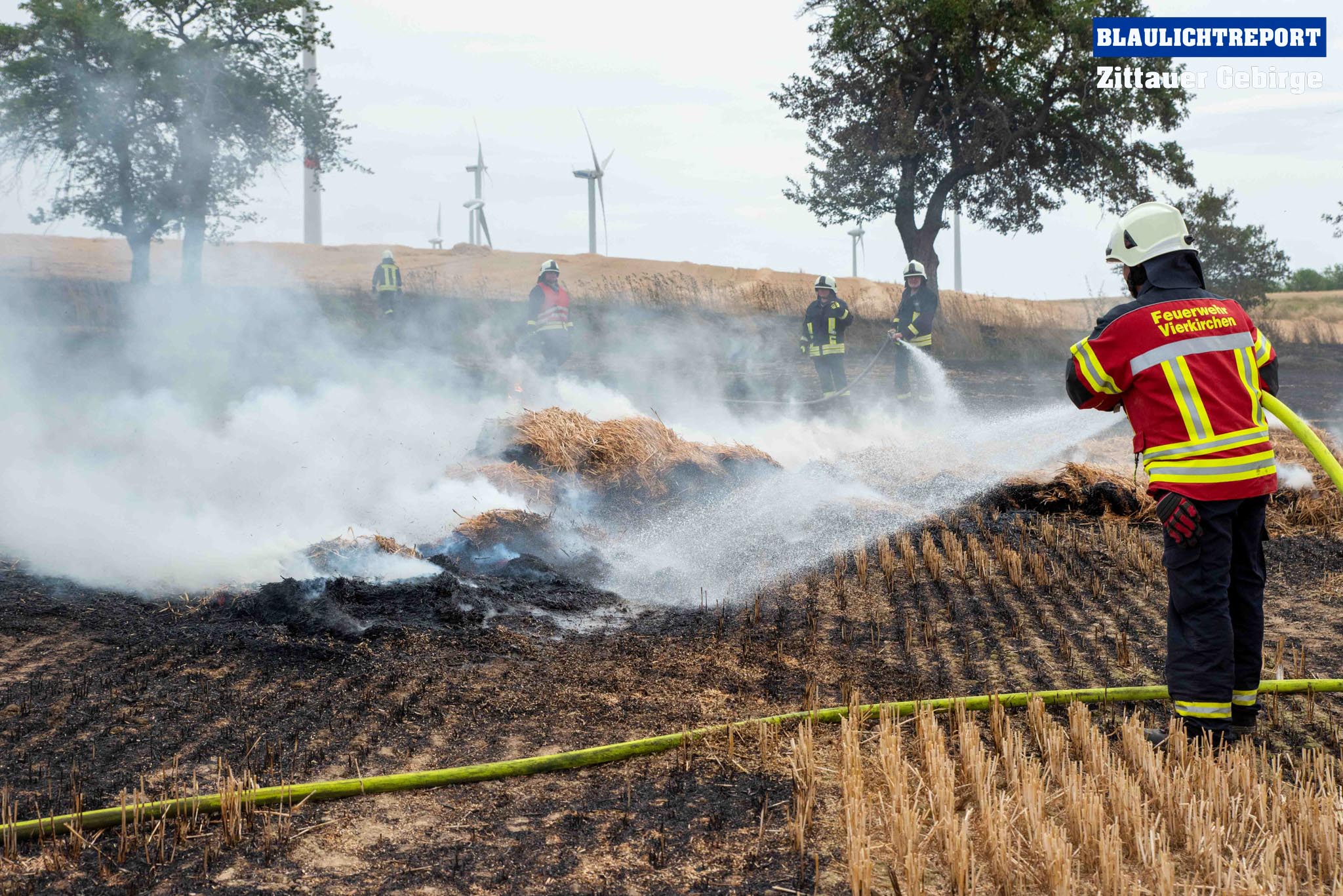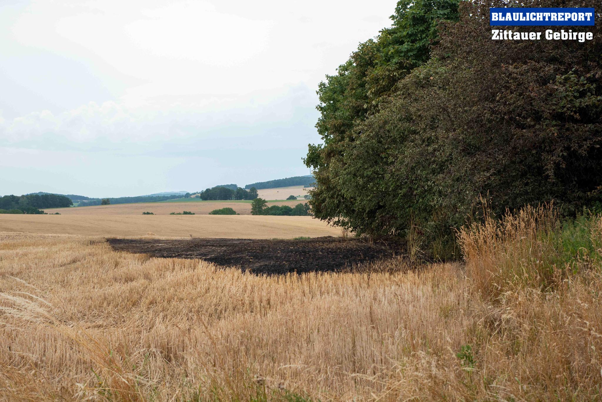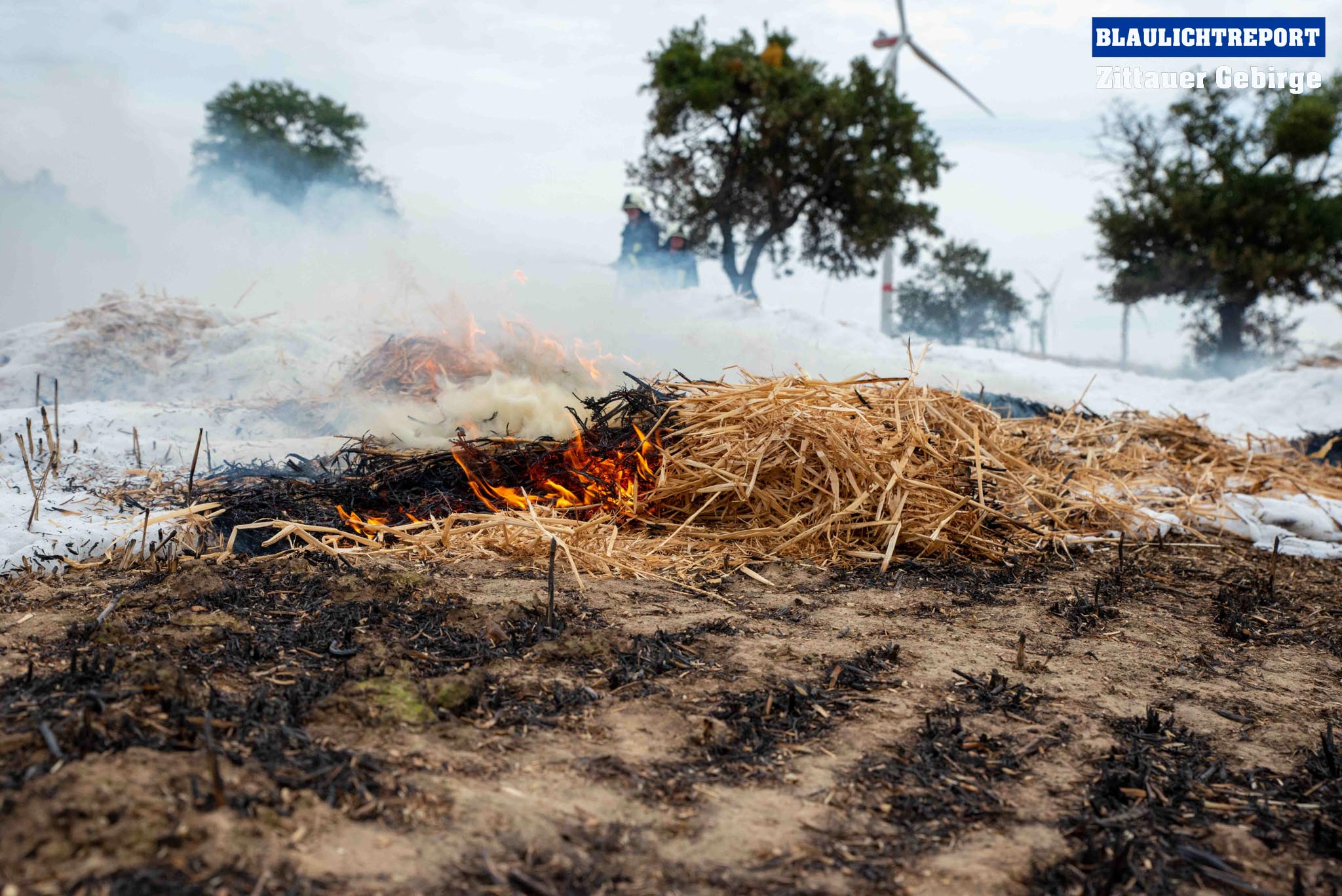 Schöps – Am Montagvormittag kam es zu einem Brand an einer Strohballenpresse. Ein Landwirt war mit der Erntemaschine auf einem Feld an der S 111 im Einsatz, als das Gerät plötzlich zu brennen begann. Die Rettungsleitstelle Ostsachsen alarmierte nach dem Notruf die Feuerwehren Reichenbach, Sohland, Mengelsdorf-Biesig, Krobnitz-Meuselwitz, Buchholz-Tetta, Zoblitz und Löbau. Insgesamt kamen 39 Kameraden aus 7 Ortswehren zum Einsatz. Trotz des schnellen Einsatzes breitete sich das Feuer durch den Wind rasch auf dem Stoppelfeld aus, drohte auf ein Gebäude zuzulaufen und auf dieses überzugreifen. Beim Eintreffen erfolgte sofort eine Riegelstellung. Durch diese konnte ein Übergreifen auf das mit Holz verschalte Gebäude verhindert werden. Indes kümmerten sich weitere Kameraden um eine stabile Wasserversorgung, für die ein Unterflurhydrant an der S111 angezapft wurde. Weiter wurde die Brandbekämpfung, teils unter schwerem Atemschutz, auf dem restlichen Feld aufgenommen. Etwa 6.000m2 Stoppelfeld und mehrere Ballen begannen zu brennen und fielen so den Flammen zum Opfer. Der Wind trieb das Feuer ordentlich an. Mit Technik unterstützte der Landwirt bei den Löschabreiten. Die Strohballen mussten für das Ablöschen auseinandergezogen werden.