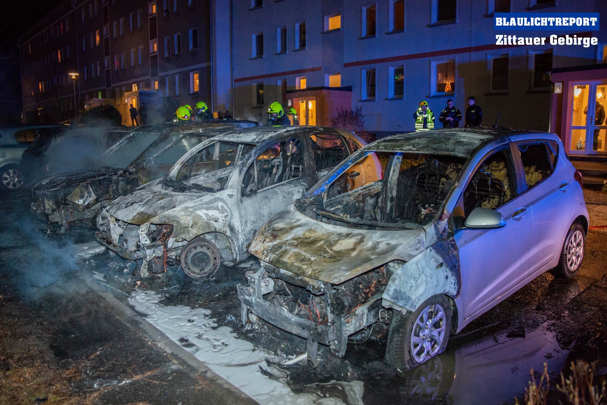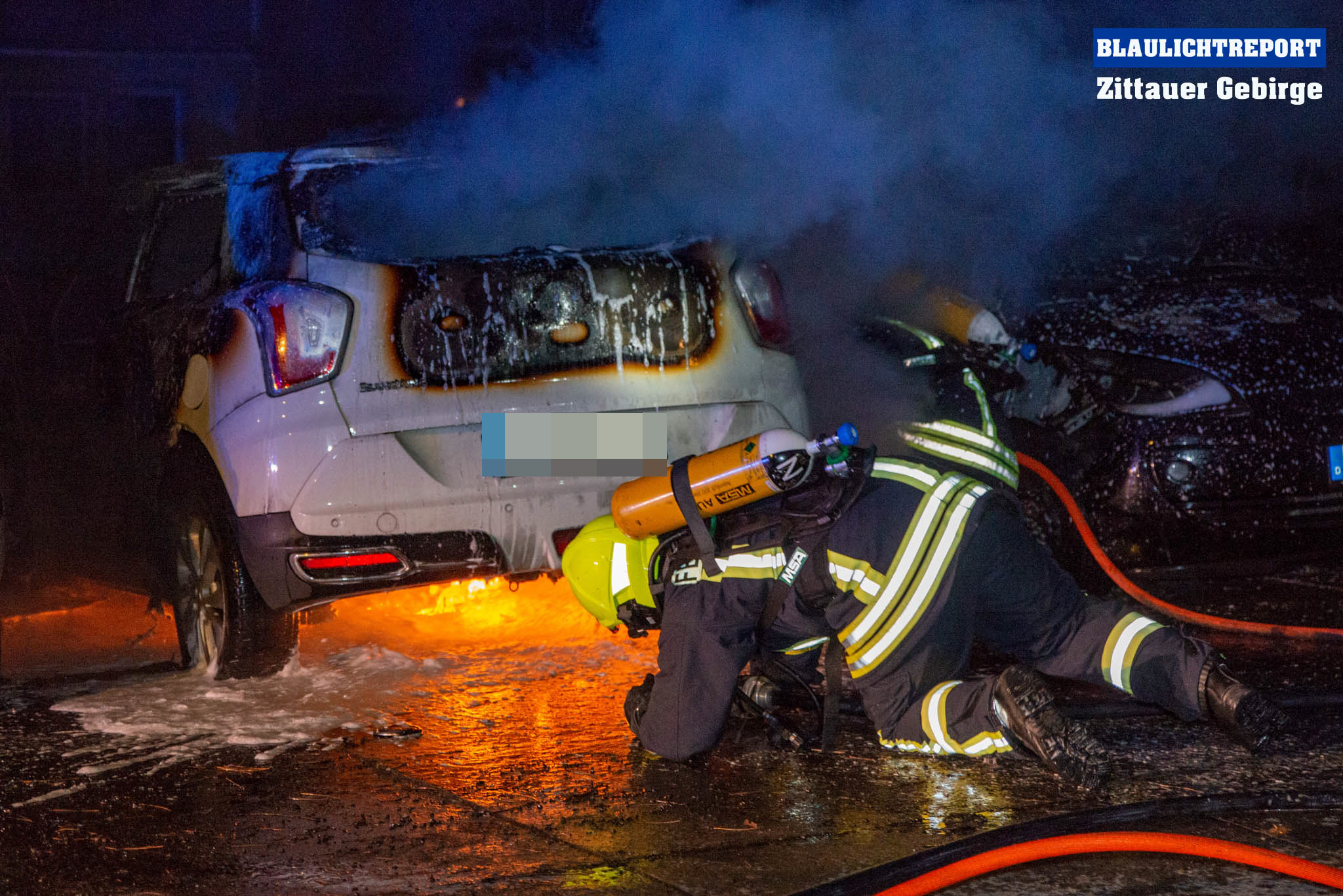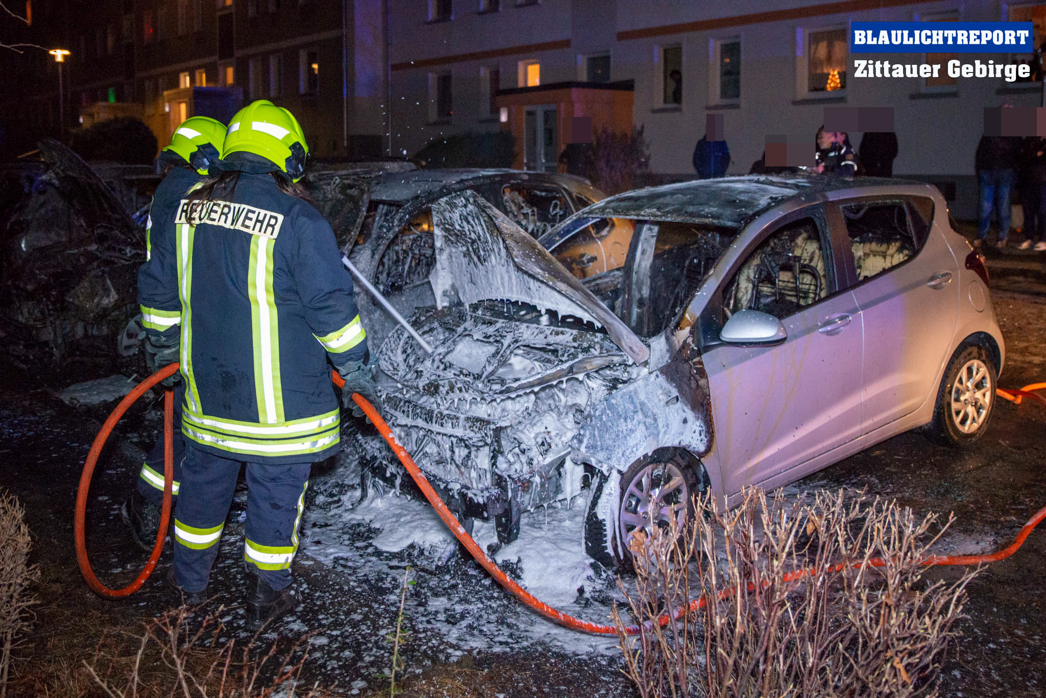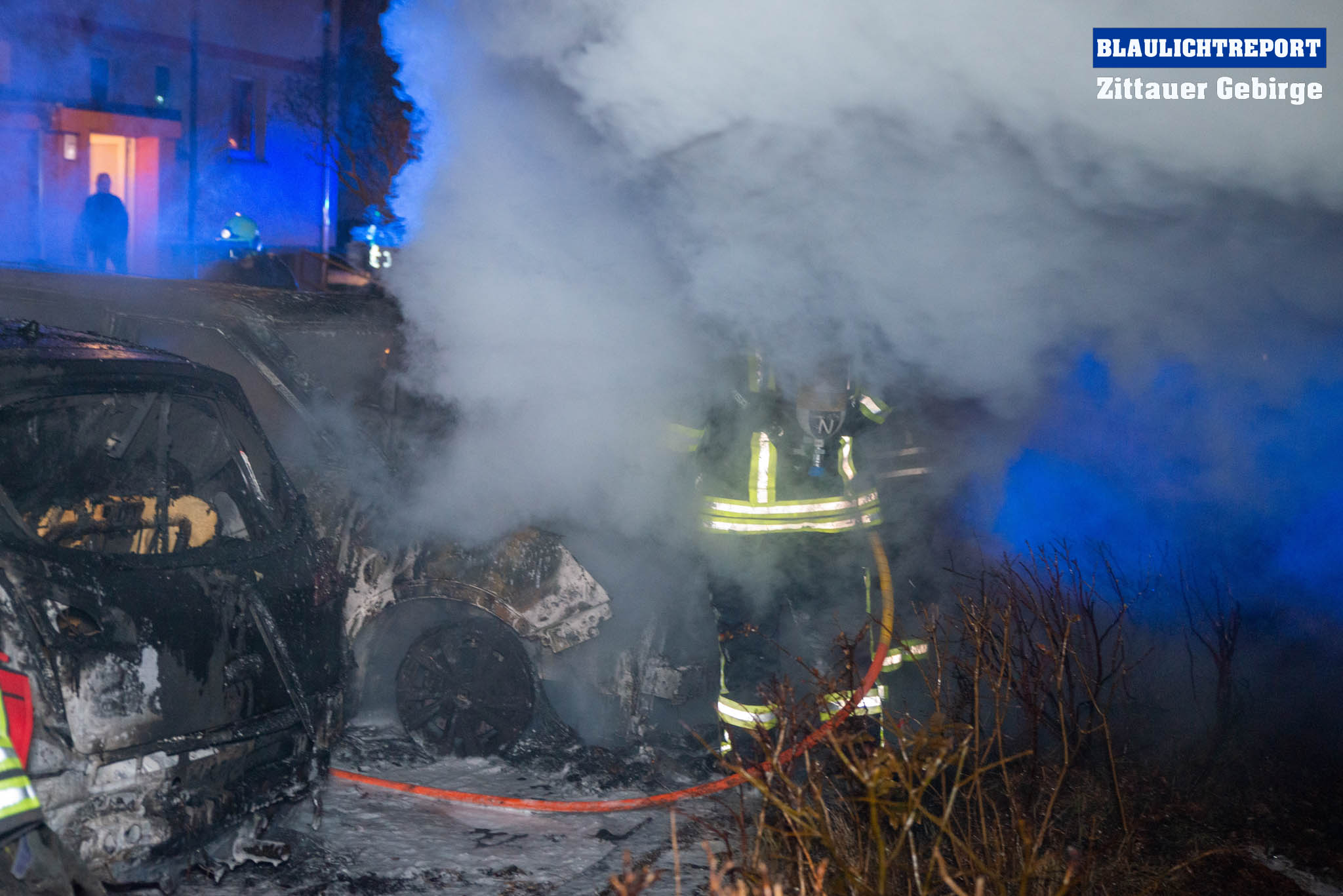 Sie saßen alle in gemütlicher Runde bei der Weihnachtsfeier zusammen, da ging die Sirene. Die Feuerwehrleute aus Großschönau saßen bei ihren Kameraden im tschechischen Varsndorf, als sie kurz nach 19 Uhr zu einem brennenden Pkw in die Buchbergstraße alarmiert wurden. Wenige Minuten später gab es erneut einen Alarm, zu dem auch die Kameraden aus Waltersdorf alarmiert wurden, wie der Pressesprecher des Kreisfeuerwehrverbandes Görlitz mitteilte. Der Brand, der offenbar einen Citroen gelegt wurde, griff auf einen danebenstehenden Hyundai, einen Honda und ein SsangYong über, weshalb eine Stichworterhöhung vorgenommen wurde. Vor Ort eingetroffen, bestätigt die sich die Lage. 4 Fahrzeuge standen in Vollbrand. Unter schwerem Atemschutz wurde unverzüglich die Brandbekämpfung eingeleitet. Das Feuer drohte auf ein fünftes Fahrzeug überzugreifen, was durch das Handeln der Kameraden aber verhindert werden konnte. Nachdem der Brand gelöscht war, wurden die Fahrzeuge mit Schaum geflutet, um ein erneutes Aufflammen zu verhindern. Ein Brandursachenermittler wird sich mit dem Fall befassen. Wie die Polizei mittlerweile mitteilt, hat sie Ermittlungen wegen des Verdachts der Brandstiftung aufgenommen. Es entstand ein Schaden von etwa 50.000€.