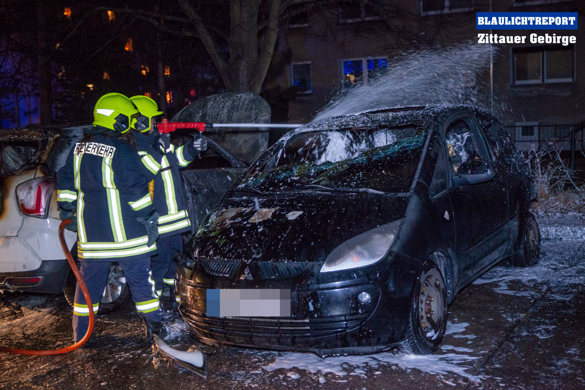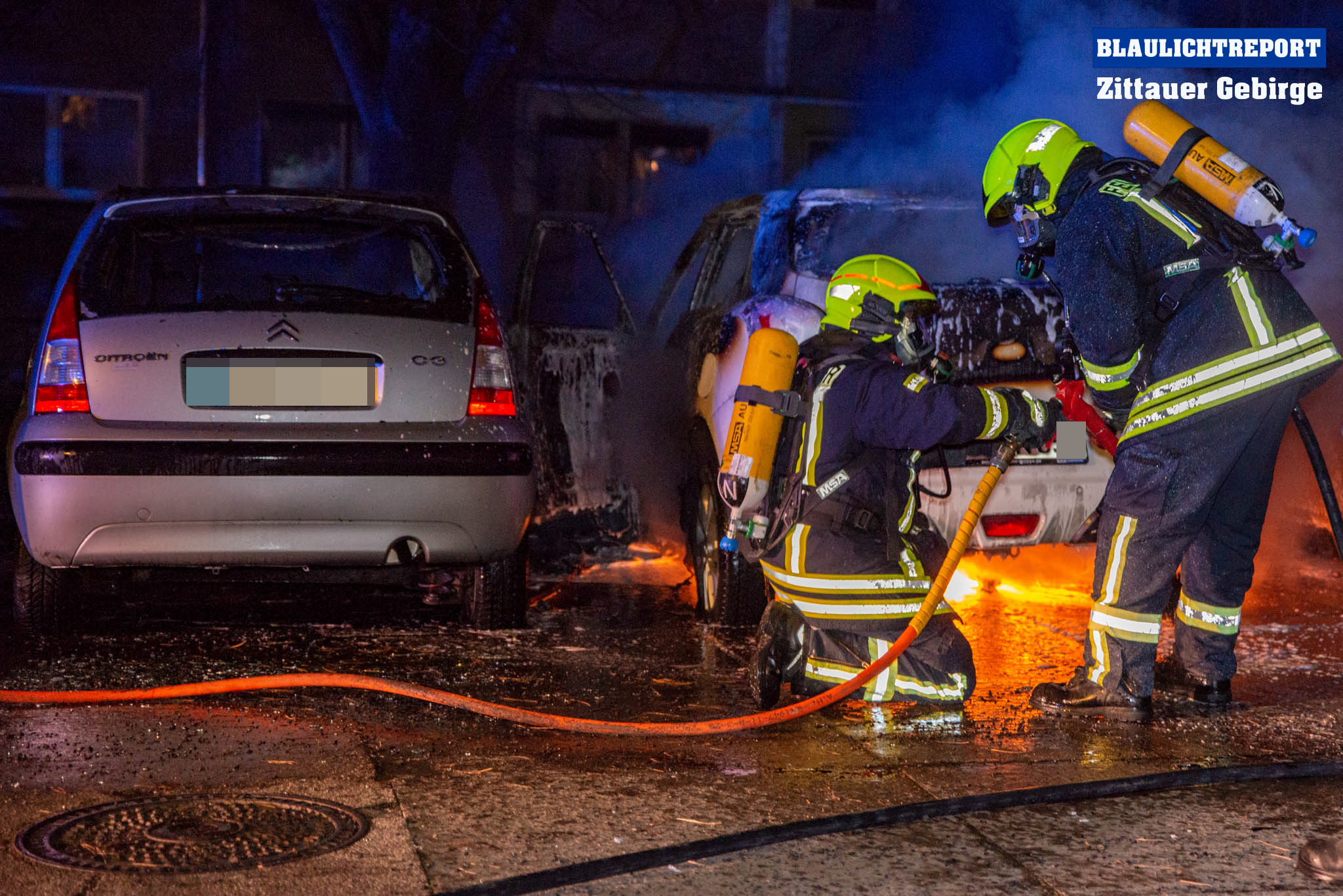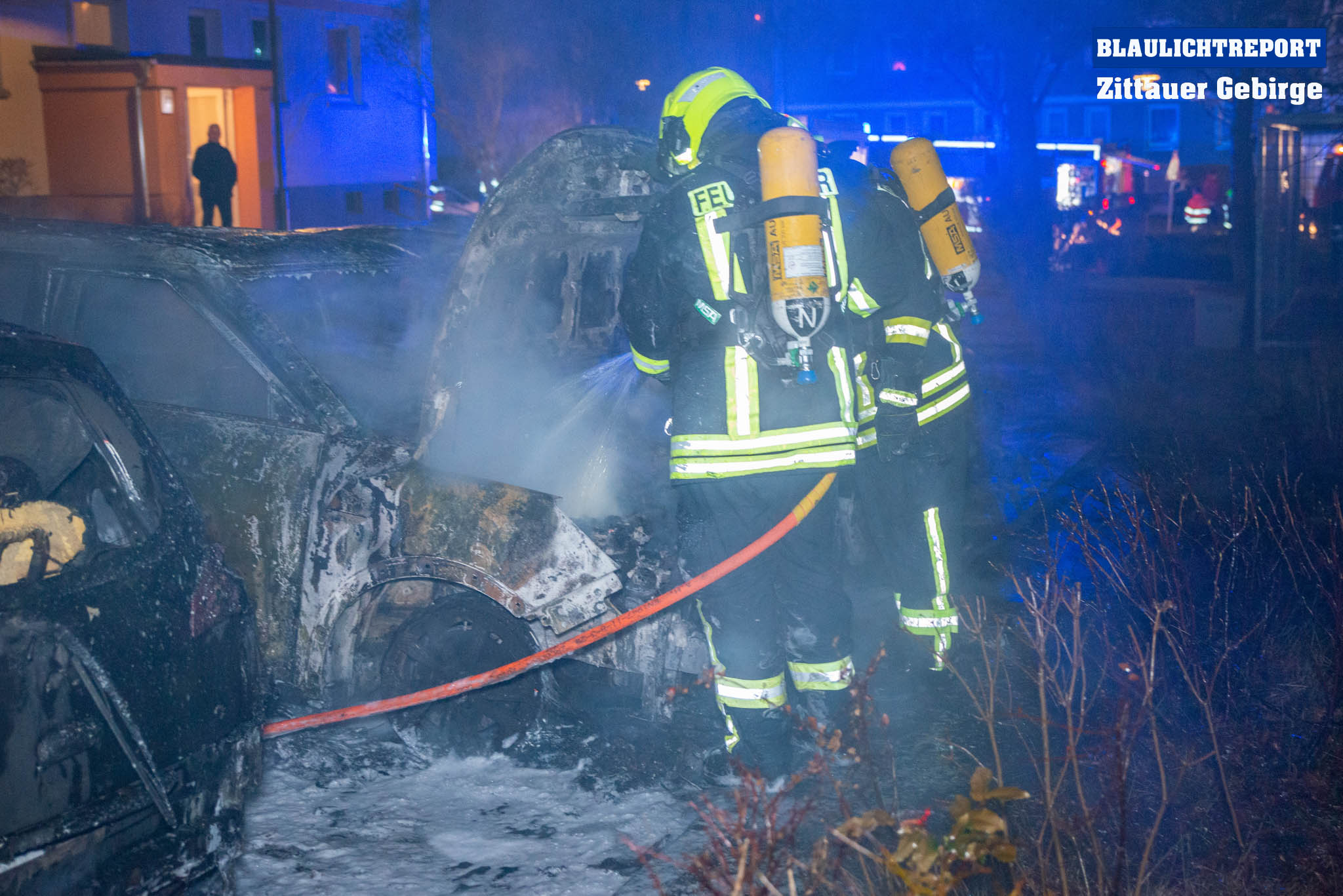 Sie saßen alle in gemütlicher Runde bei der Weihnachtsfeier zusammen, da ging die Sirene. Die Feuerwehrleute aus Großschönau saßen bei ihren Kameraden im tschechischen Varsndorf, als sie kurz nach 19 Uhr zu einem brennenden Pkw in die Buchbergstraße alarmiert wurden. Wenige Minuten später gab es erneut einen Alarm, zu dem auch die Kameraden aus Waltersdorf alarmiert wurden, wie der Pressesprecher des Kreisfeuerwehrverbandes Görlitz mitteilte. Der Brand, der offenbar einen Citroen gelegt wurde, griff auf einen danebenstehenden Hyundai, einen Honda und ein SsangYong über, weshalb eine Stichworterhöhung vorgenommen wurde. Vor Ort eingetroffen, bestätigt die sich die Lage. 4 Fahrzeuge standen in Vollbrand. Unter schwerem Atemschutz wurde unverzüglich die Brandbekämpfung eingeleitet. Das Feuer drohte auf ein fünftes Fahrzeug überzugreifen, was durch das Handeln der Kameraden aber verhindert werden konnte. Nachdem der Brand gelöscht war, wurden die Fahrzeuge mit Schaum geflutet, um ein erneutes Aufflammen zu verhindern. Ein Brandursachenermittler wird sich mit dem Fall befassen. Wie die Polizei mittlerweile mitteilt, hat sie Ermittlungen wegen des Verdachts der Brandstiftung aufgenommen. Es entstand ein Schaden von etwa 50.000€.