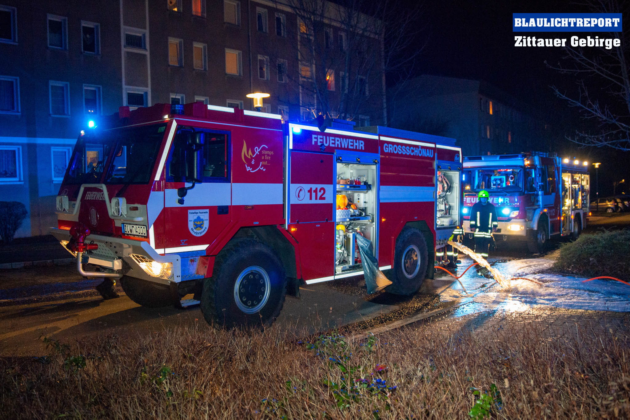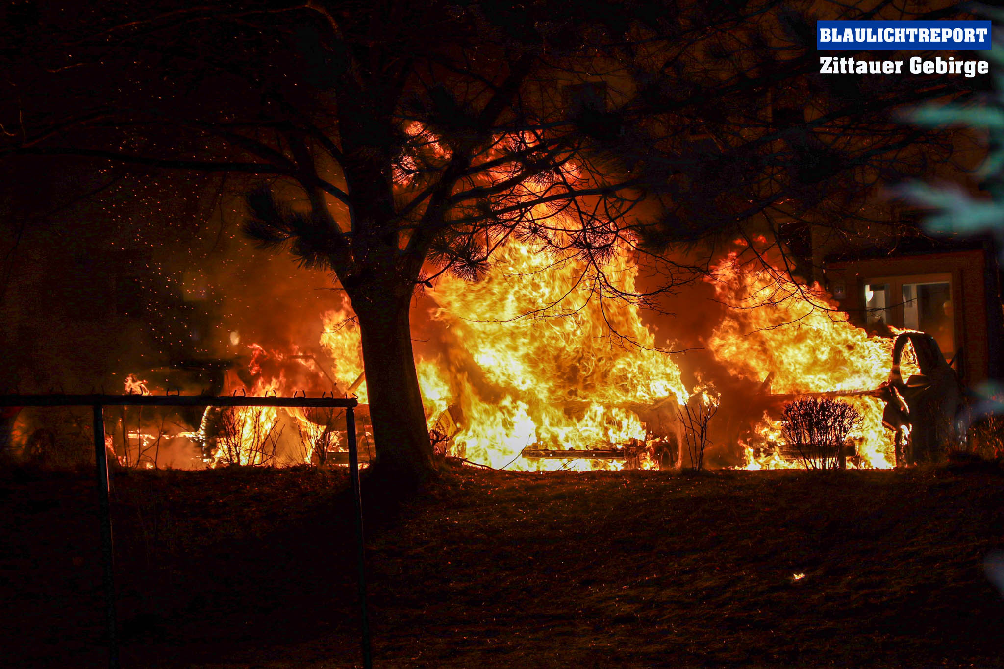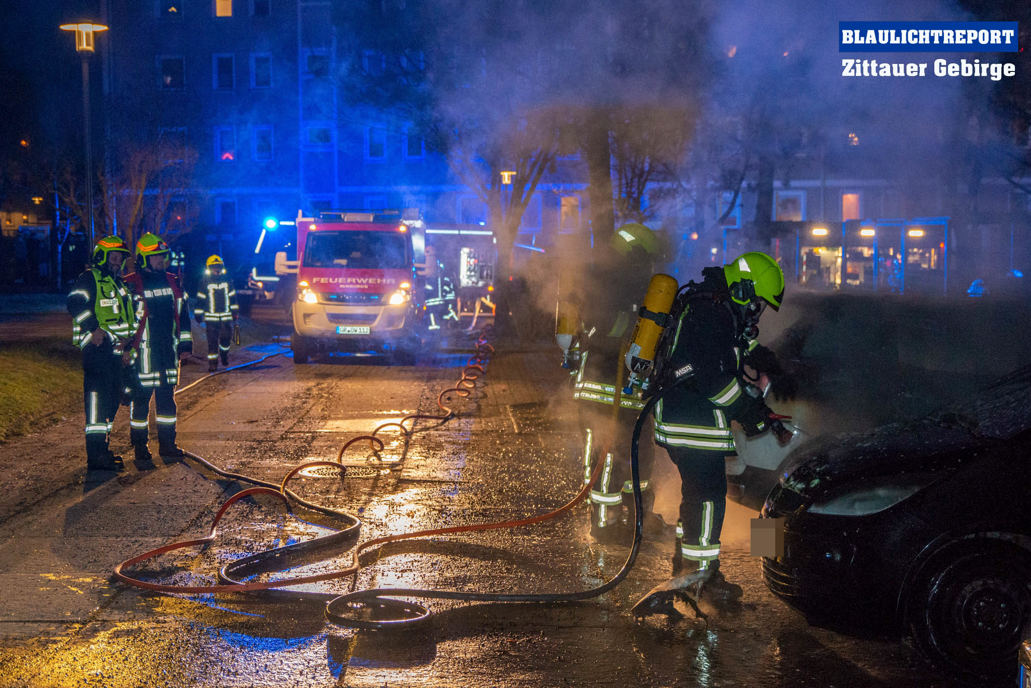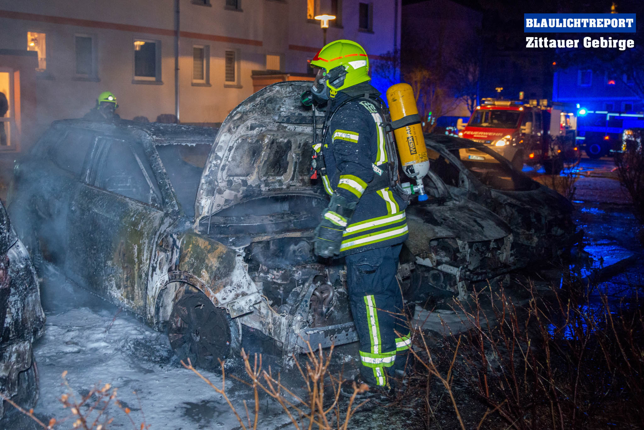 Sie saßen alle in gemütlicher Runde bei der Weihnachtsfeier zusammen, da ging die Sirene. Die Feuerwehrleute aus Großschönau saßen bei ihren Kameraden im tschechischen Varsndorf, als sie kurz nach 19 Uhr zu einem brennenden Pkw in die Buchbergstraße alarmiert wurden. Wenige Minuten später gab es erneut einen Alarm, zu dem auch die Kameraden aus Waltersdorf alarmiert wurden, wie der Pressesprecher des Kreisfeuerwehrverbandes Görlitz mitteilte. Der Brand, der offenbar einen Citroen gelegt wurde, griff auf einen danebenstehenden Hyundai, einen Honda und ein SsangYong über, weshalb eine Stichworterhöhung vorgenommen wurde. Vor Ort eingetroffen, bestätigt die sich die Lage. 4 Fahrzeuge standen in Vollbrand. Unter schwerem Atemschutz wurde unverzüglich die Brandbekämpfung eingeleitet. Das Feuer drohte auf ein fünftes Fahrzeug überzugreifen, was durch das Handeln der Kameraden aber verhindert werden konnte. Nachdem der Brand gelöscht war, wurden die Fahrzeuge mit Schaum geflutet, um ein erneutes Aufflammen zu verhindern. Ein Brandursachenermittler wird sich mit dem Fall befassen. Wie die Polizei mittlerweile mitteilt, hat sie Ermittlungen wegen des Verdachts der Brandstiftung aufgenommen. Es entstand ein Schaden von etwa 50.000€.