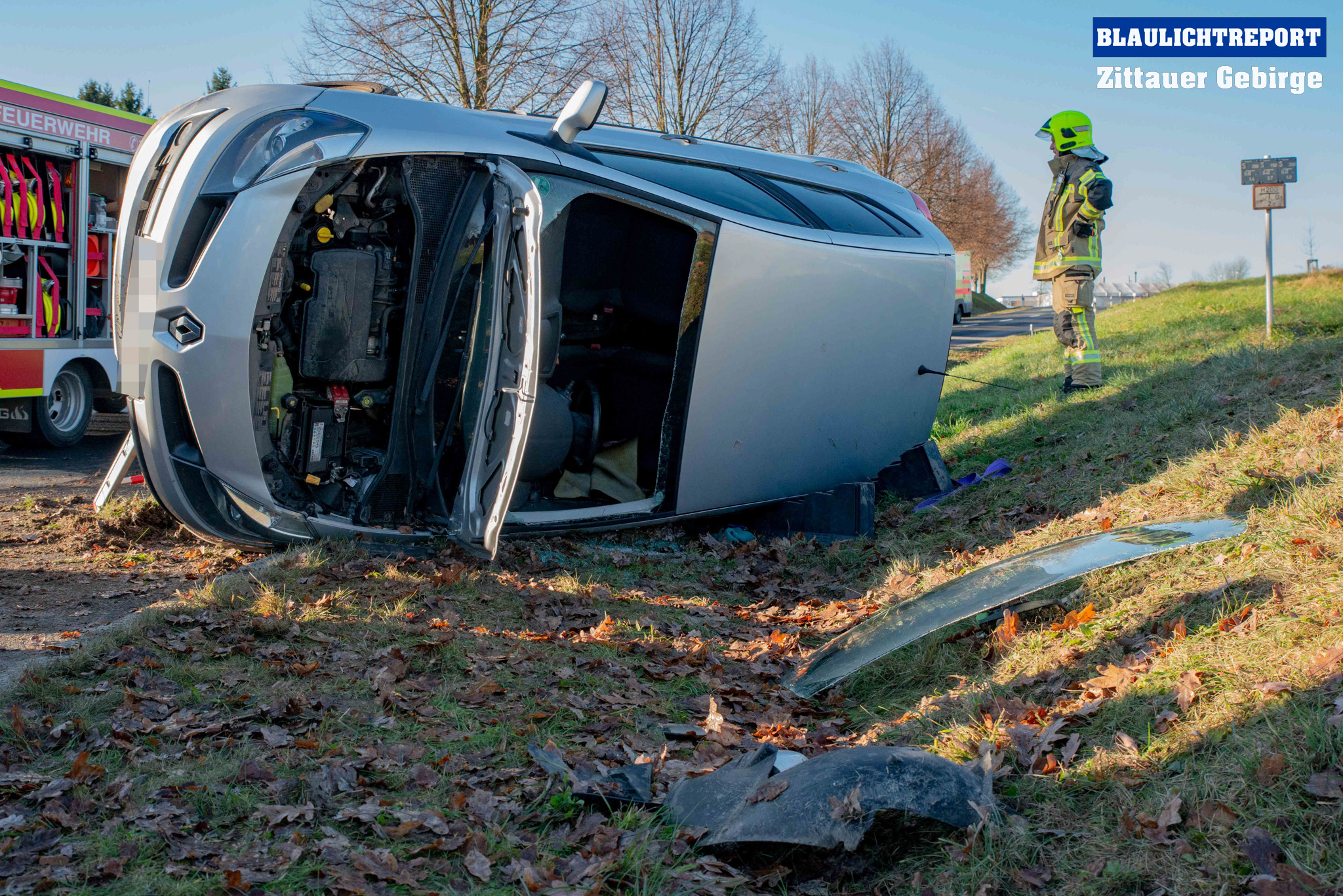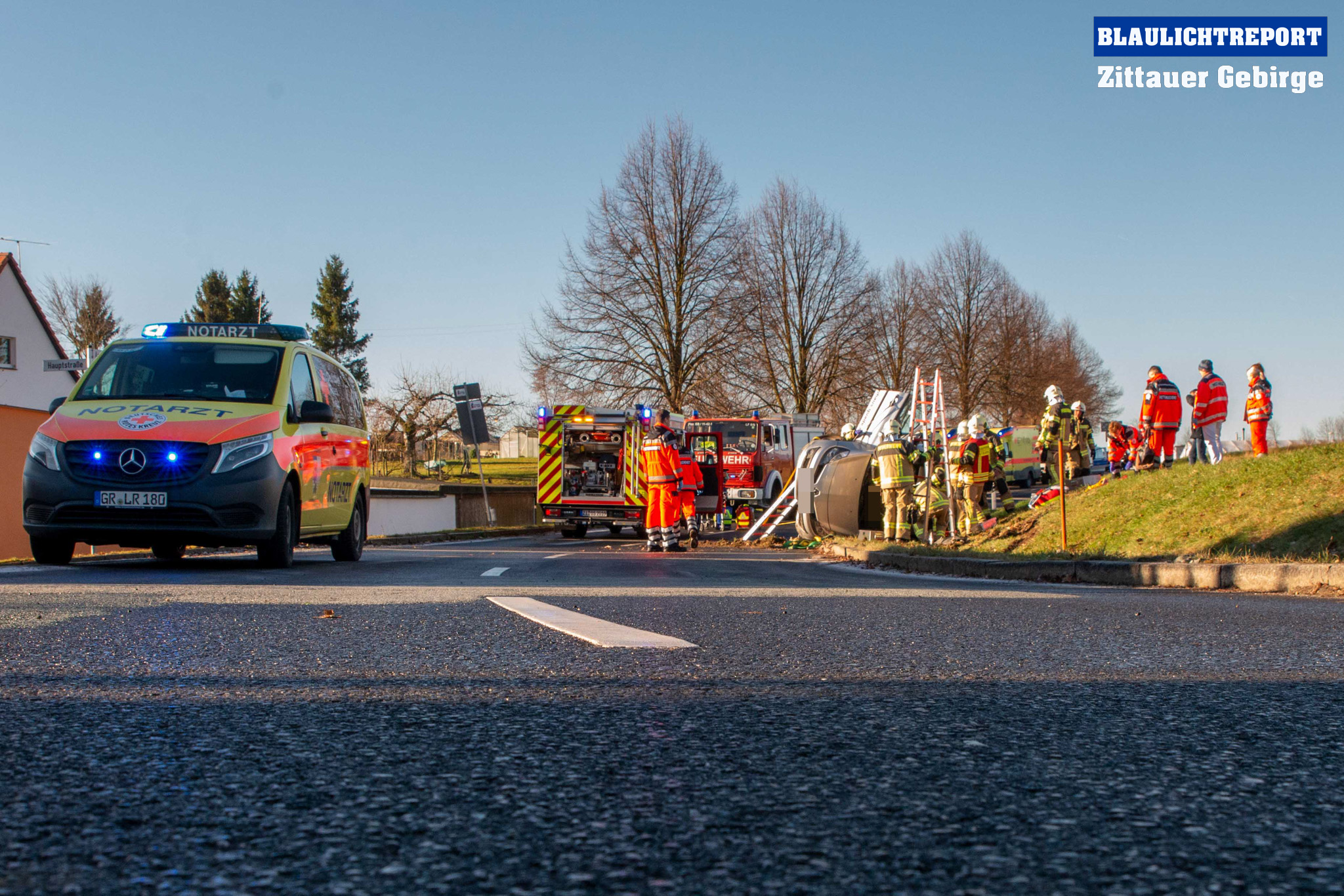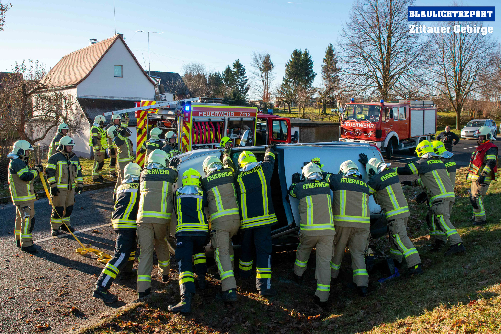 Oberseifersdorf – Am Montagvormittag ist eine Autofahrerin in Oberseifersdorf offenbar bei Glätte von der Fahrbahn abgekommen. Die 48-jährige fuhr gegen 10:20 Uhr auf der Hauptstraße in Richtung Löbauer Straße. In einer Kurve kam sie vermutlich wegen der plötzlichen Reifglätte nach rechts von der Fahrbahn ab. Sie fuhr in der Folge gegen eine steile Böschung und landete mit dem Fahrzeug auf der Seite. Die Fahrerin und ihre 89-jährige Beifahrerin konnten sich nicht aus eigener Kraft aus dem Fahrzeug befreien. Ersthelfer setzten entsprechend der Lage einen Notruf ab. Die Integrierte Rettungsleitstelle Ostsachsen alarmierte deshalb neben dem Rettungsdienst und einem Rettungshubschrauber die komplette Gemeindefeuerwehr Mittelherwigsdorf. Beim Eintreffen der ersten Einsatzkräfte bestätigte sich die Lage. Das Abstützen des verunfallten Autos war neben der Absicherung der Unfallstelle eines der ersten Maßnahmen. Nachdem weitere Kräfte eingetroffen waren und das Auto abgesichert war, entfernten die Kameraden die Frontscheibe, sodass die Insassen durch diese Öffnung aus dem Fahrzeug befreit werden konnten. Anschließend nahm sich der Rettungsdienst der beiden an.