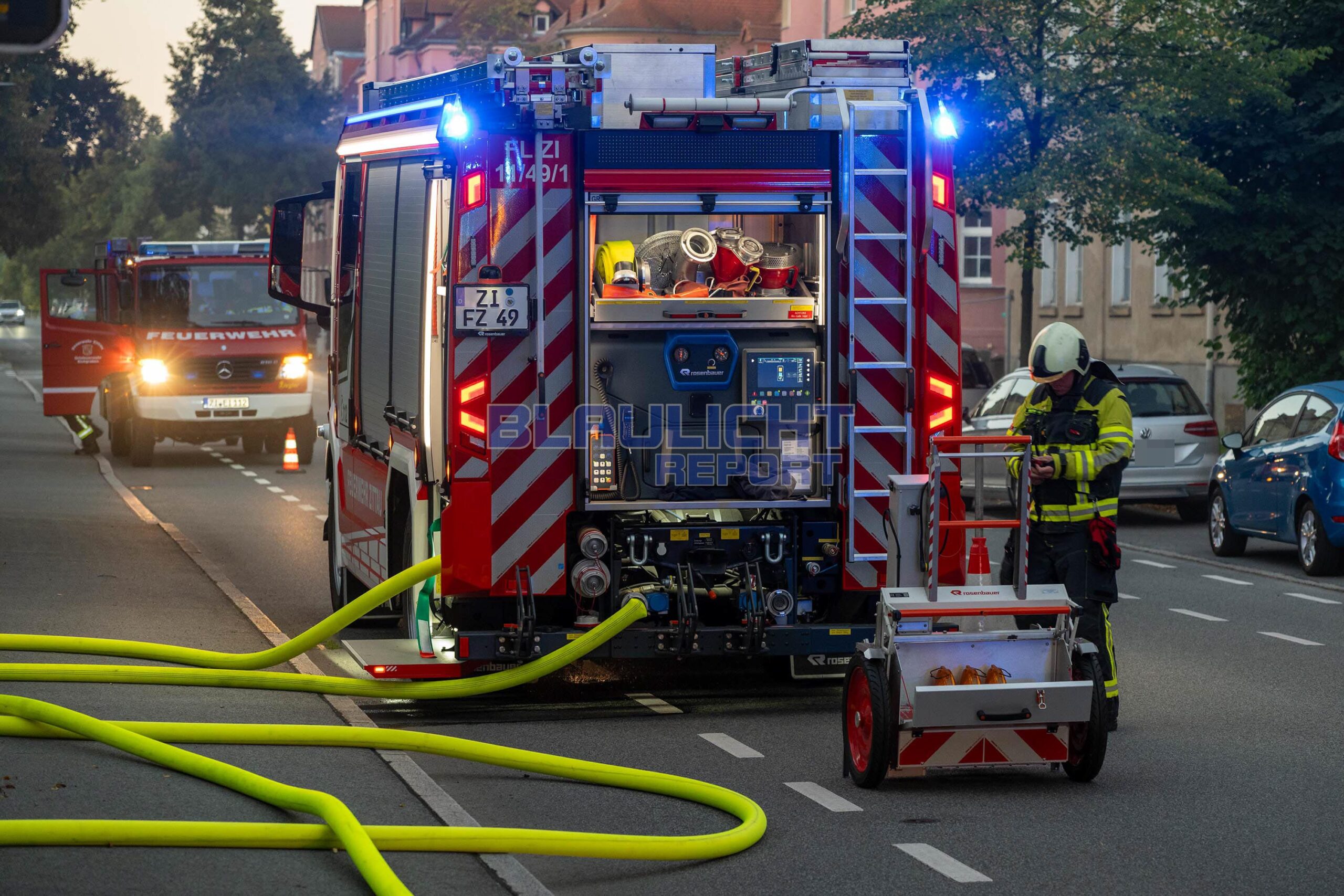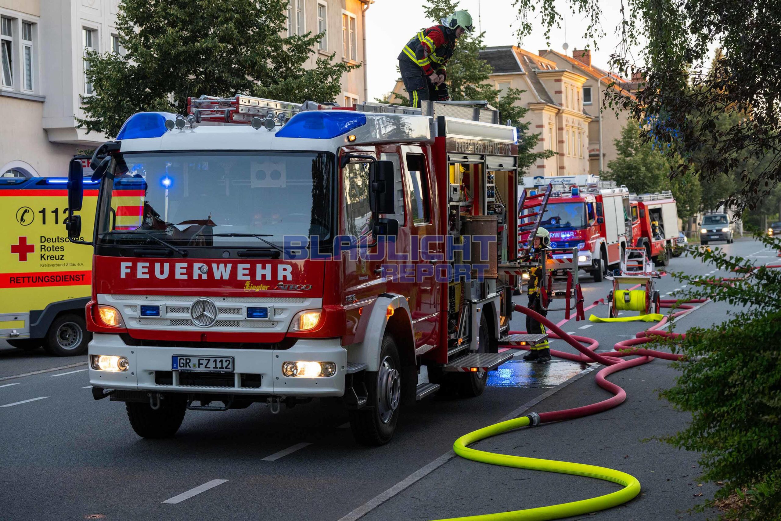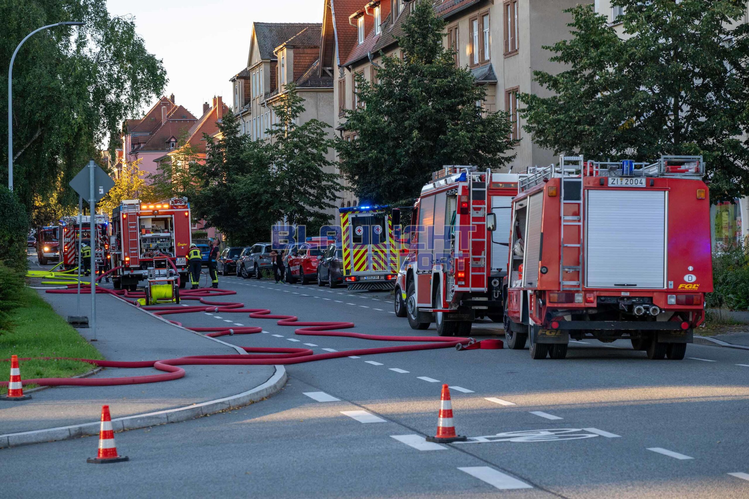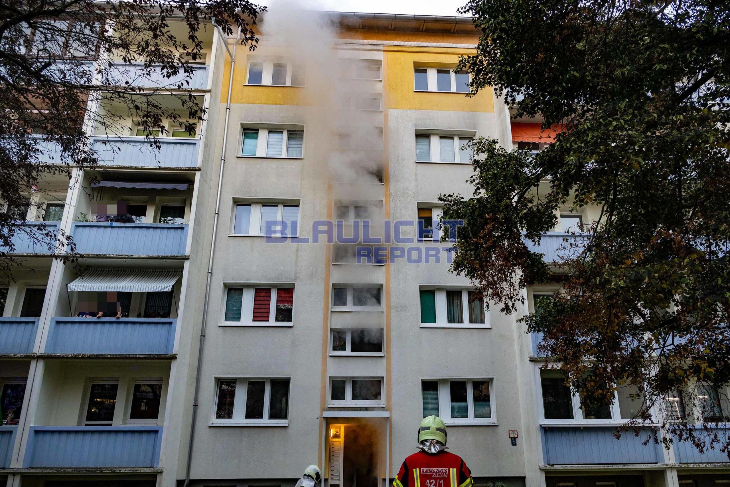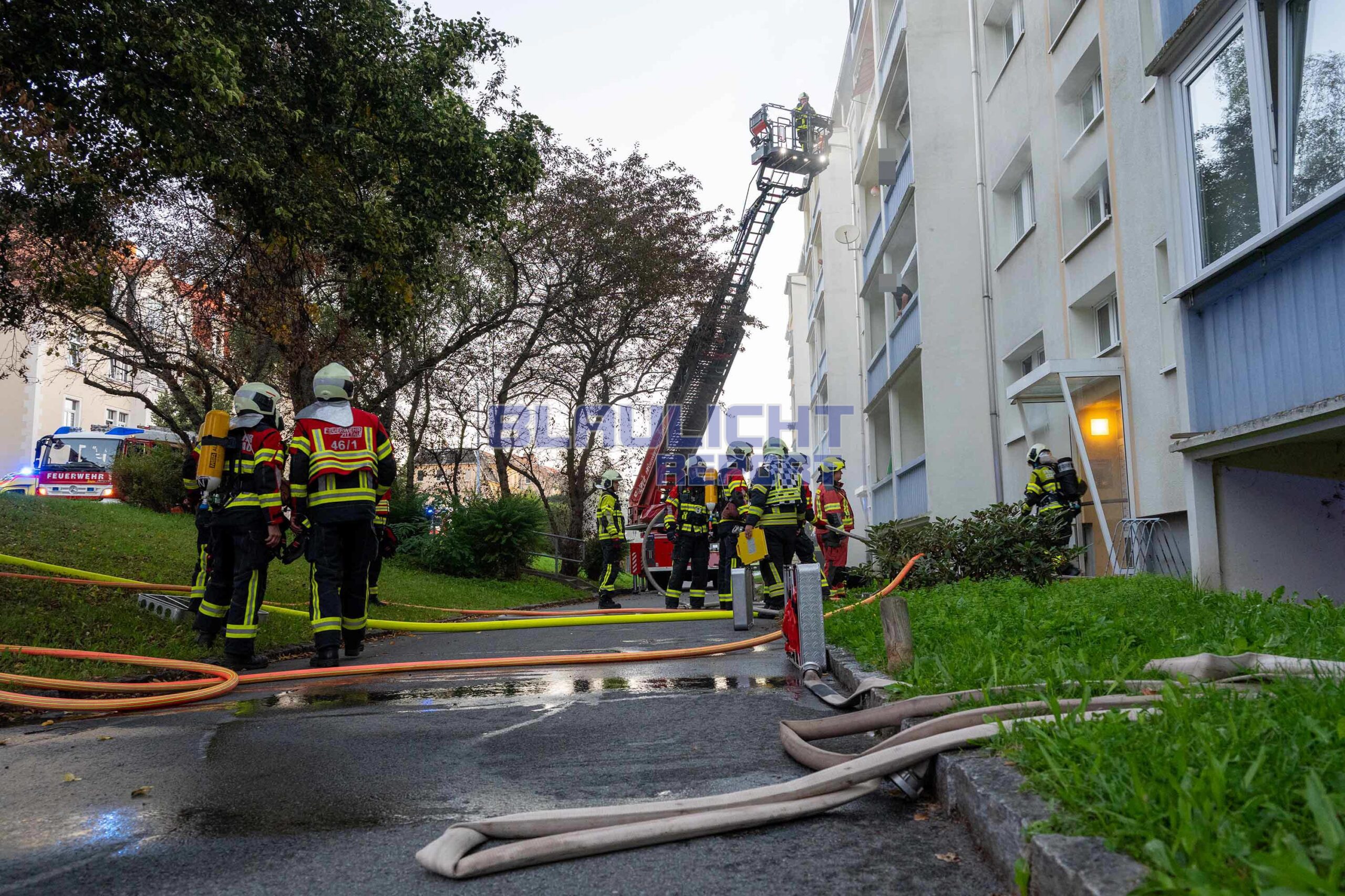 Zittau – Am Donnerstagmorgen gegen 06:00 Uhr kam es zu einem Brandeinsatz für die Feuerwehr in Zittau. Nachdem Anwohner einen Knall wahrnahmen, drang Rauch aus dem Gebäude. Die hauptamtliche Wachbereitschaft der Feuerwehr Zittau, die gerade auf dem Rückweg von einem anderen Einsatz war, konnte auf der Anfahrt schon eine Rauchentwicklung wahrnehmen. Beim Eintreffen bestätigte sich die Lage. Unverzüglich wurden weitere Ortswehren nachalarmiert. Neben der Brandbekämpfung ging es zur Menschenrettung. Da das Treppenhaus verraucht war, wurden die 25 Bewohner, unter denen sich 7 Kinder befanden, über eine Drehleiter und Steckleitern gerettet. Zur Absicherung der Einsatzmaßnahmen und die Sichtung der Bewohner kamen 2 Rettungswagen und der organisatorische Leiter Rettungsdienst zum Einsatz. Nach der Brandbekämpfung wurde das Gebäude belüftet.