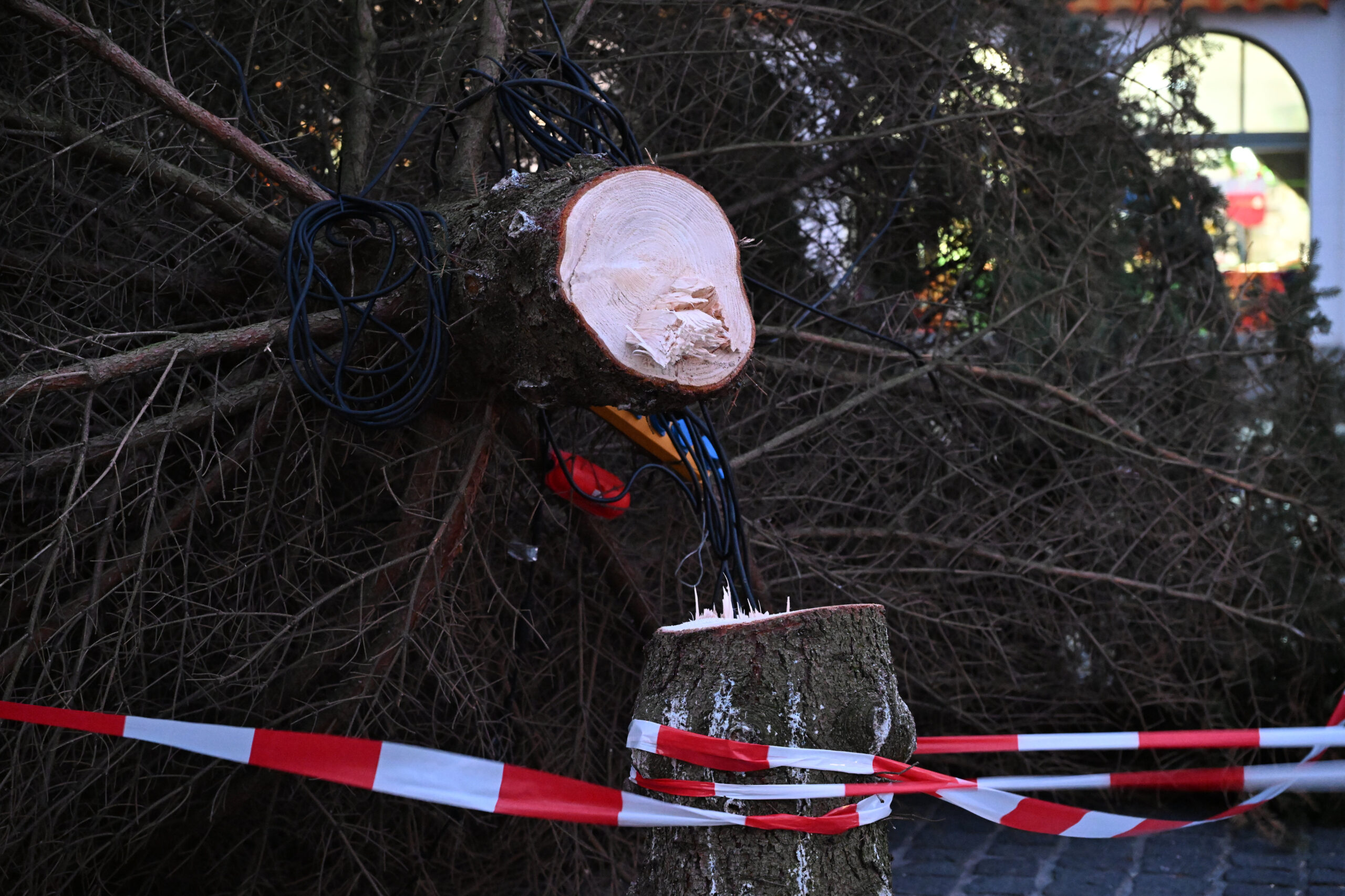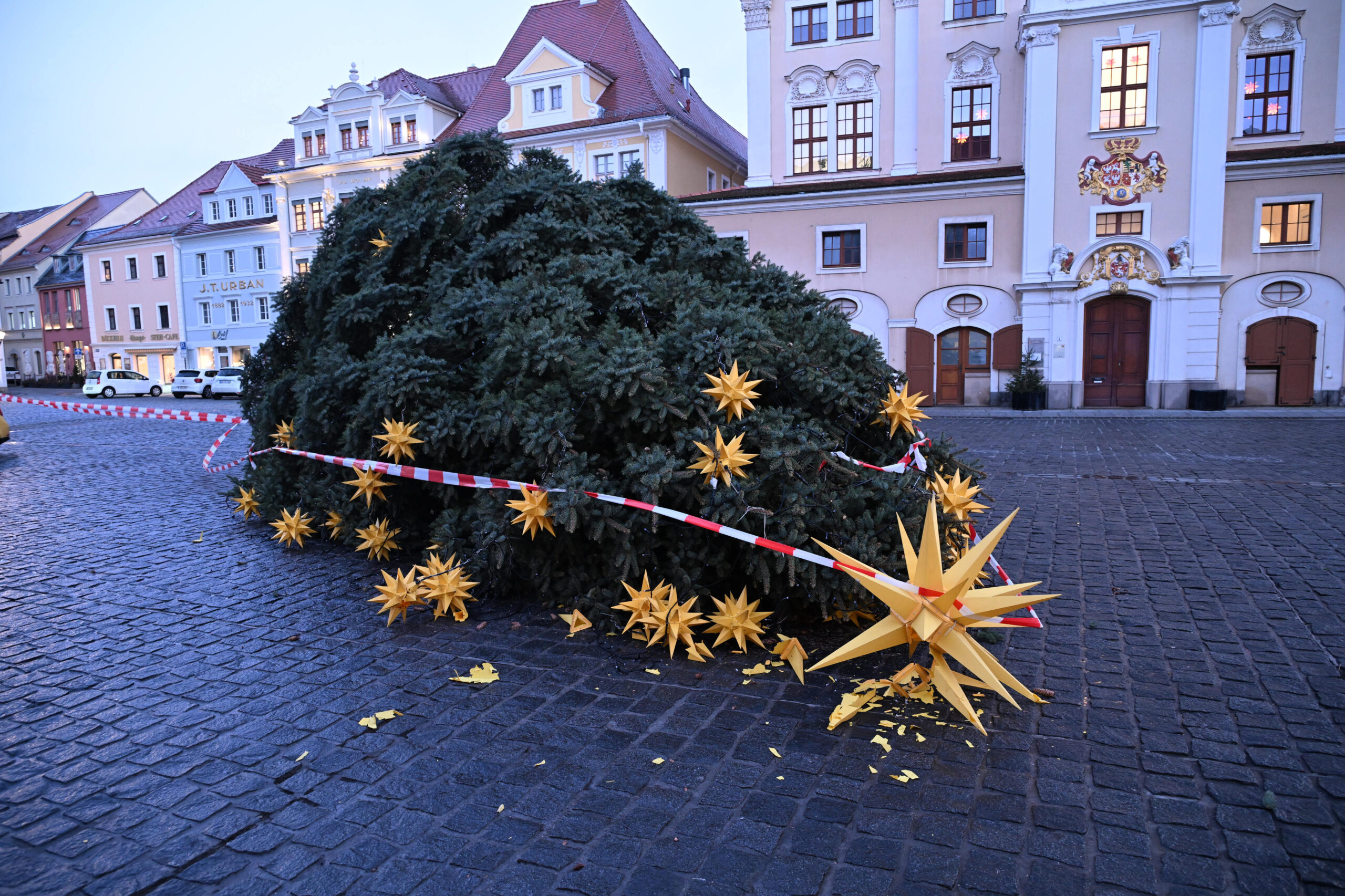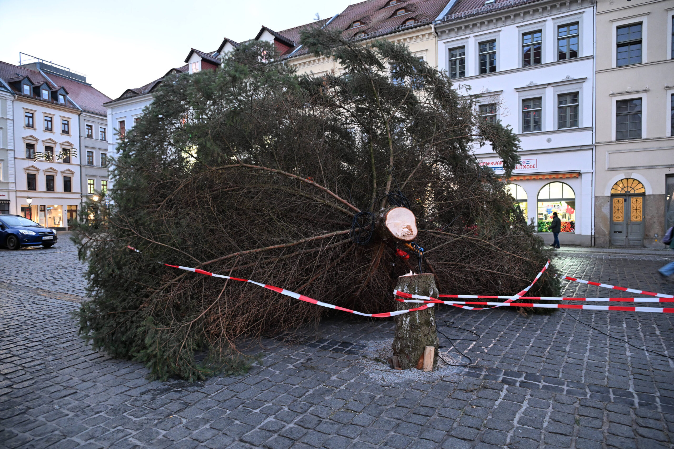 Am Morgen bot sich Passanten ein trauriges Bild: Der festlich geschmückte Baum lag samt kompletter Beleuchtung quer über den Altmarkt – von Weihnachtsstimmung keine Spur mehr.